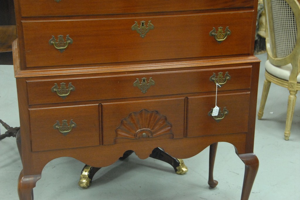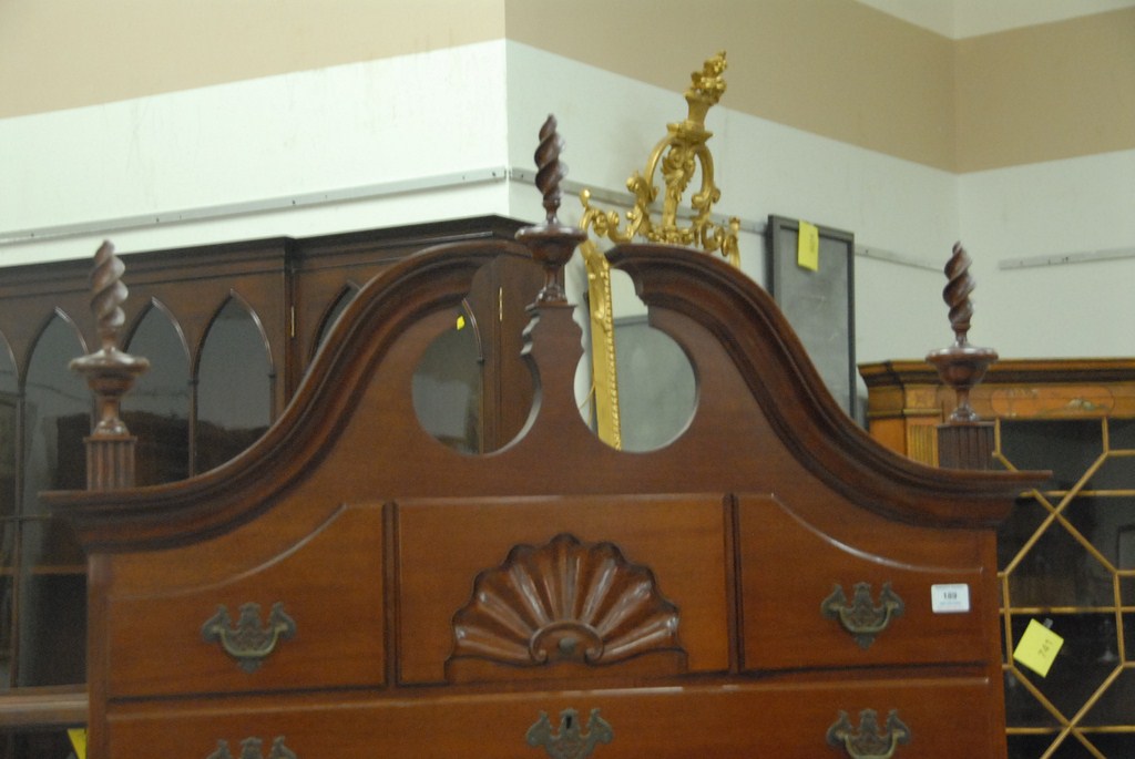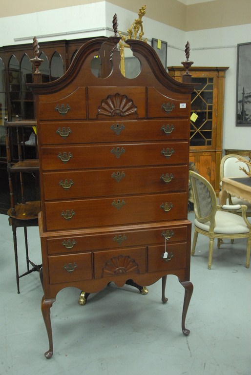 Lot 189: Margolis mahogany Queen Anne style highboy in two parts, upper section with broken arch top, shell carved drawer set on lower sectio…