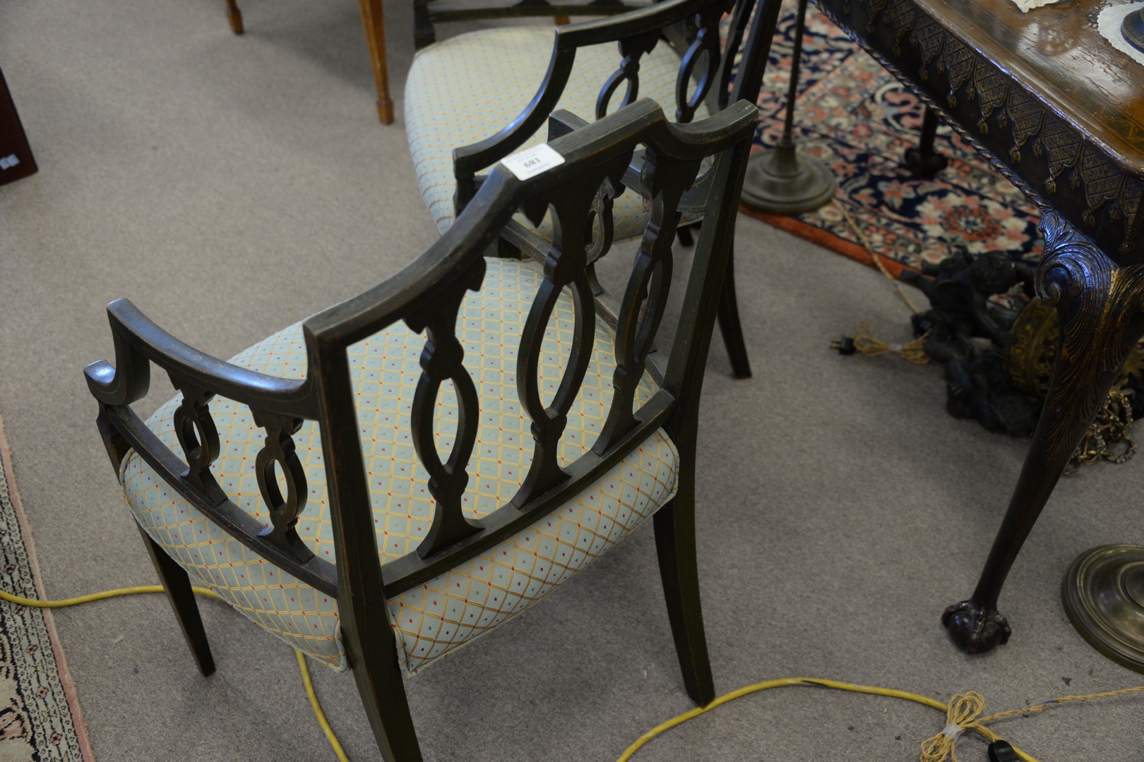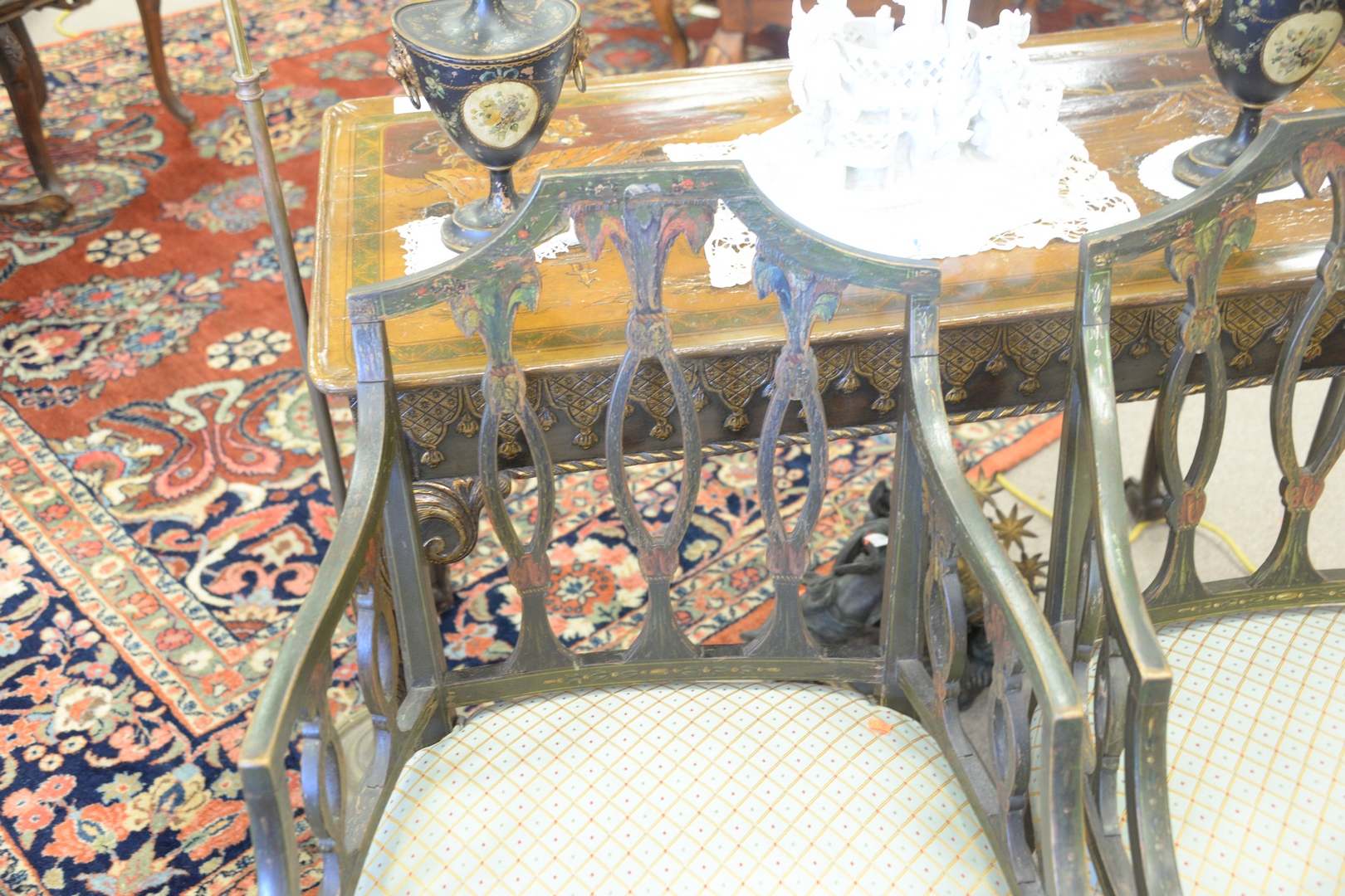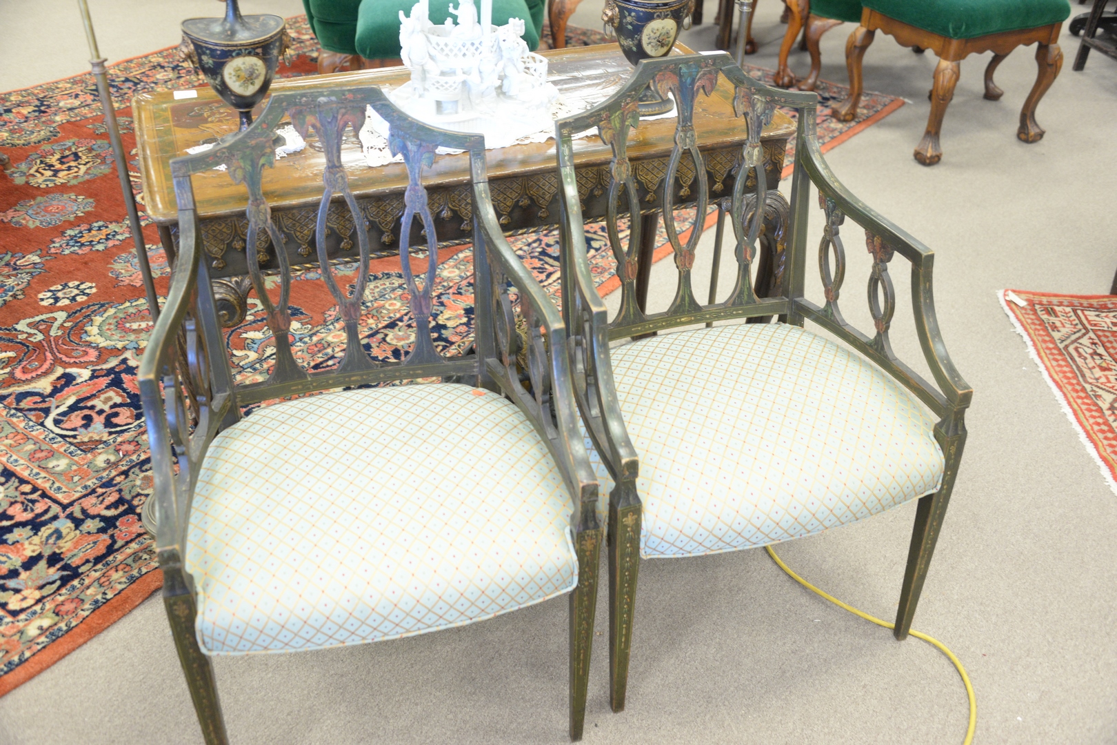 Lot 189: Pair George IV Paint Decorated Arm Chairs, with newly upholstered seats, England, c. 1800, height 35 inches.