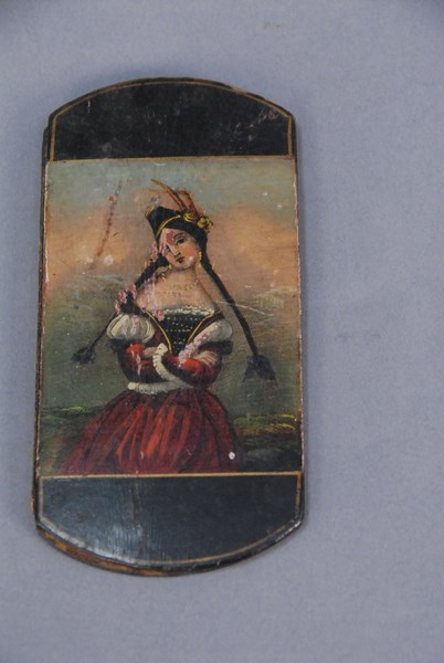 Papier mache eyeglass case with hand painted front and back, 19th century. 5 x 2 3/4.