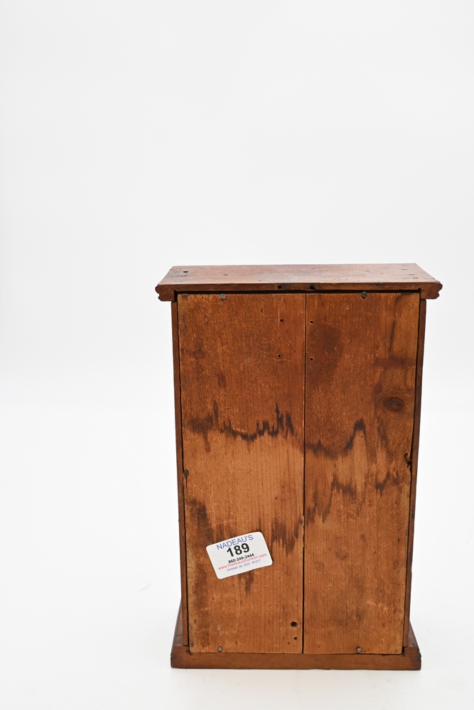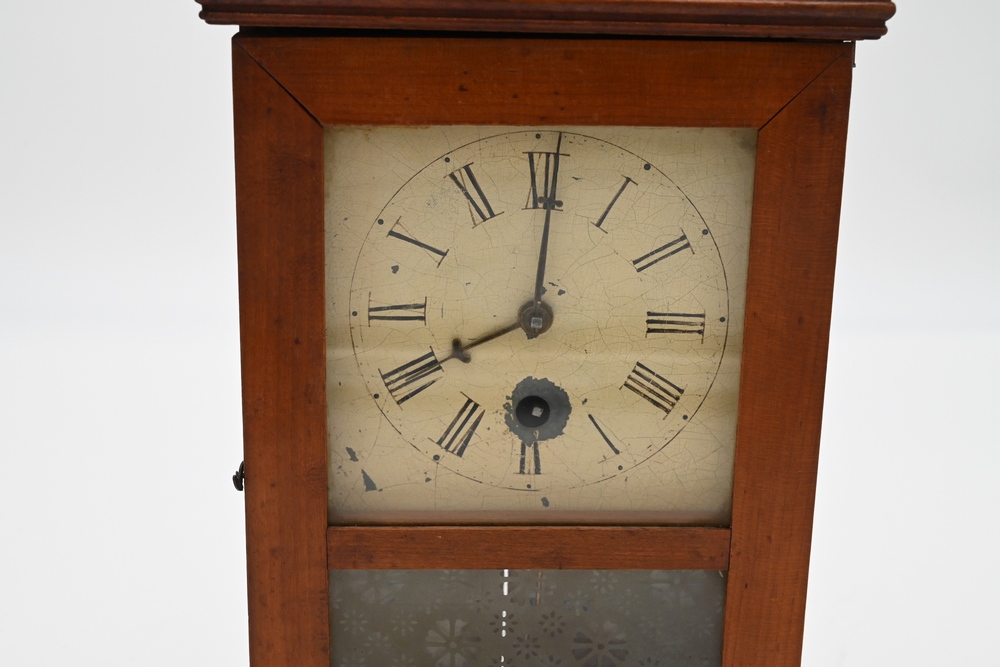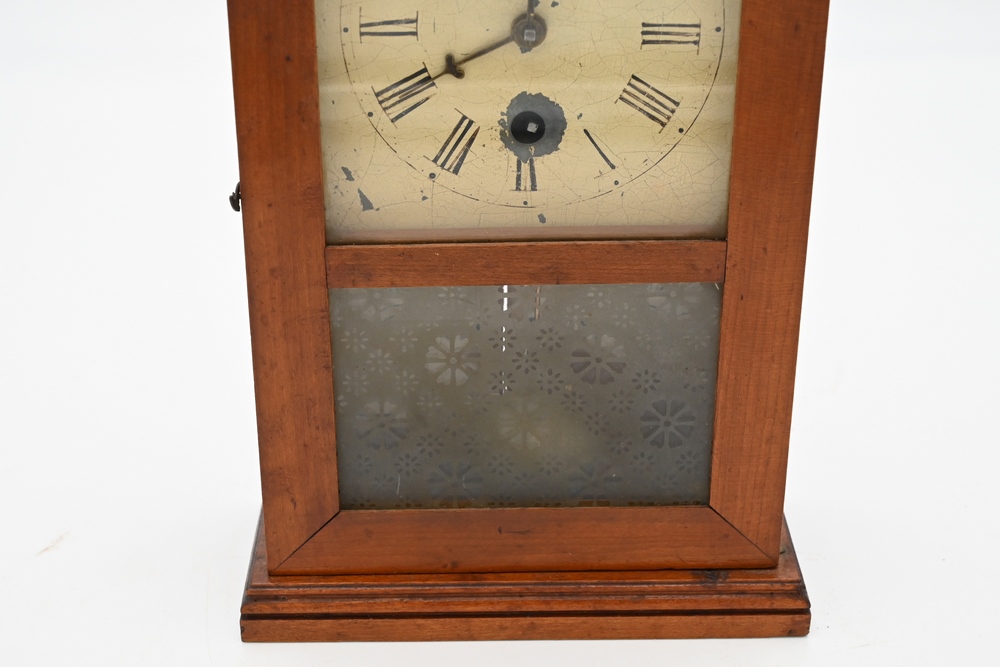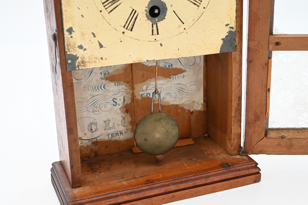 Lot 189: S.B. Terry Miniature Shelf Clock having painted dial and original frosted glass height 10 3/4 inches Provenance: Fifty Year Personal Collection of Clocks and American Antiques from Thomas Bailey, Manchester, Connecticut.