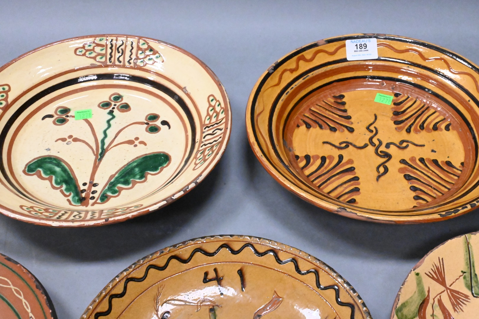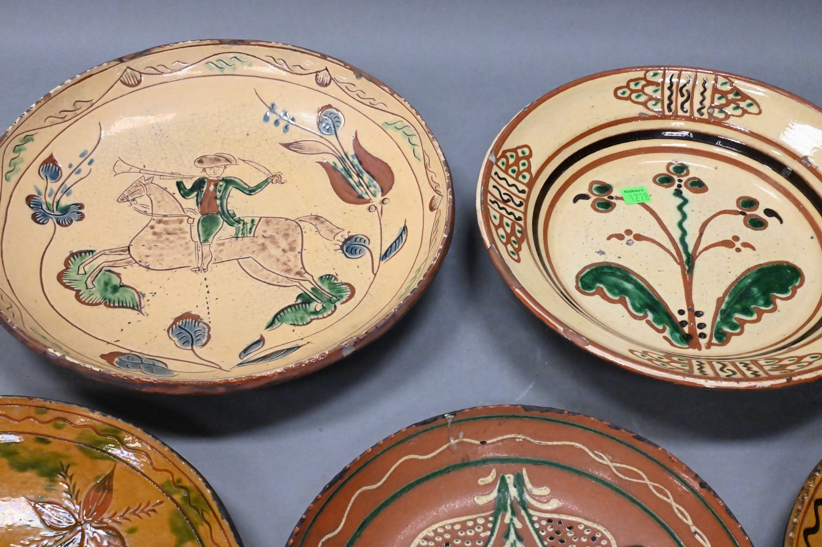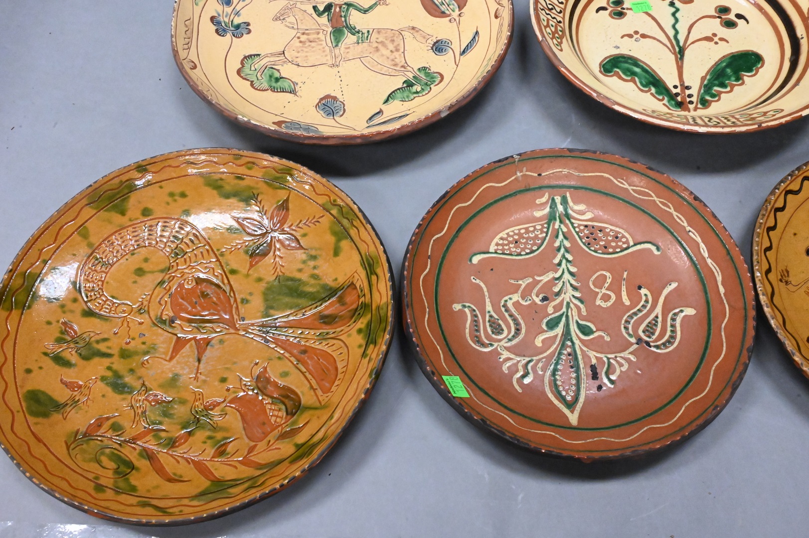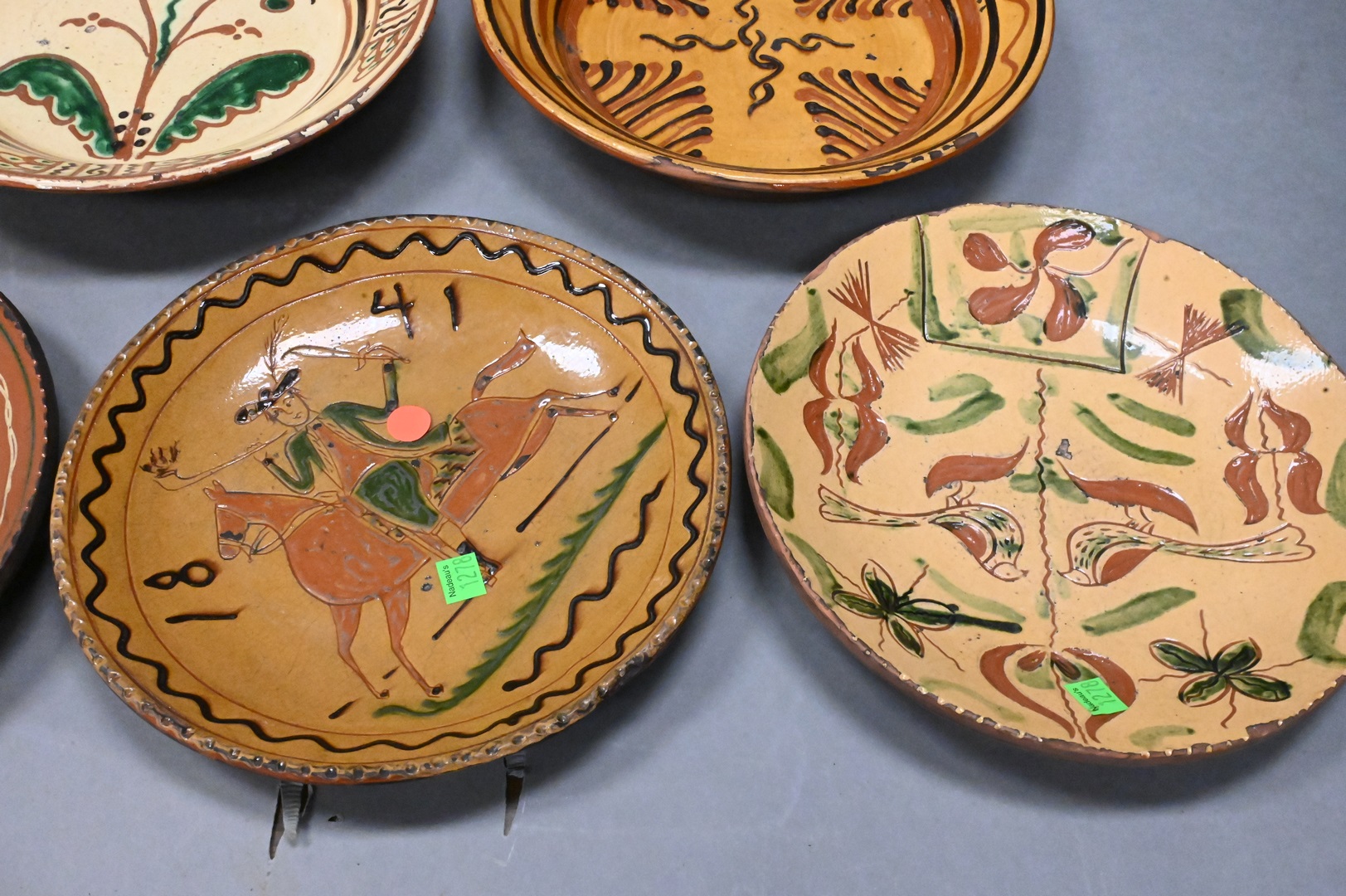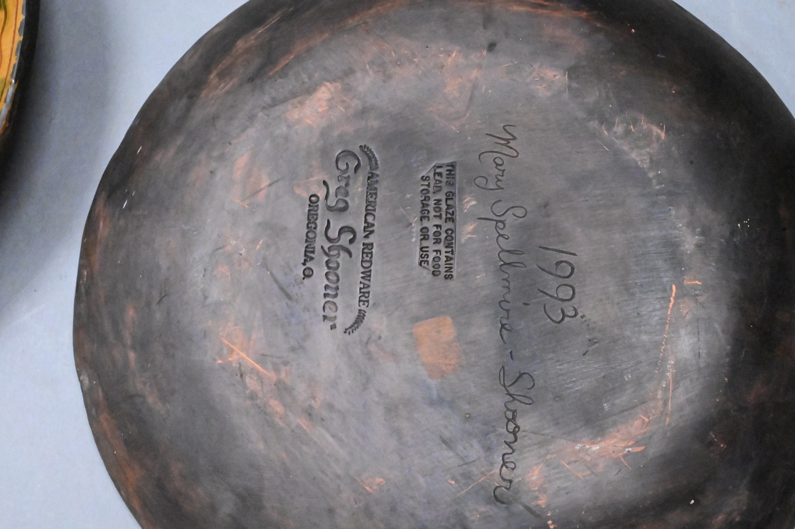 Seven Greg Shooner Redware Pottery Pieces, to include large chargers and bowls, all painted in Early American manner, all signed on the bottom. Provenance: Estate of Peter Tillou, Litchfield, Connecticut.