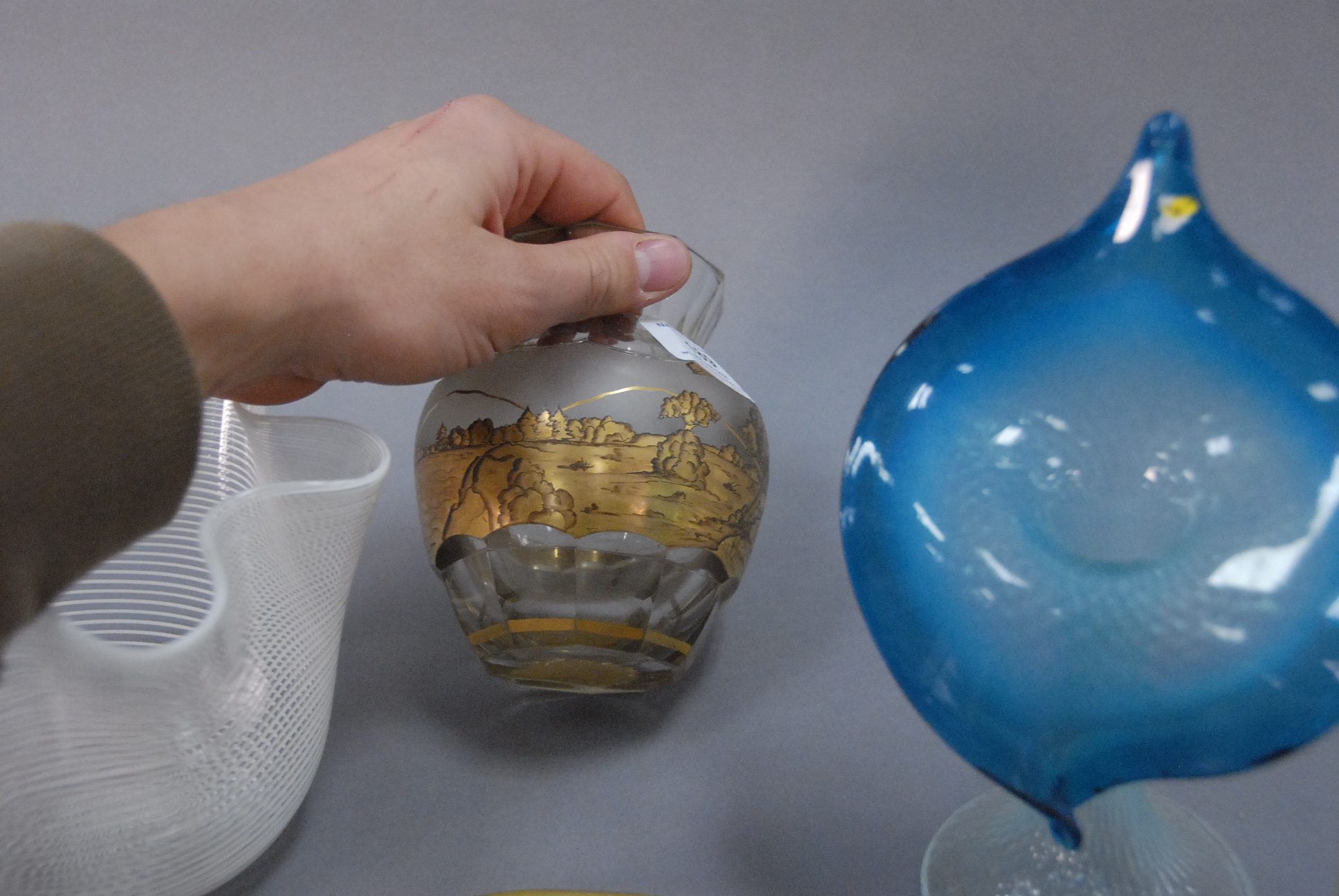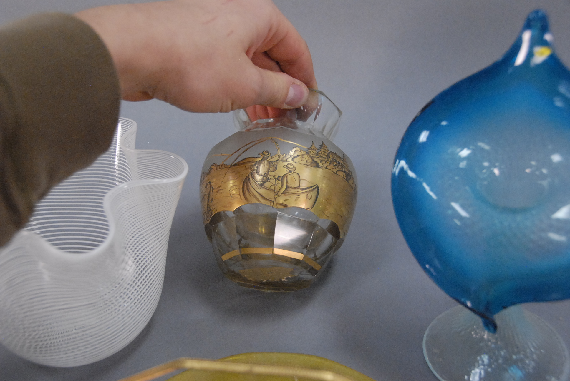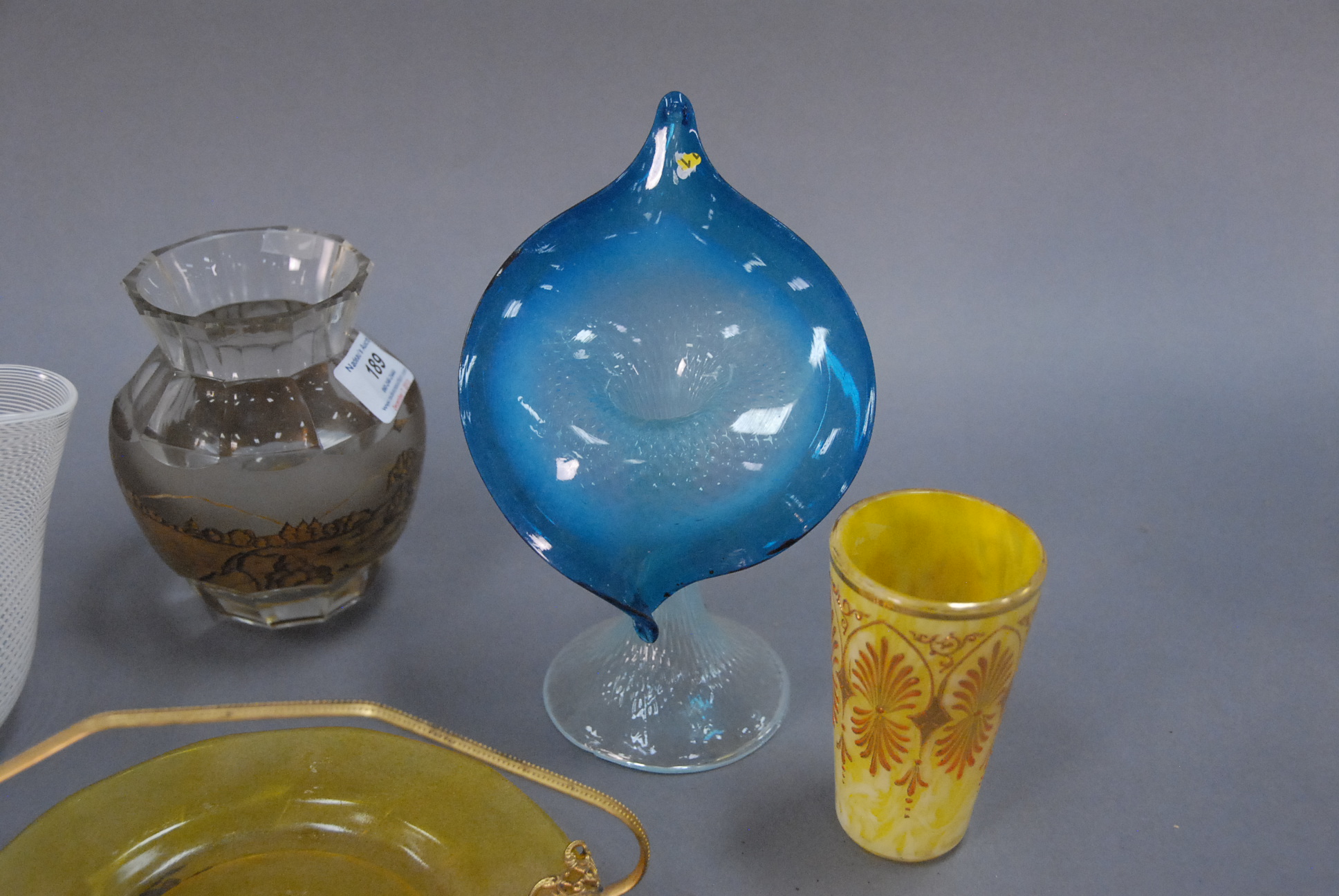 Lot 189: Six piece lot including Jack in pulpit vase, Heisey yellow plate, crystal vase, satin glass, and art glass.