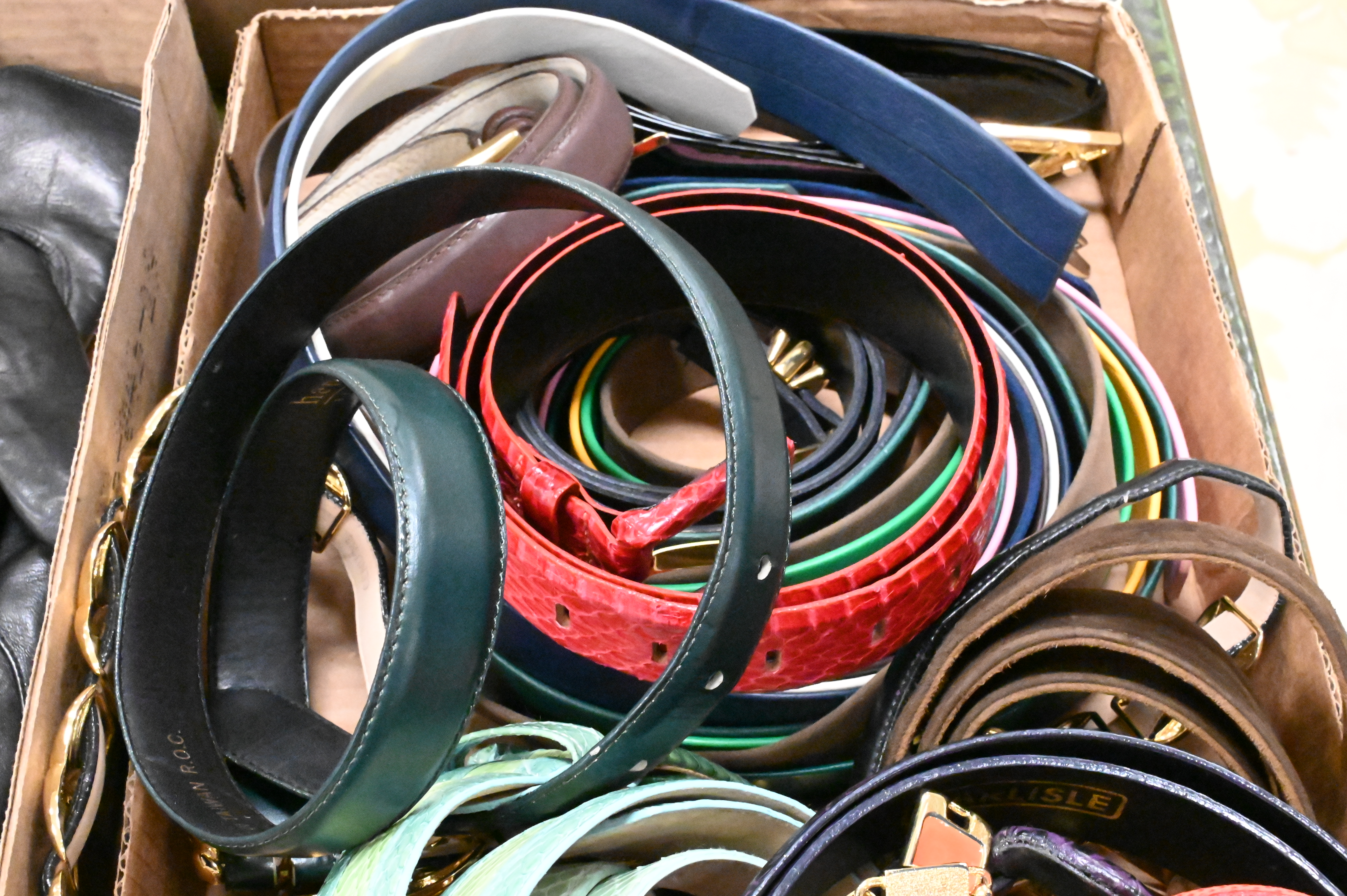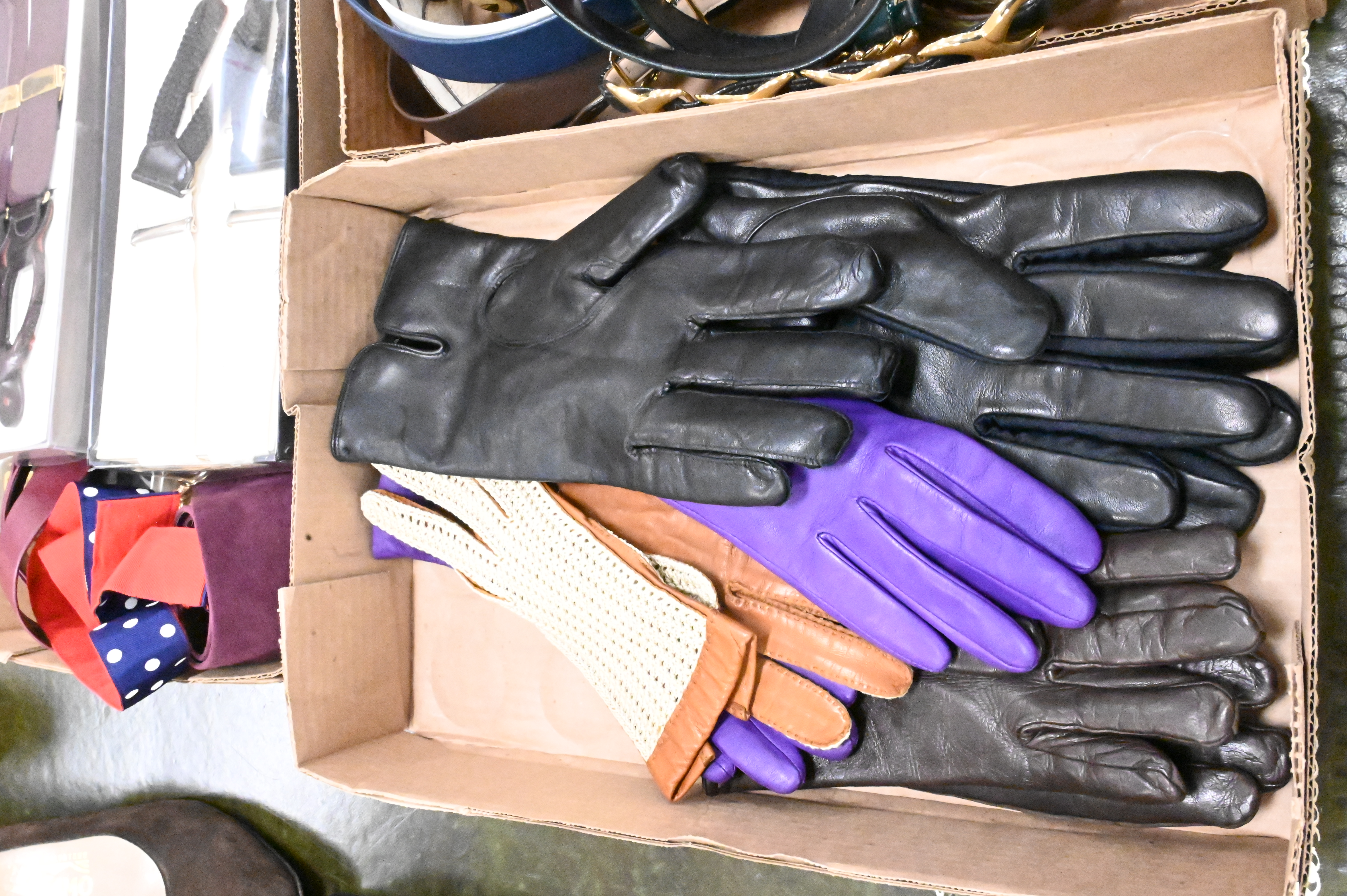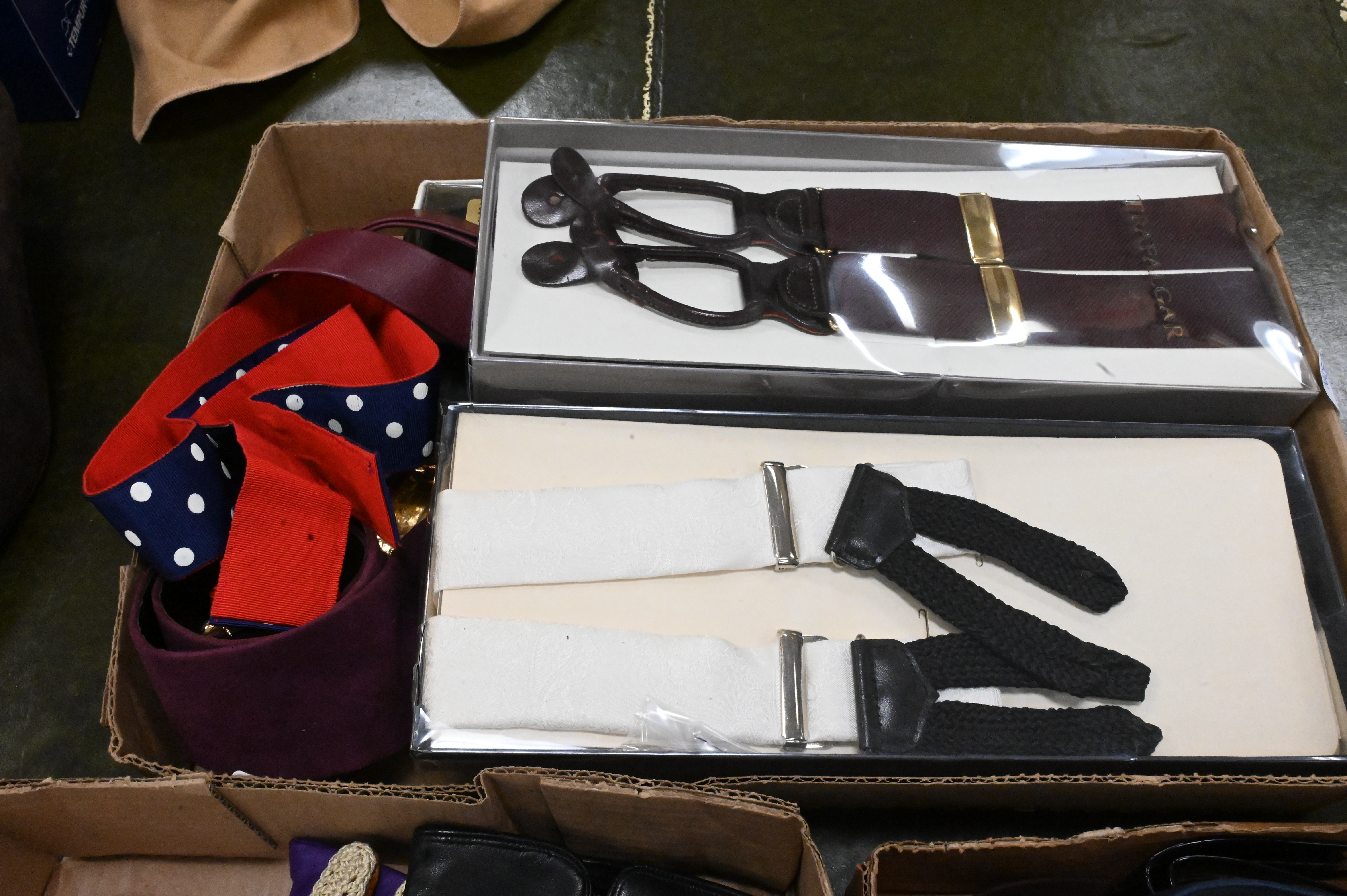 Three Box Lots of Gloves and Belts, to include Harve Benard, Carlisle, suspenders, Nordstrom, Ned Allyn, etc.
