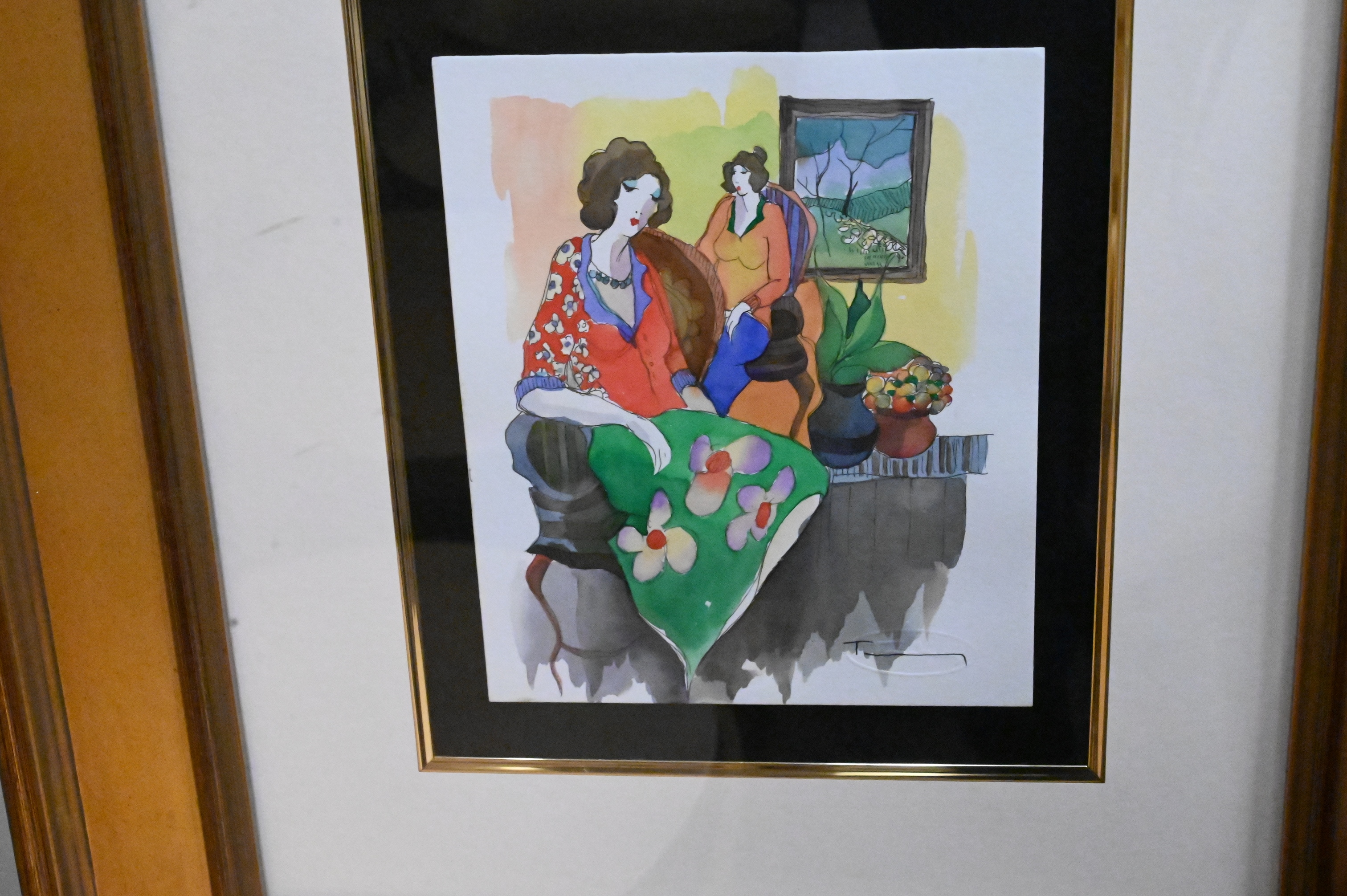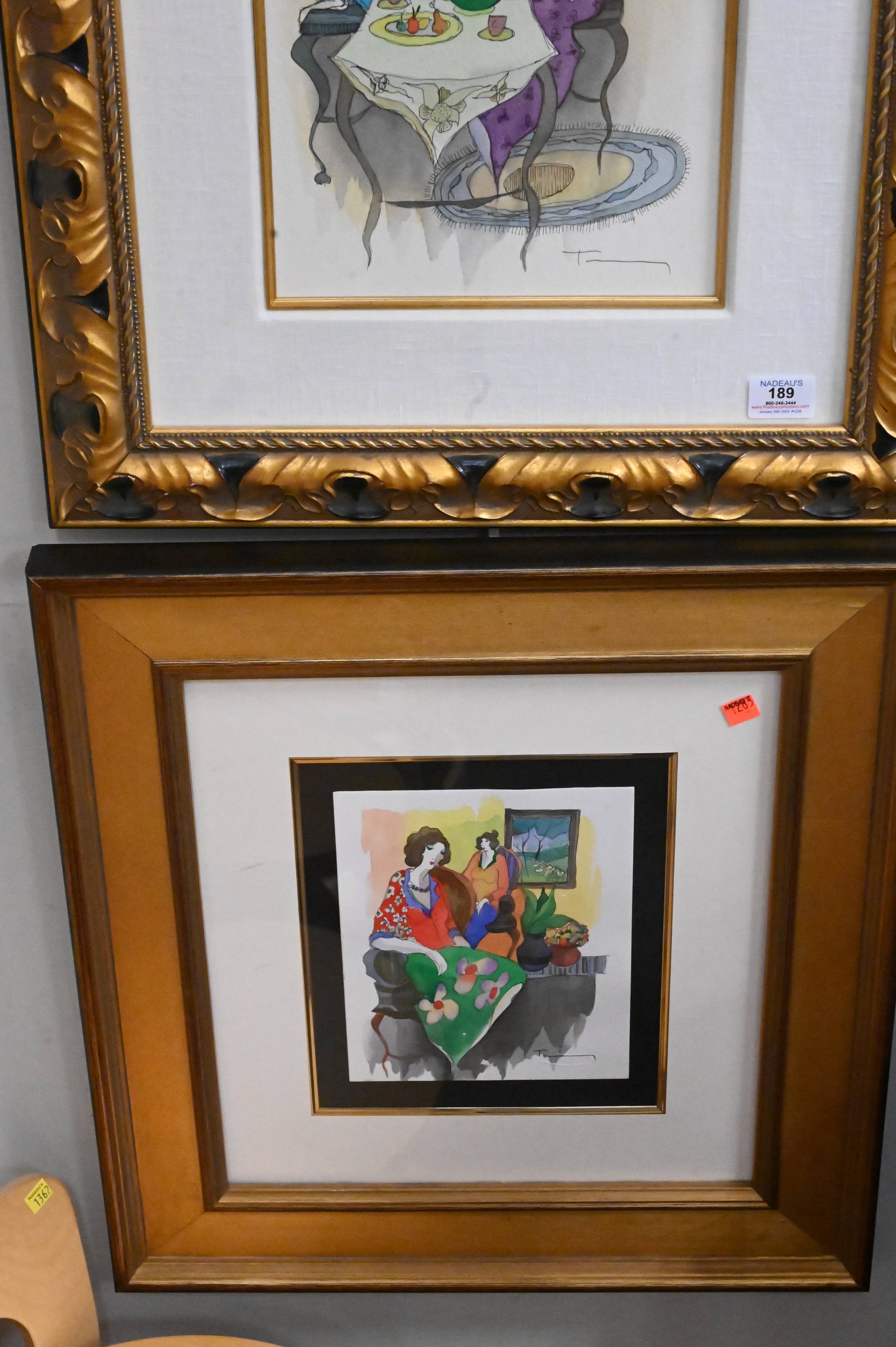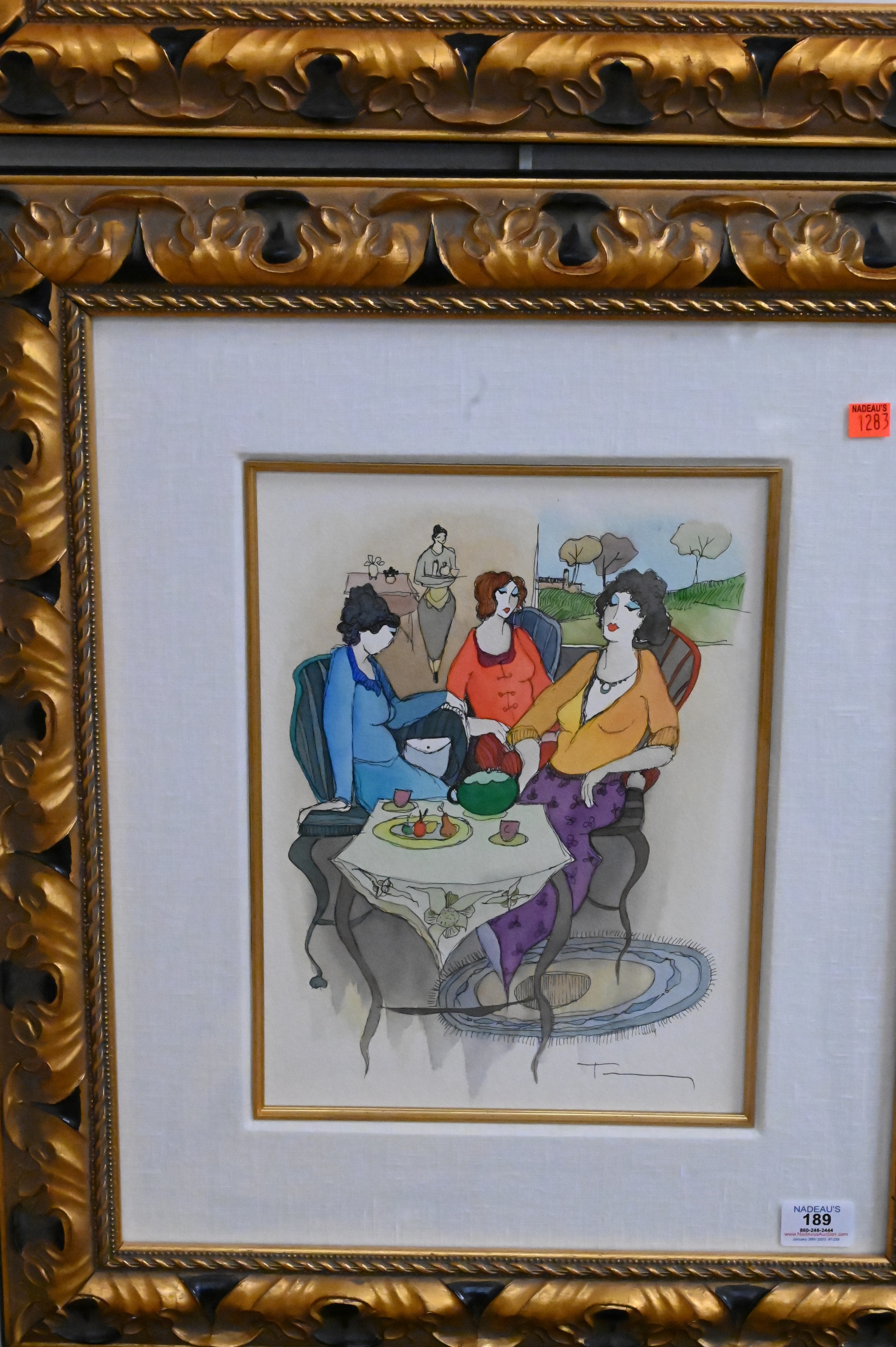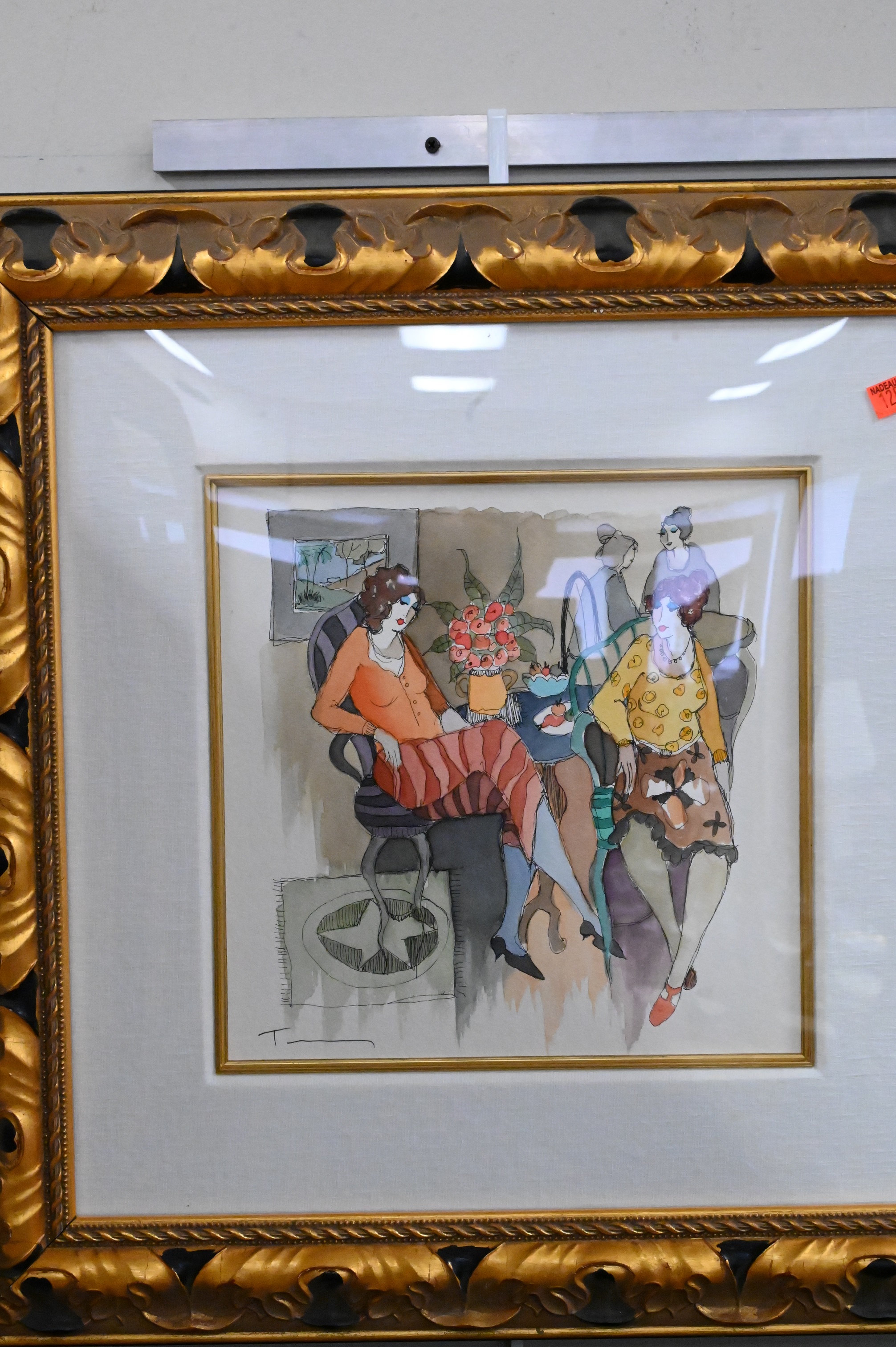 Three Itzchak Tarkay, watercolor and mixed media, “In Conversation”, “Ladies in Cafe”, untitled ladies sitting, signed lower right Tarkay, one having estate stamp and Bruria Tarkay signature, largest 13″ x 10″.