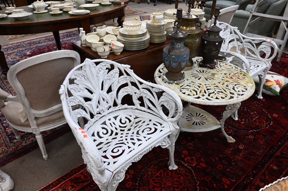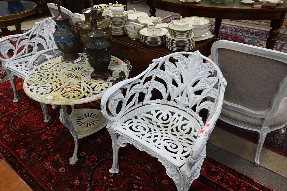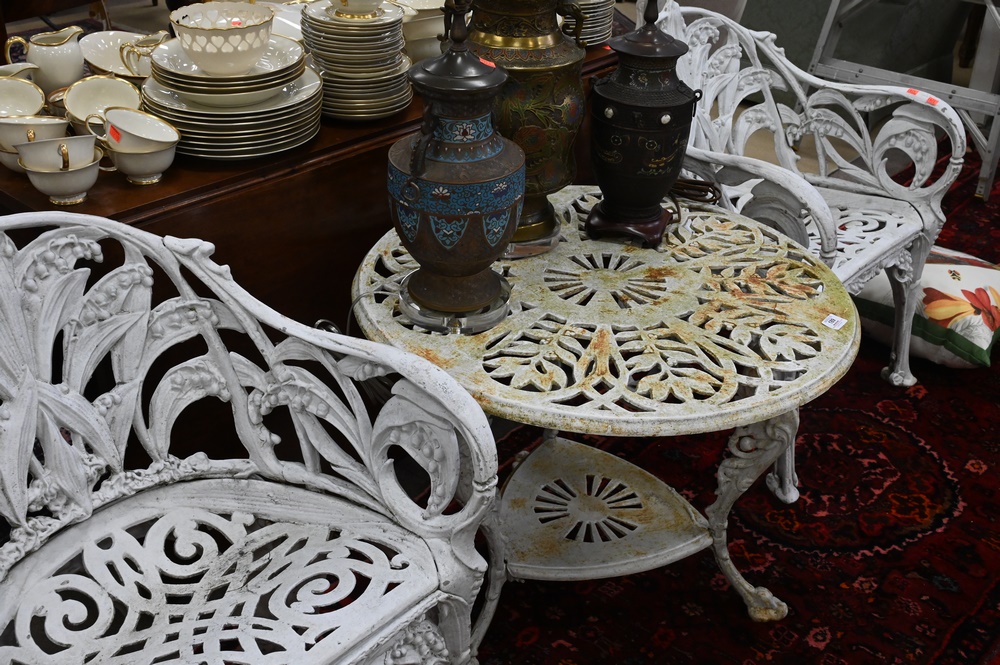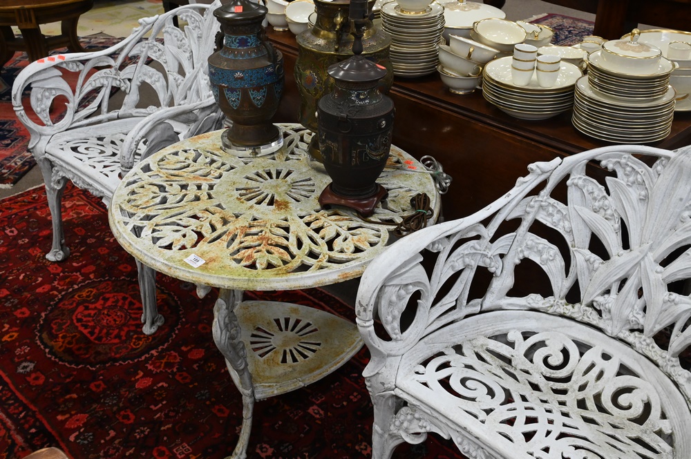 Three Piece Outdoor Lot, to include two metal outdoor chairs, along with a round metal table, depth 29 inches, height 22 inches.