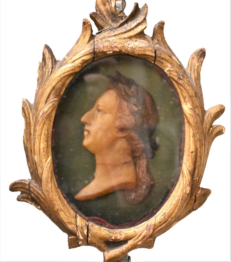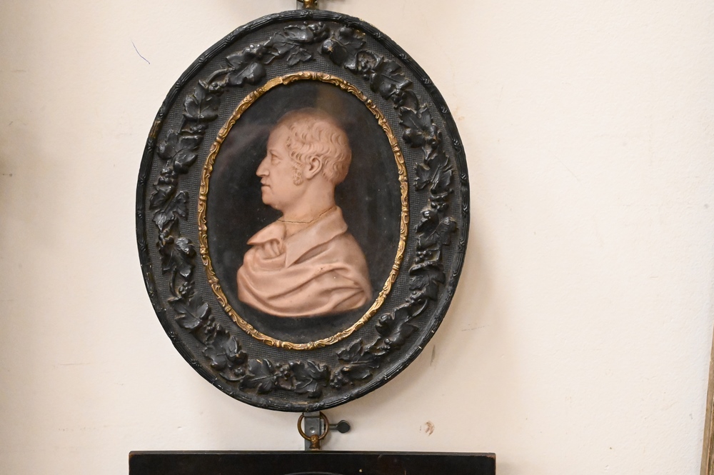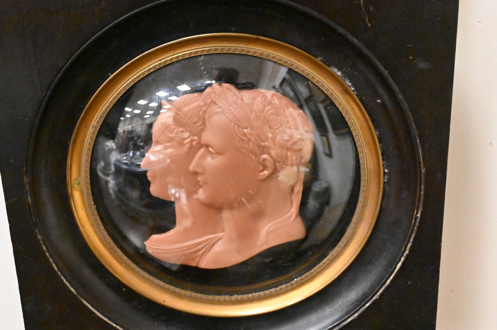 Lot 189: Three Wax Relief Portrait Plaques, to include a double portrait signed illegibly, diameter 6 inches; along with a Cartl Hettler classical bust of Ludwig Von Bayern, 4 3/4″ x 3″, signed C. Hettler, 1818.