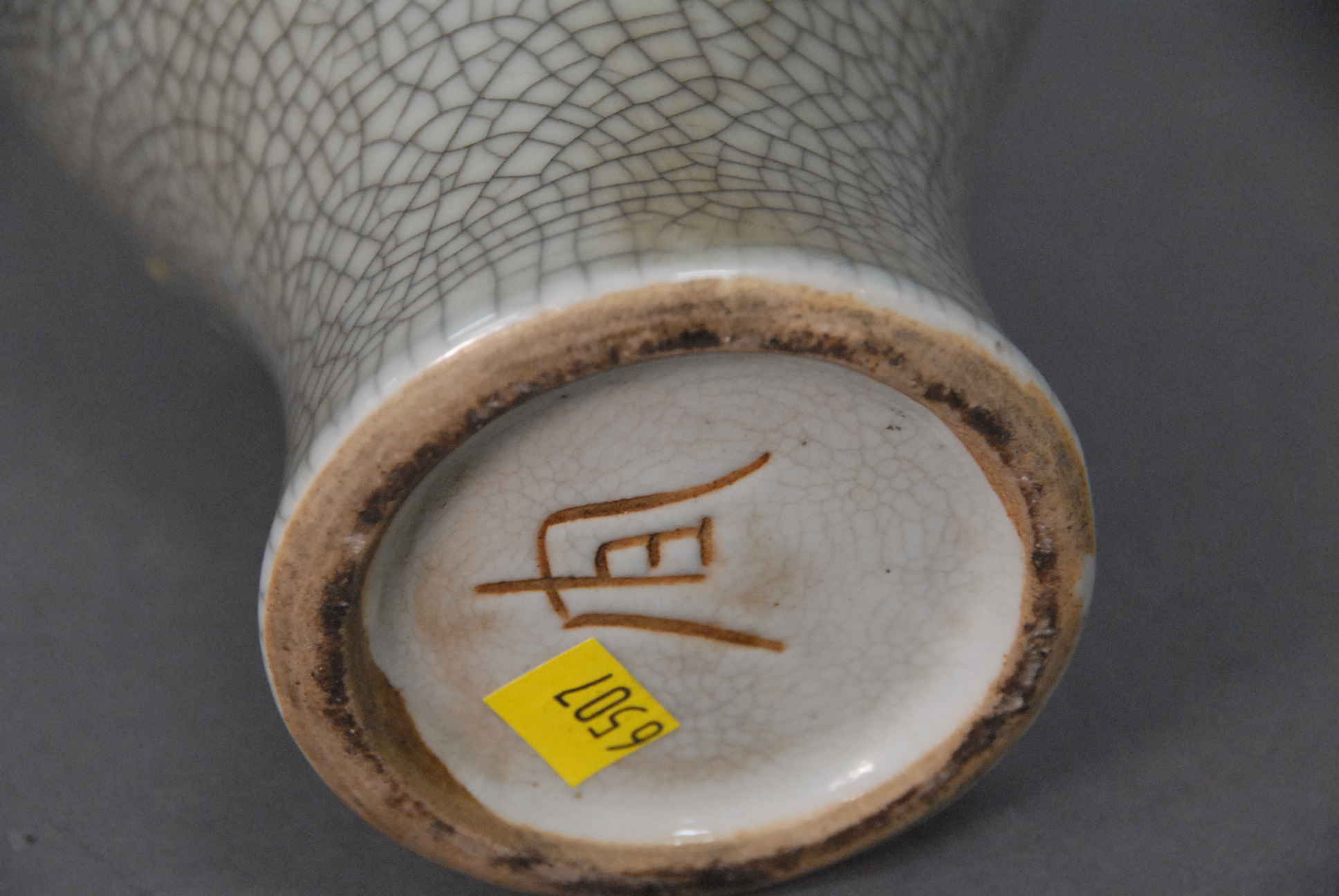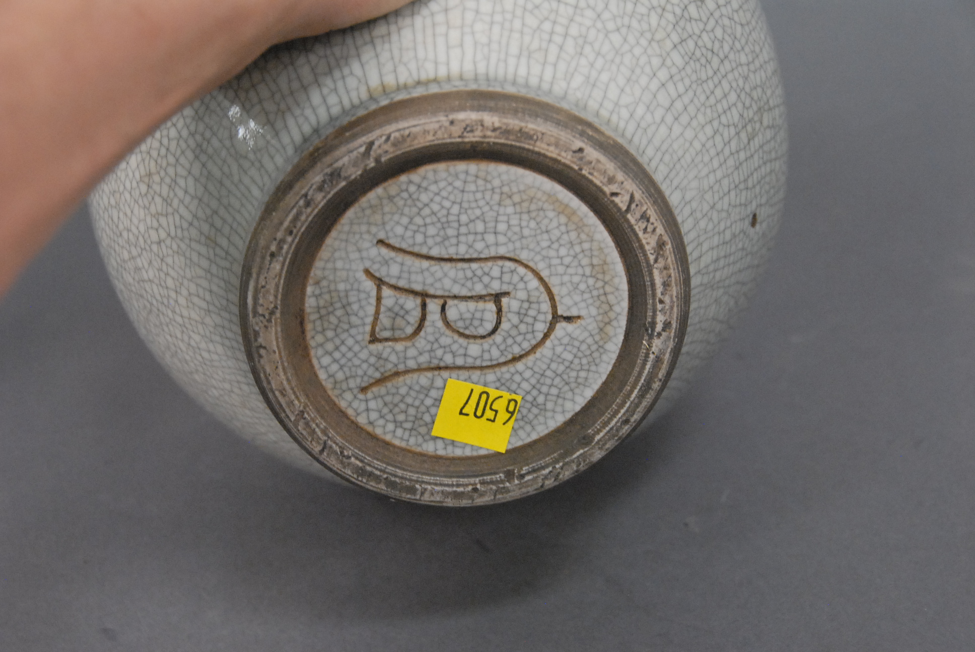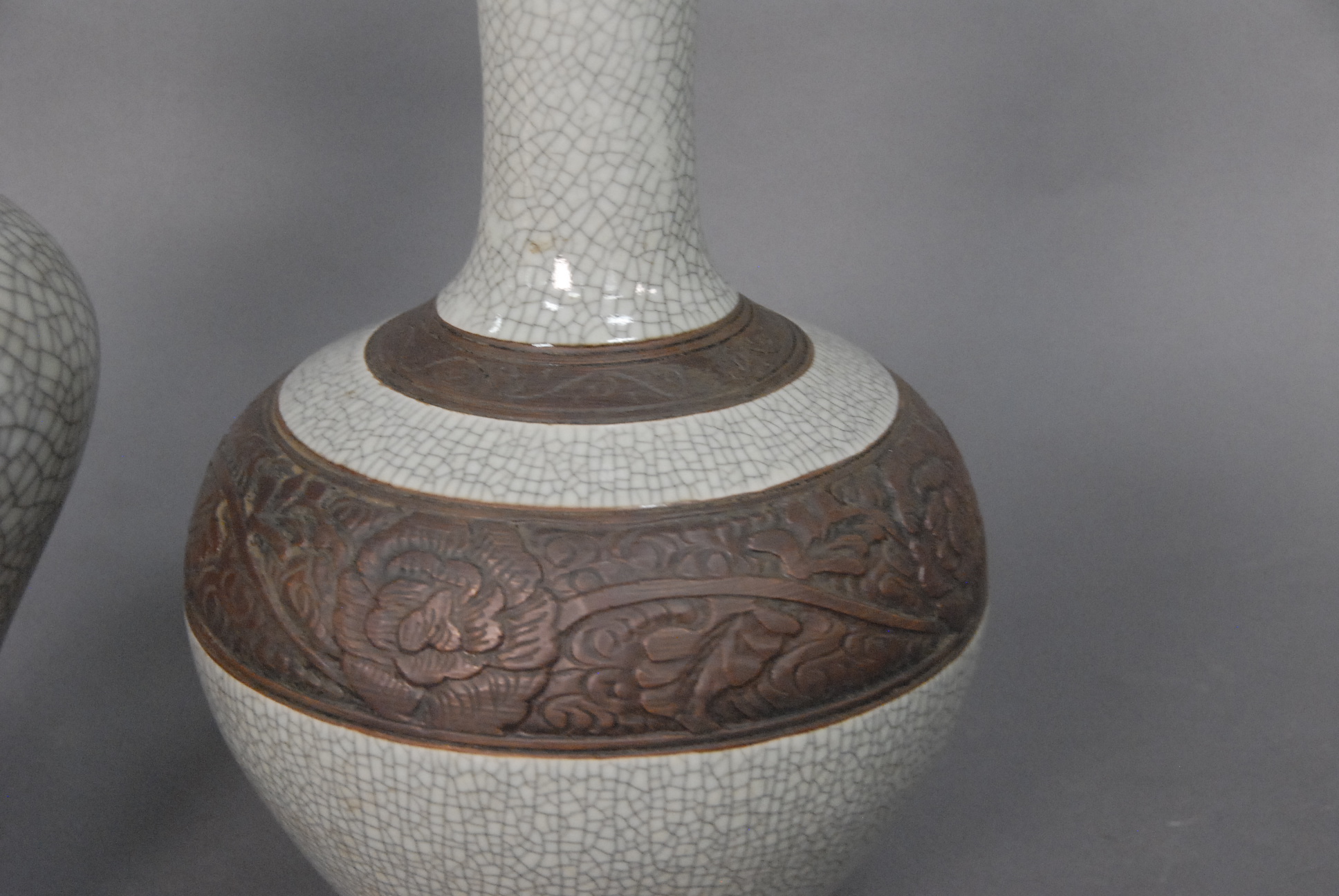 Lot 189: Two crackle glazed vases one Meiping ht. 12 1/2in. and the other globular with carved ring of flowers ht. 13 1/2in.