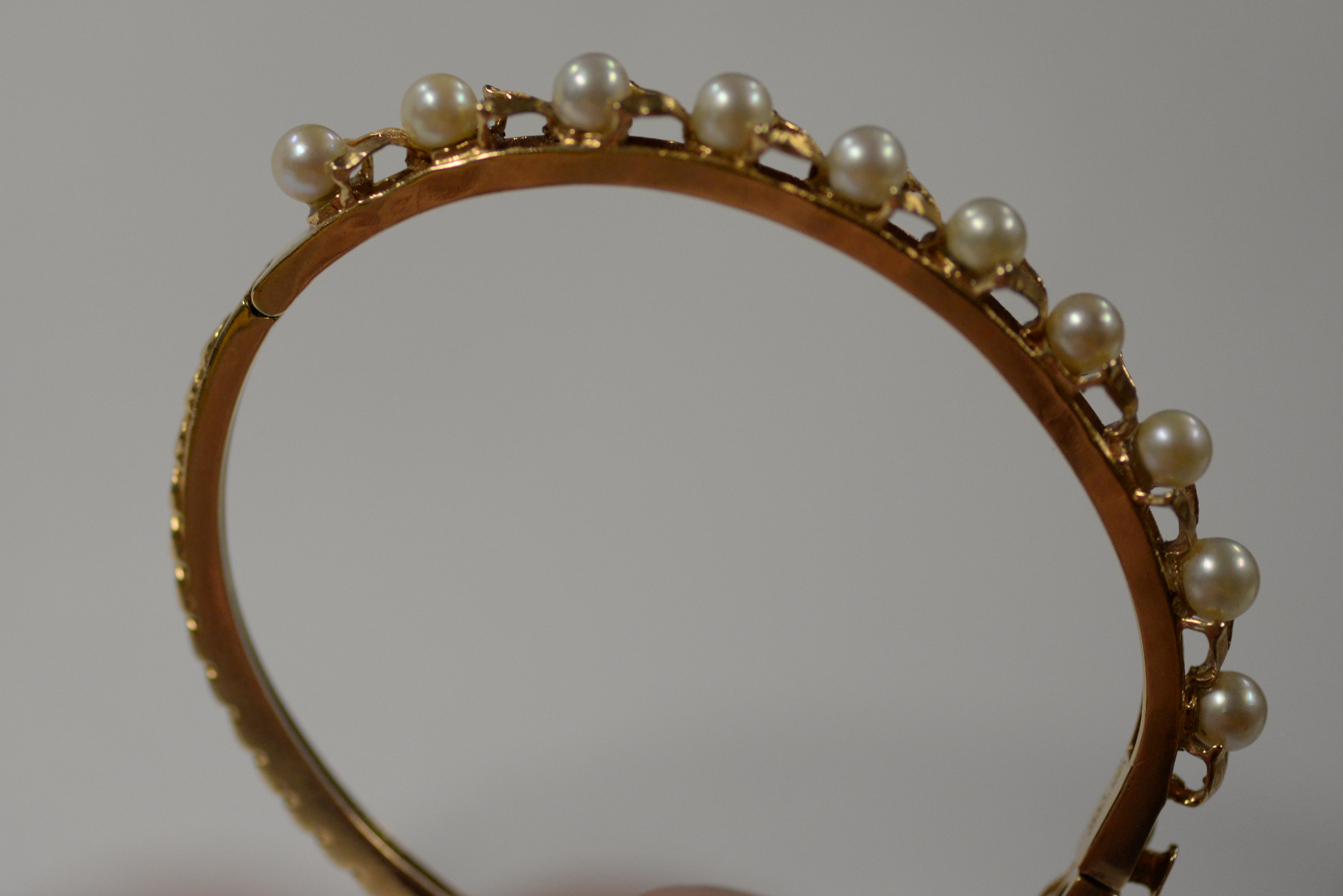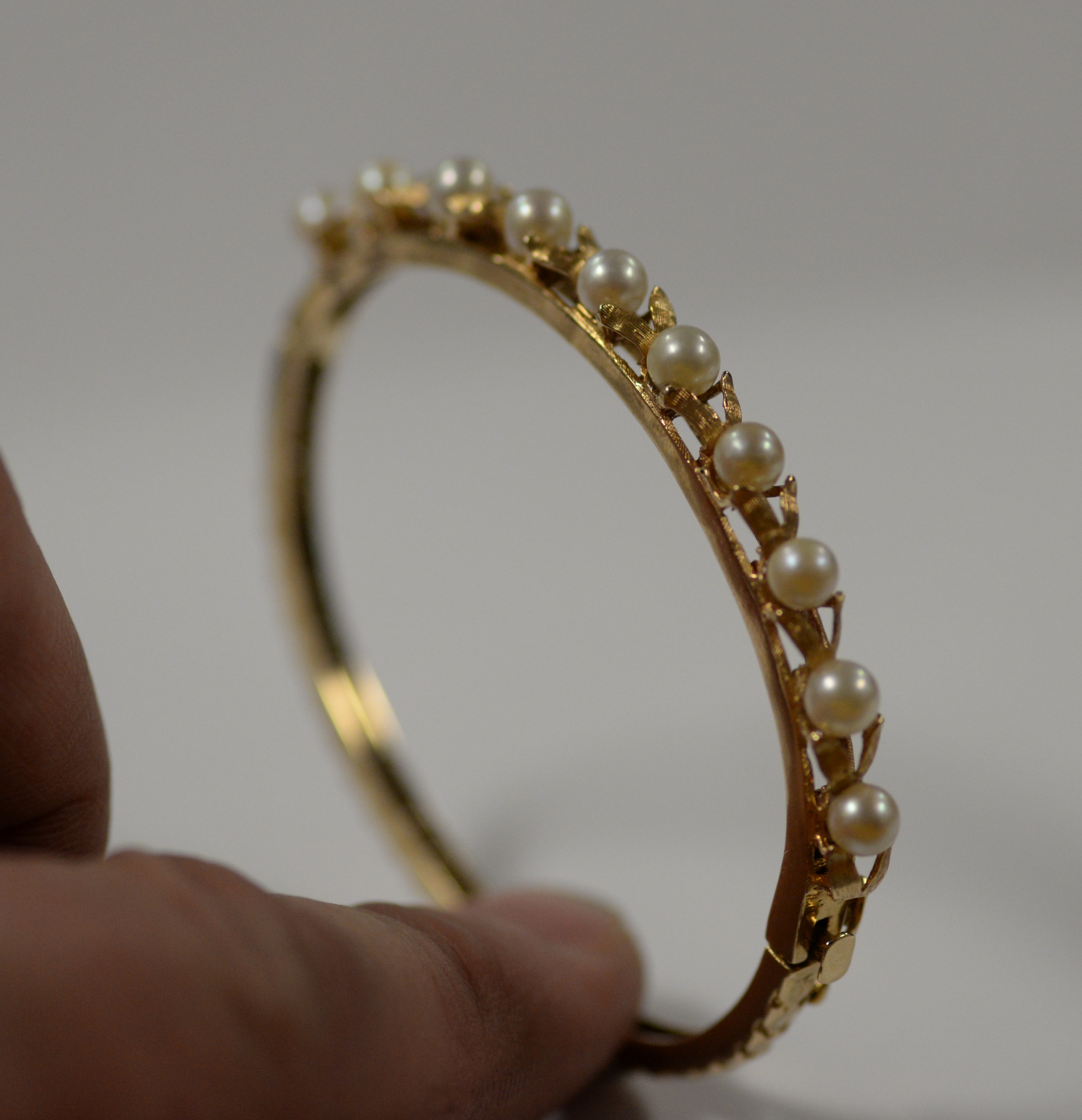 14K gold bangle bracelet set with ten pearls. 14.6 grams 2 1/2 x 2