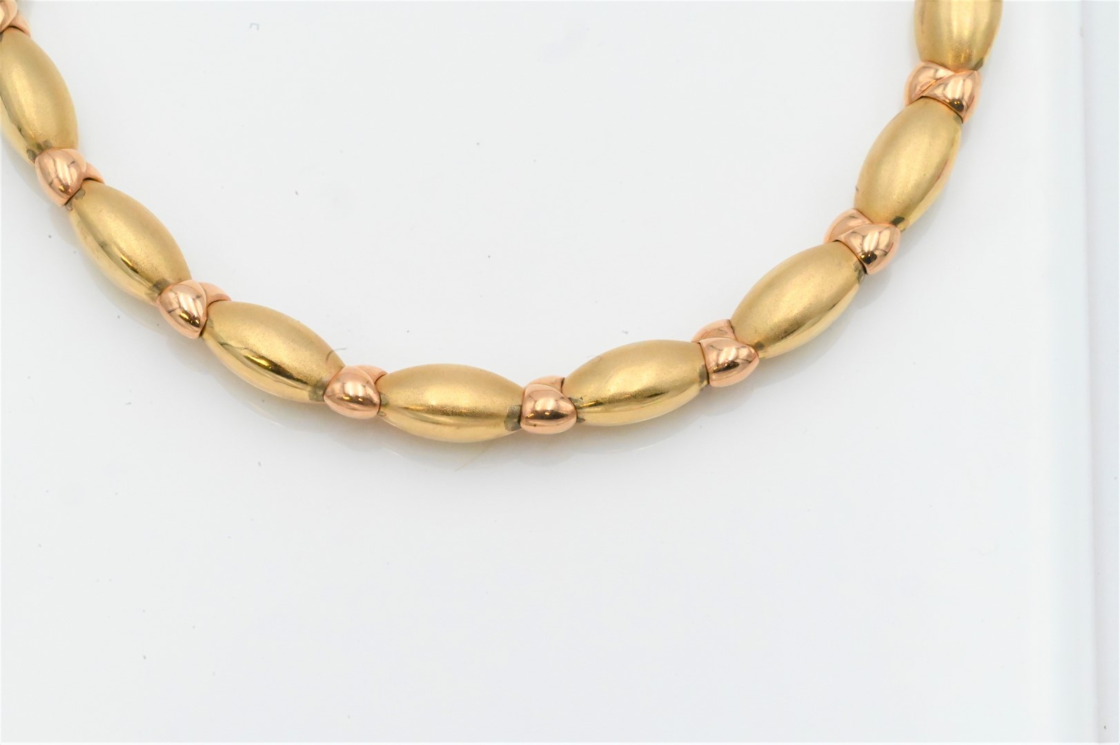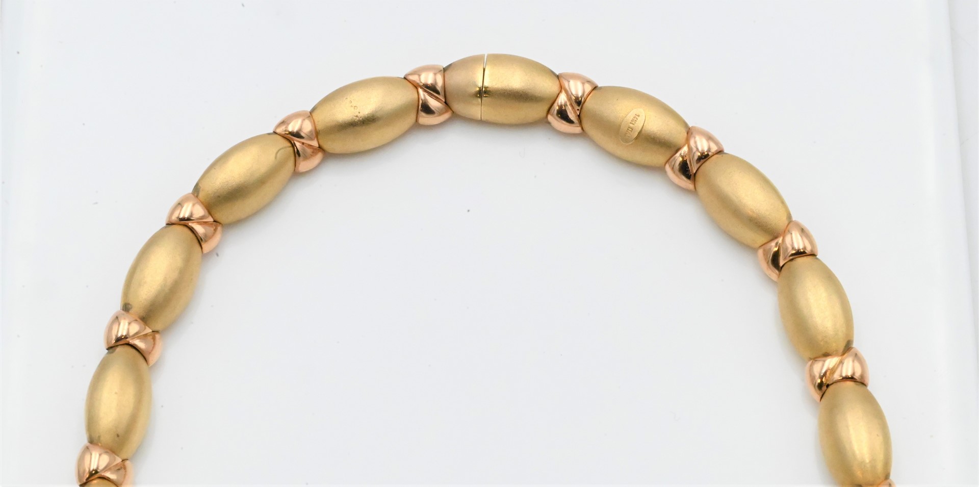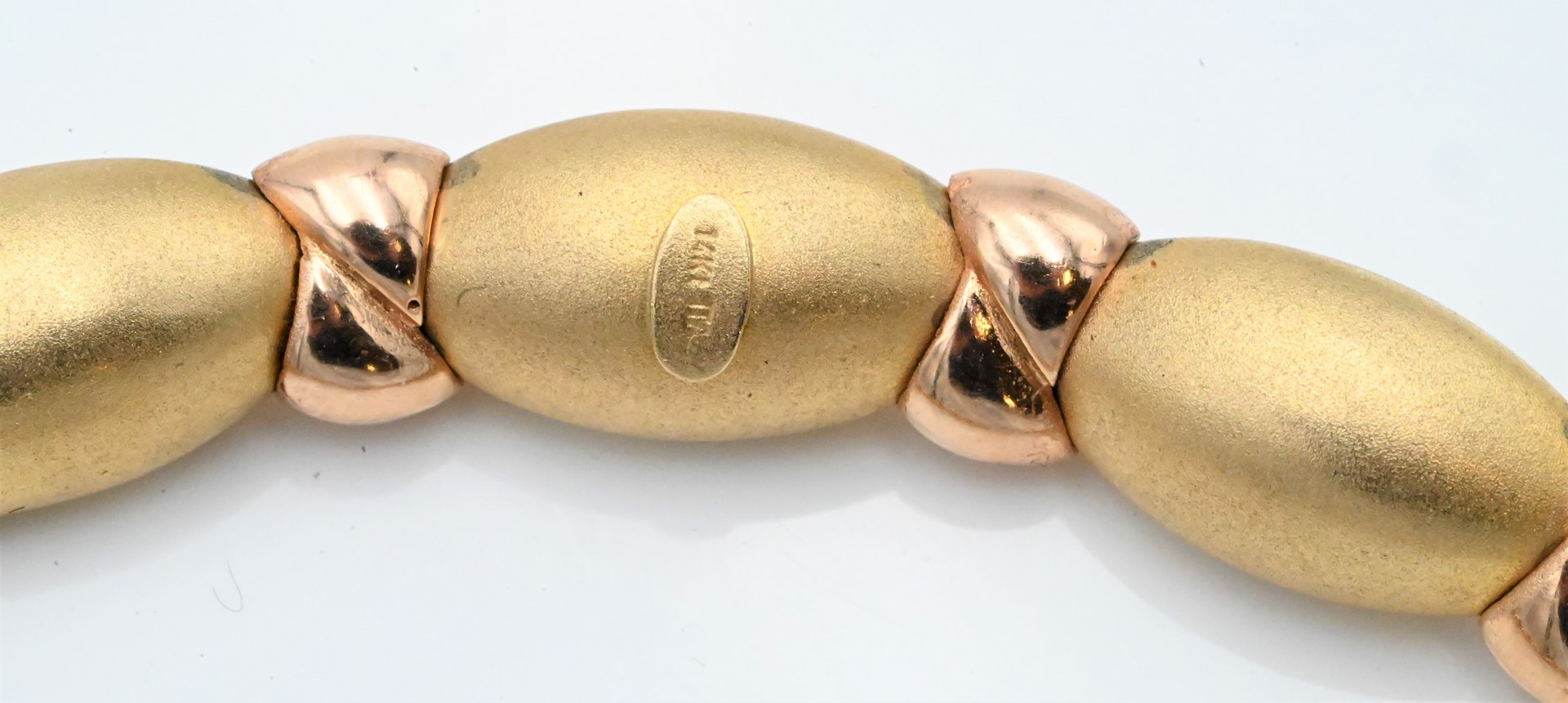 14 Karat Yellow Gold Necklace having oval links polished on one side, satin on the other side marked 14KT Italy length 17 inches, 60.5 grams