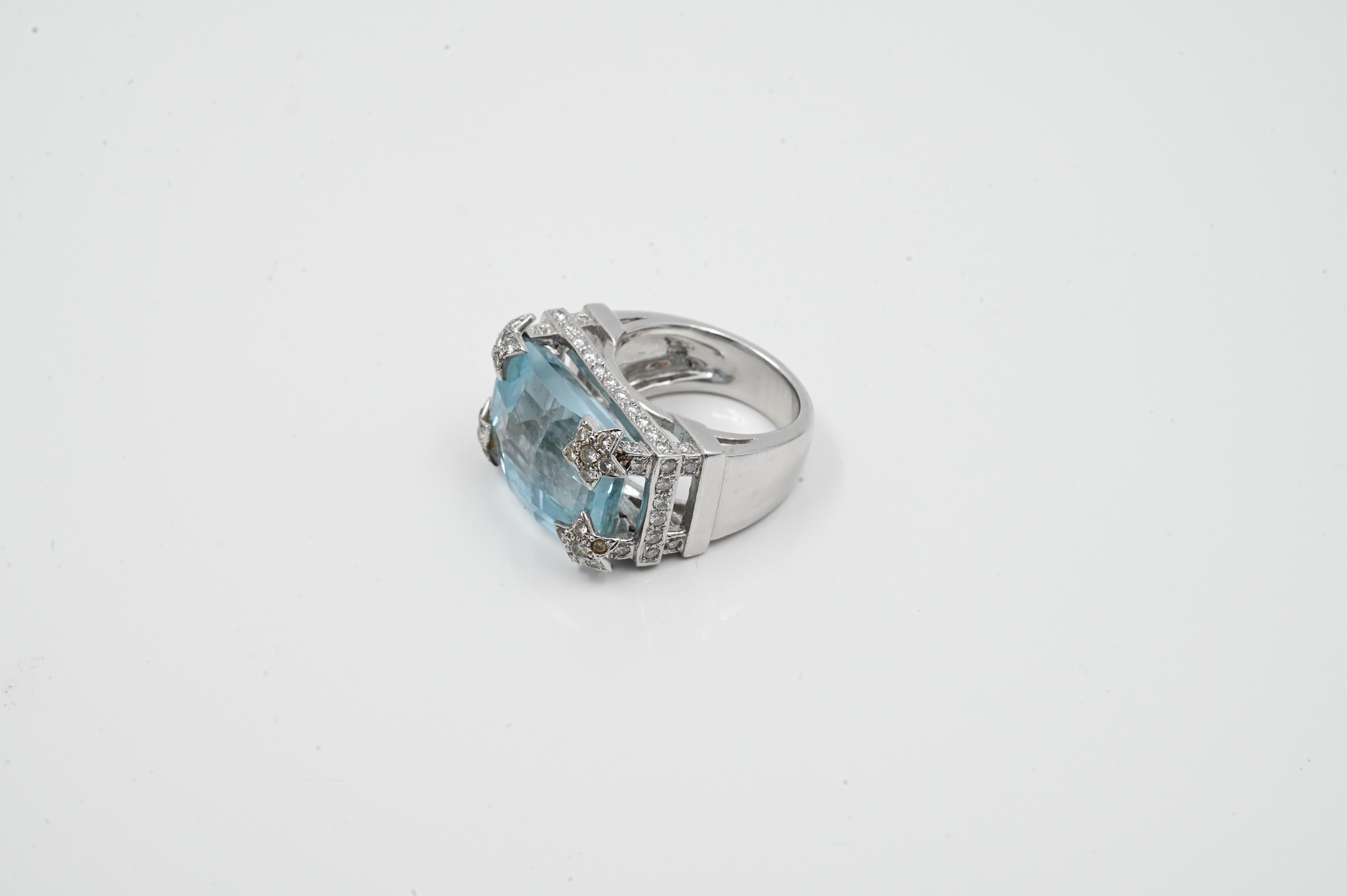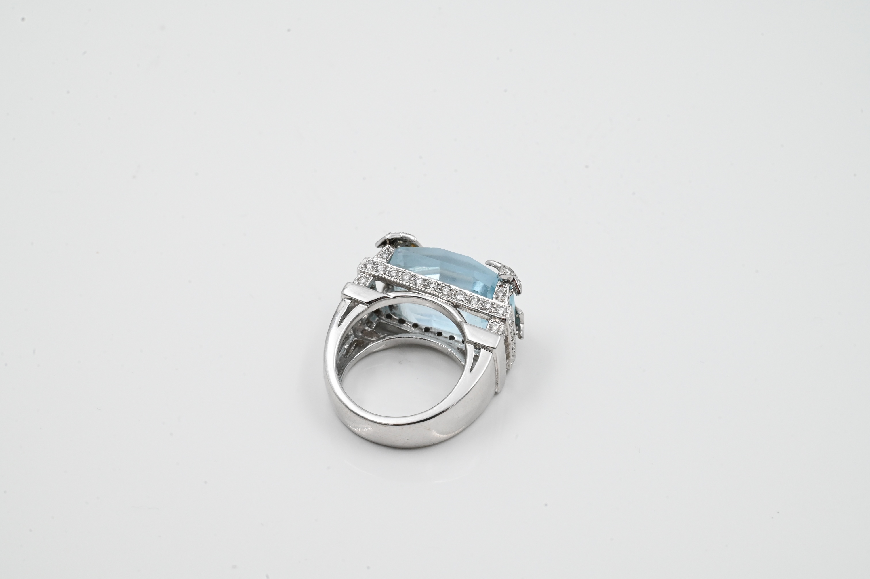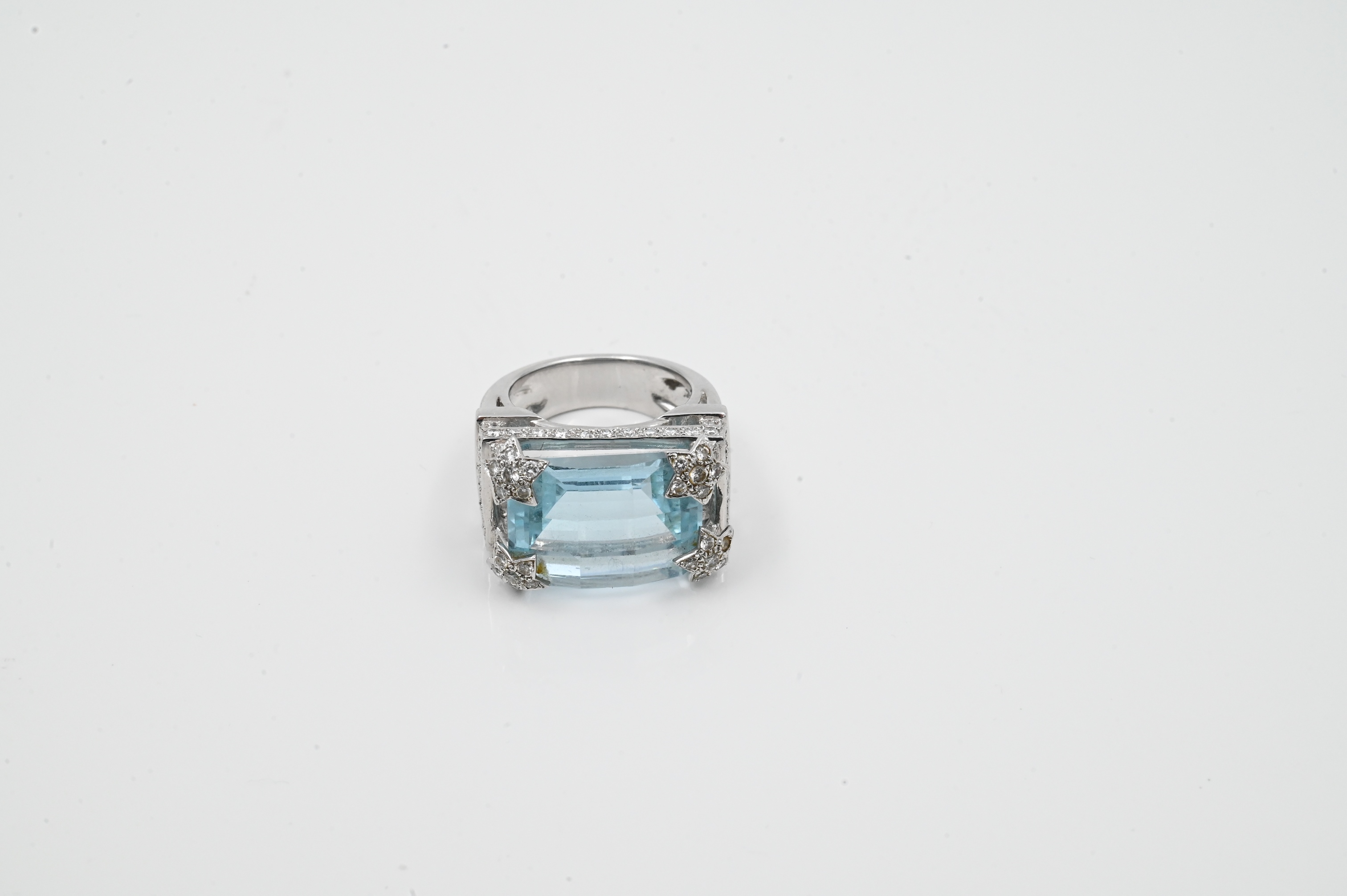 having large aquamarine center stone (17.7 mm x 13.1 mm), flanked on all four corners with melee diamonds in the form of stars