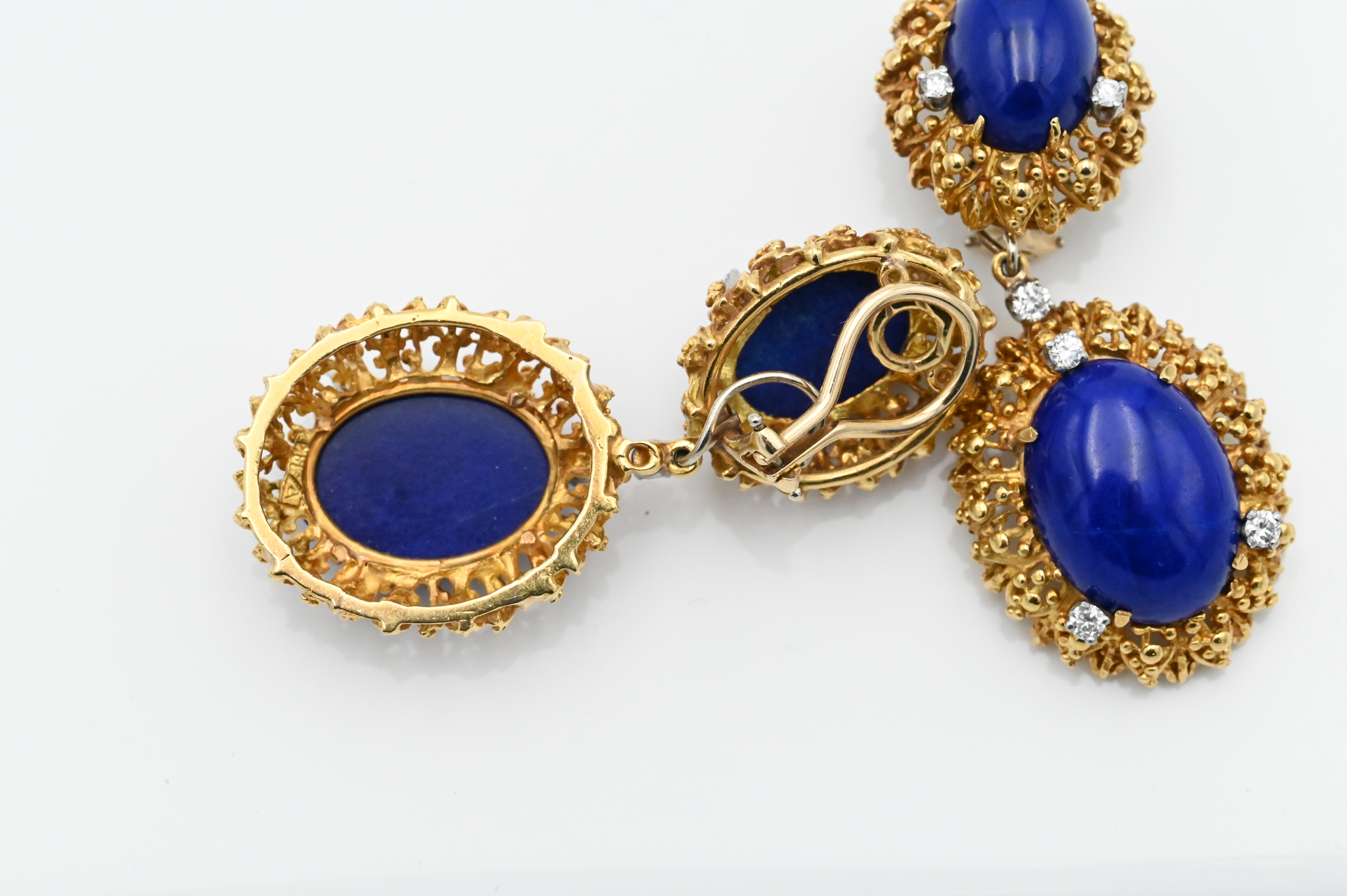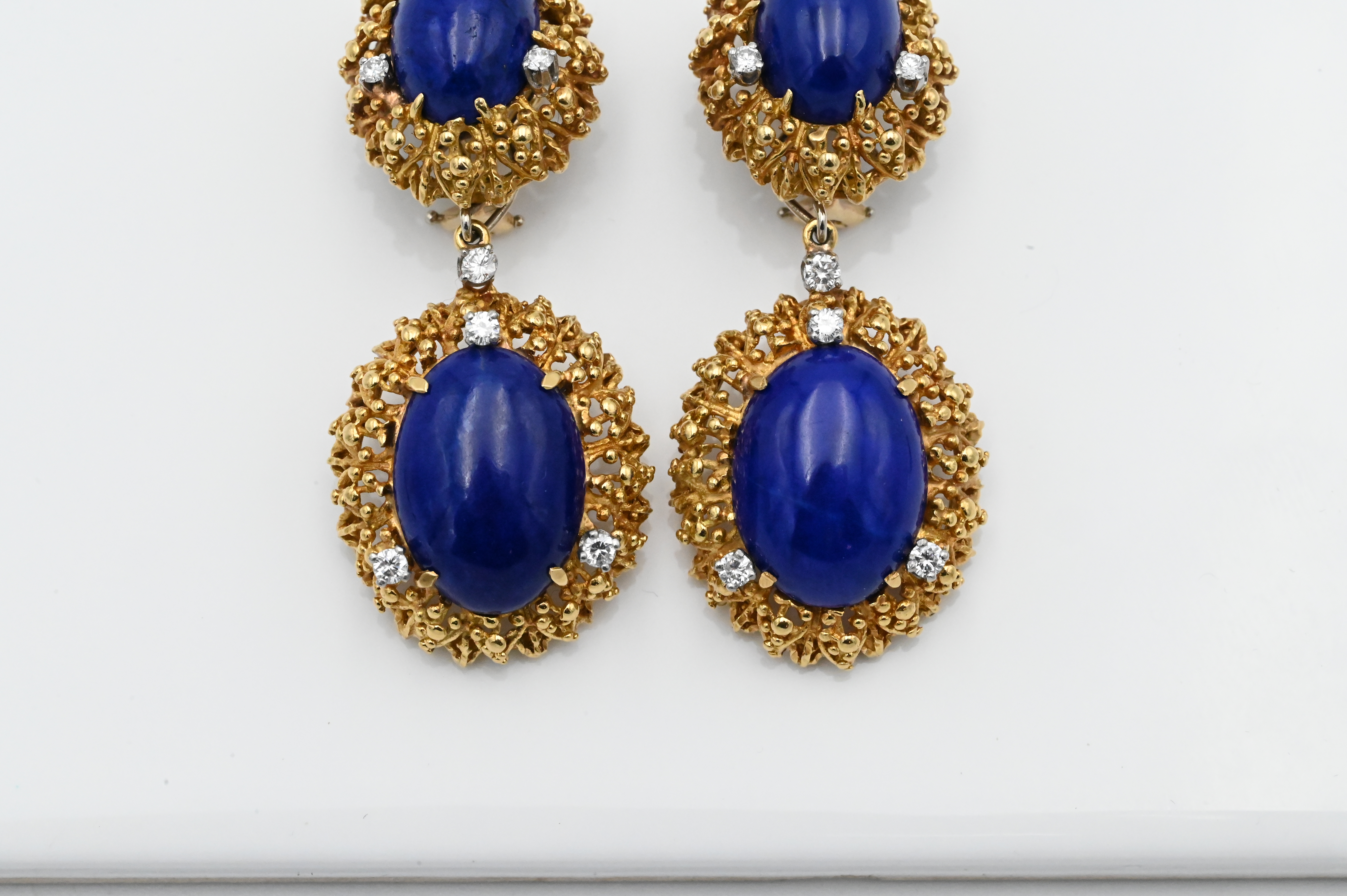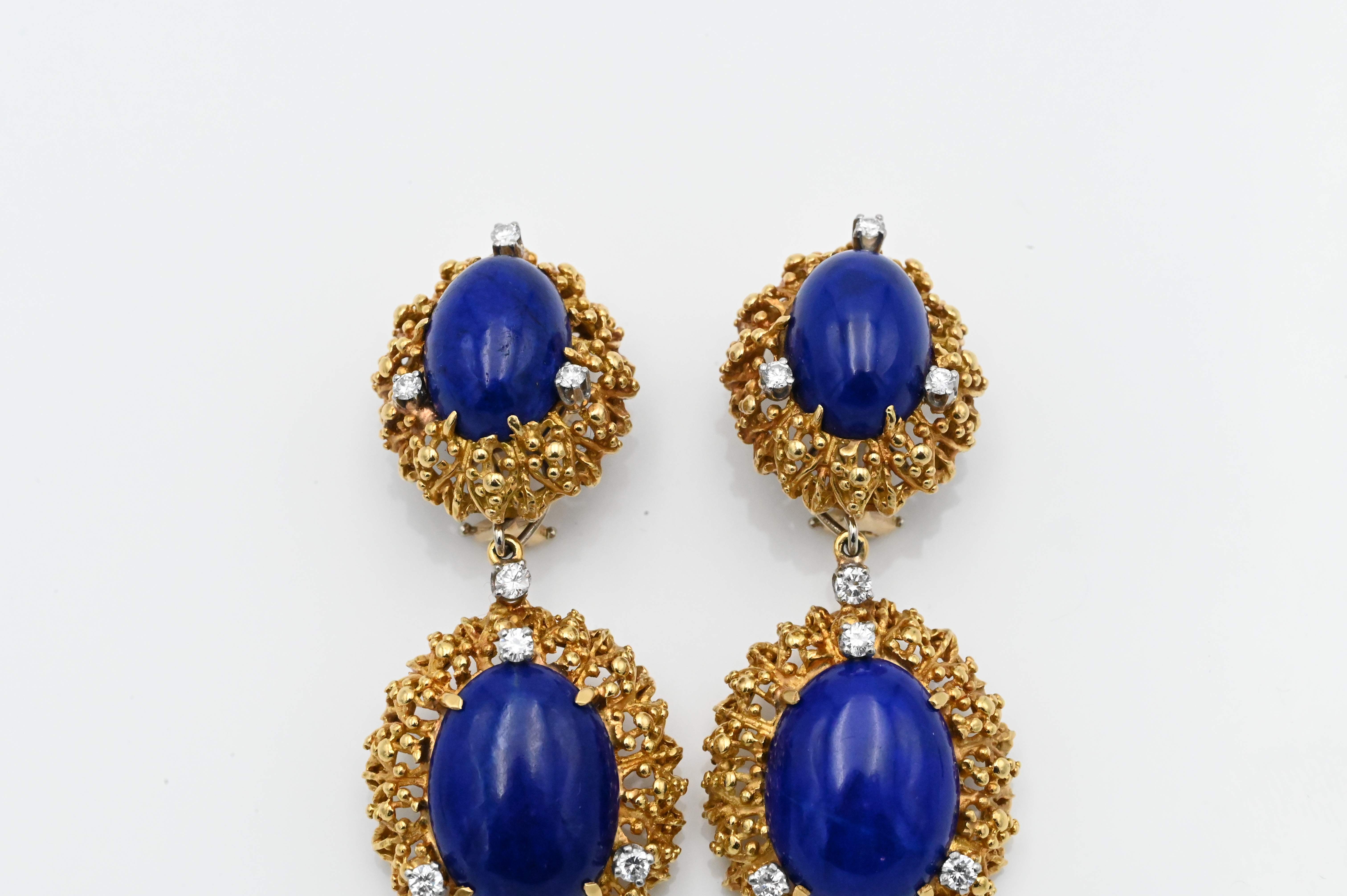 A Pair of 14 Karat Yellow Gold Ear Clips, having 18 karat yellow gold matching drops, each with cabochon blue stone and small diamonds, height 2 inches, total weight 27.4 grams.