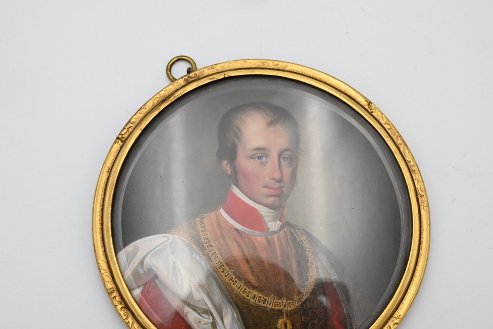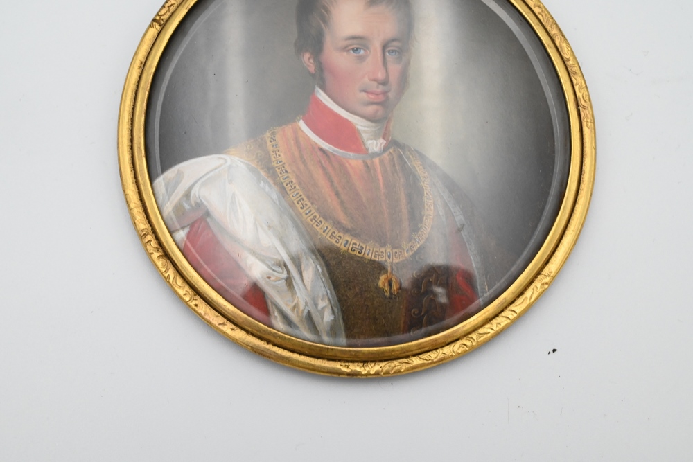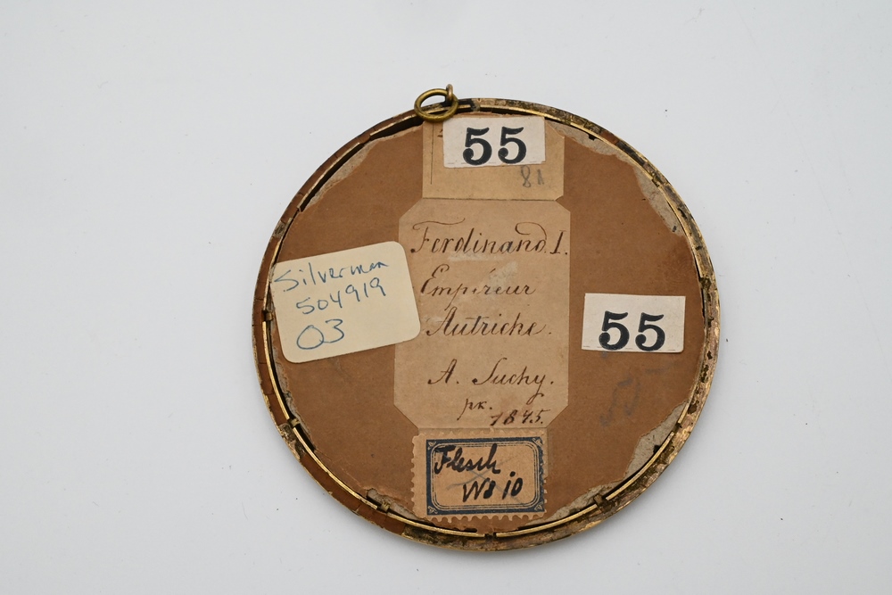 Lot 19: Adalbert Suchy 1783 – 1849 miniature portrait of Ferdinand Empereur D’autriche signed lower right and dated 1845 old paper label on back with sitters name and artist name diameter 3 1/2 inches