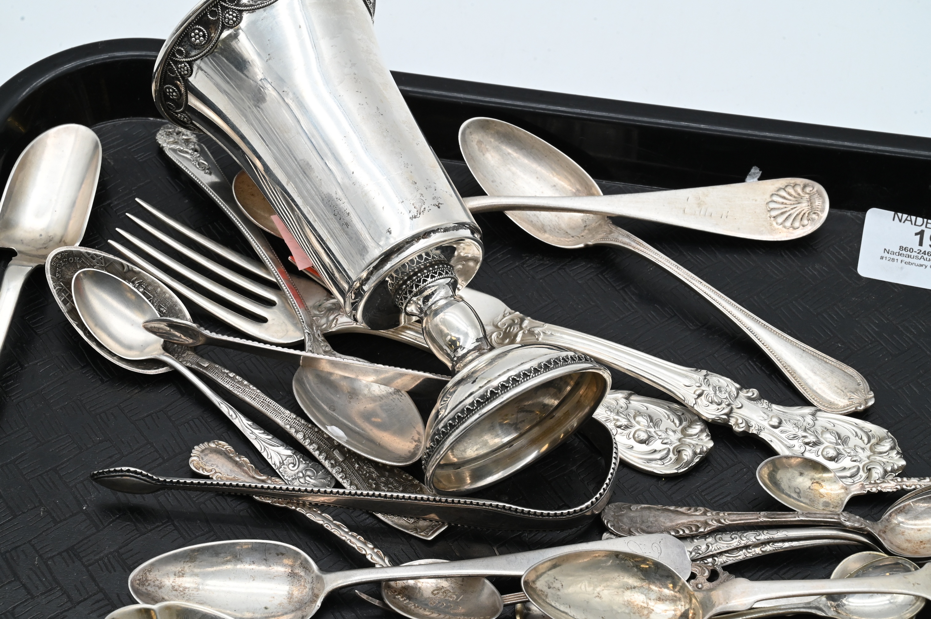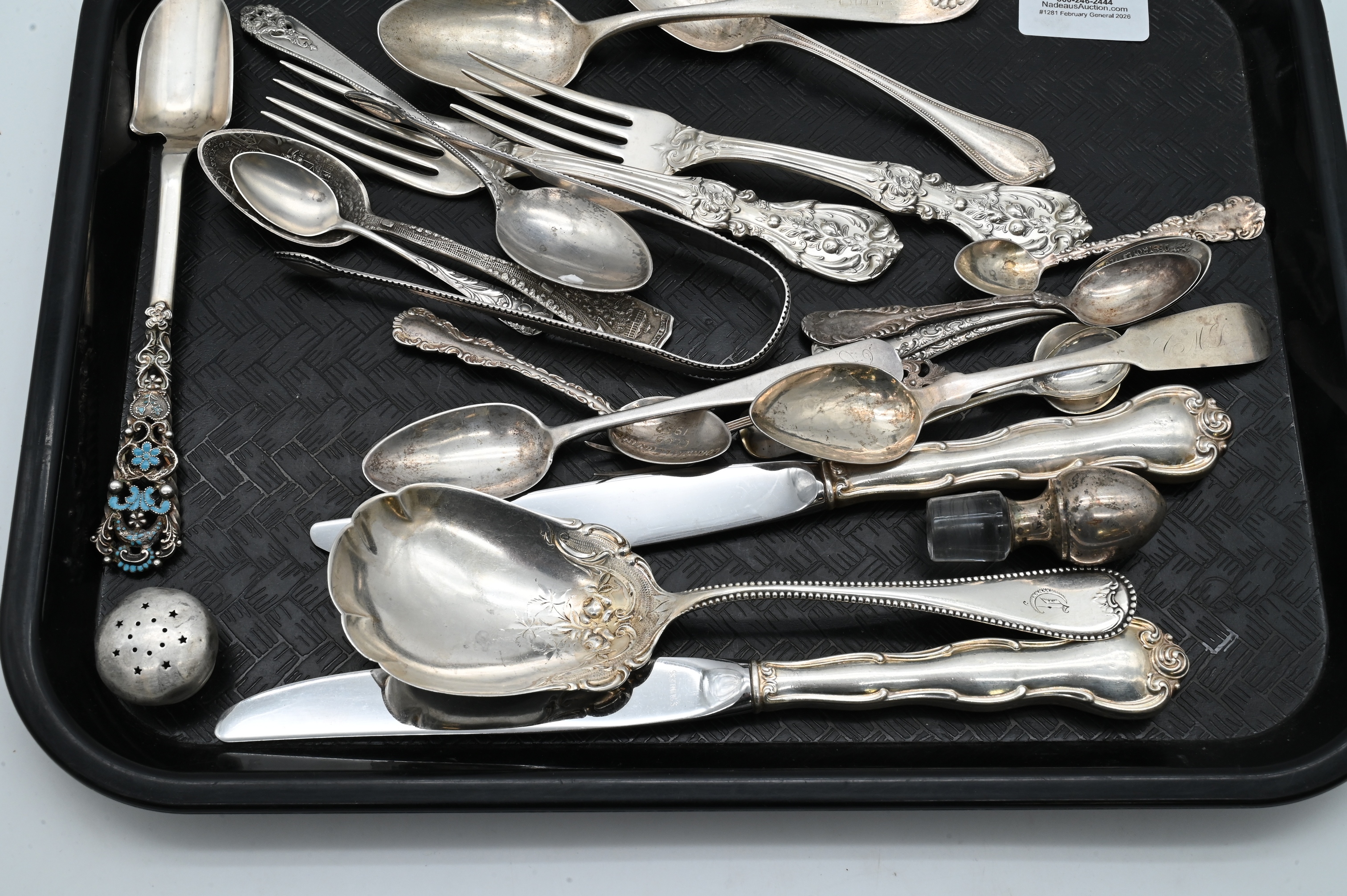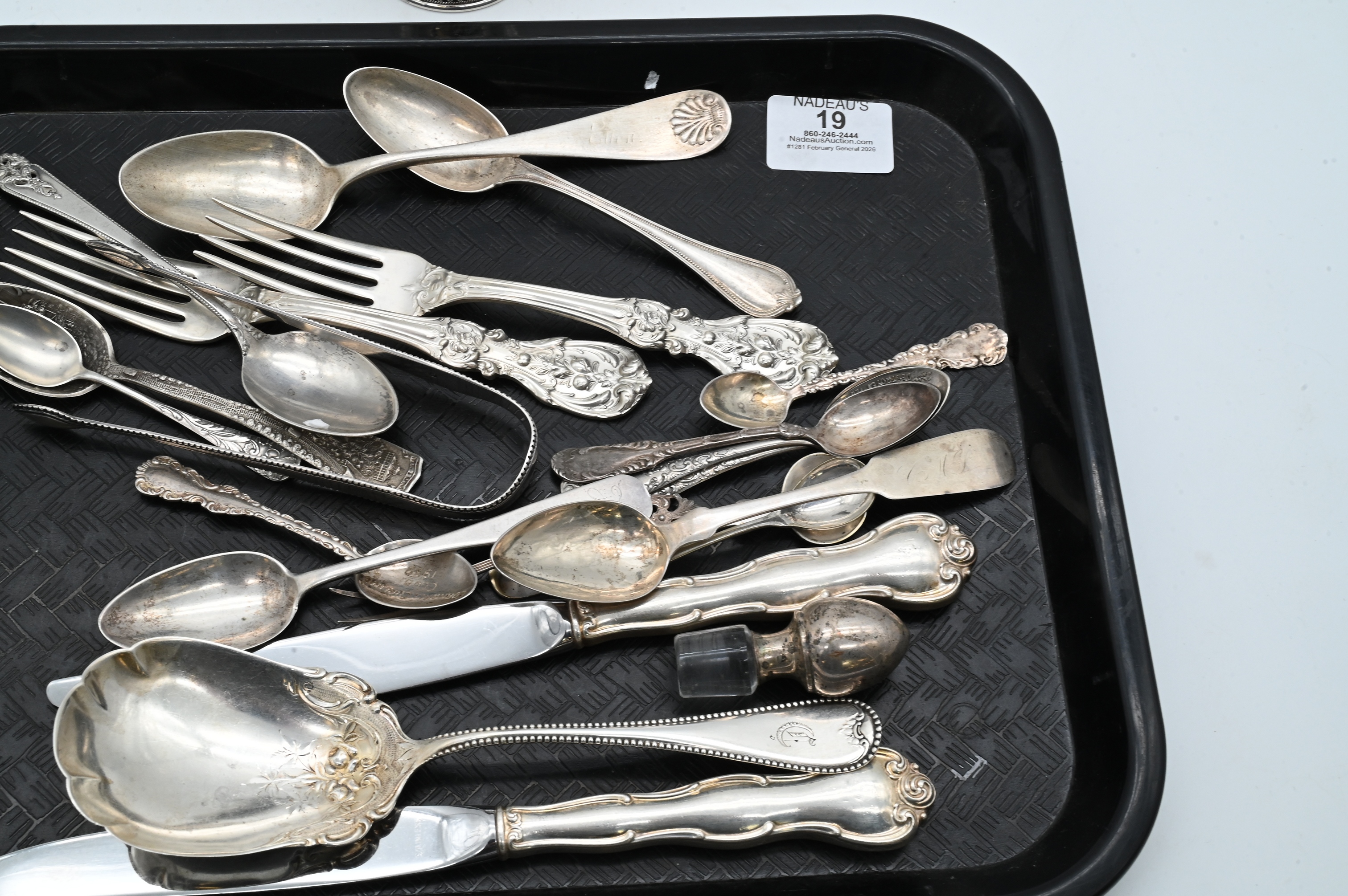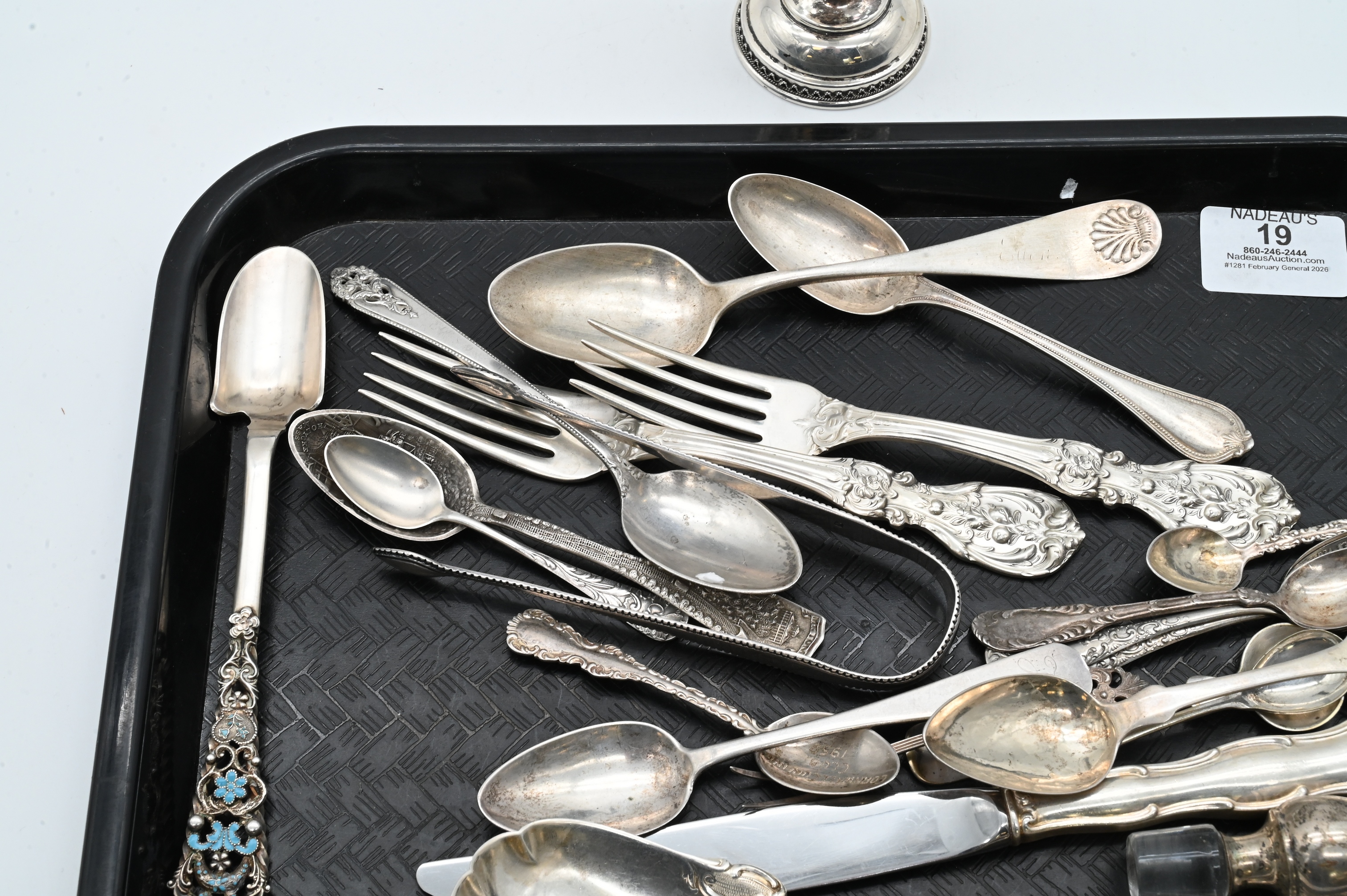 to include spoons, forks, cups, and other serving pieces, with two weighted knives and stopper, along with small group of silver plate