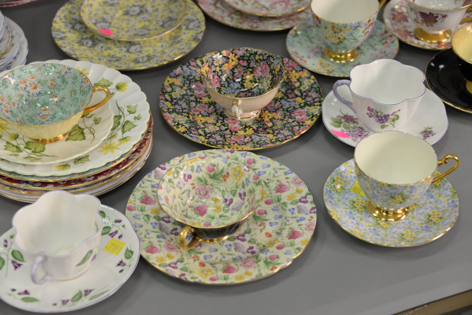 Large group of Shelley china, approximately 65 pieces to include English Shelley porcelain large jelly mold, Shelley violet creamer and plate, thirteen cups, twenty-five saucers, and approximately twenty-two plates and dishes.