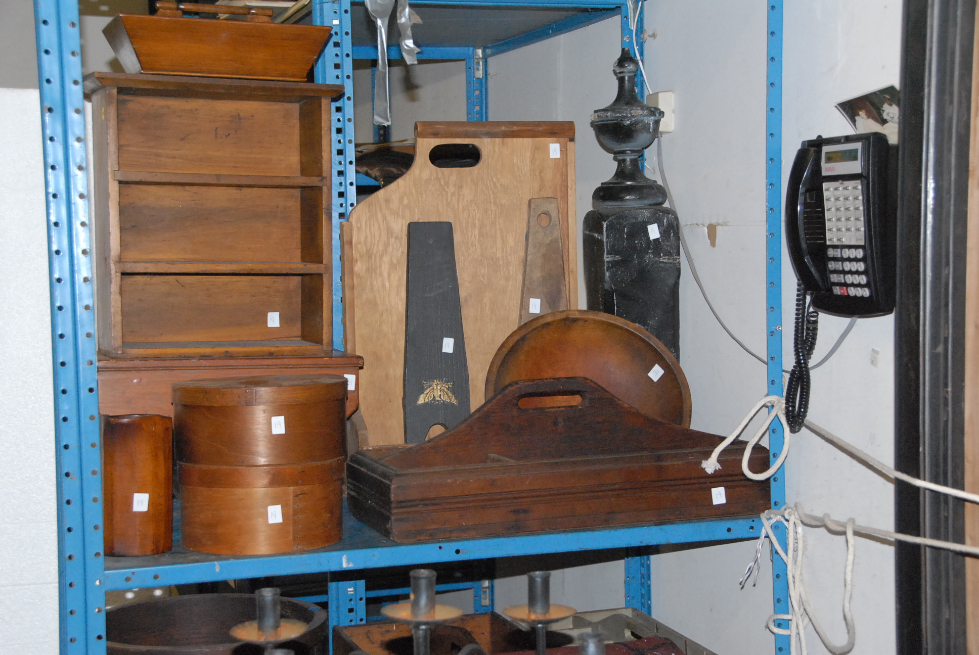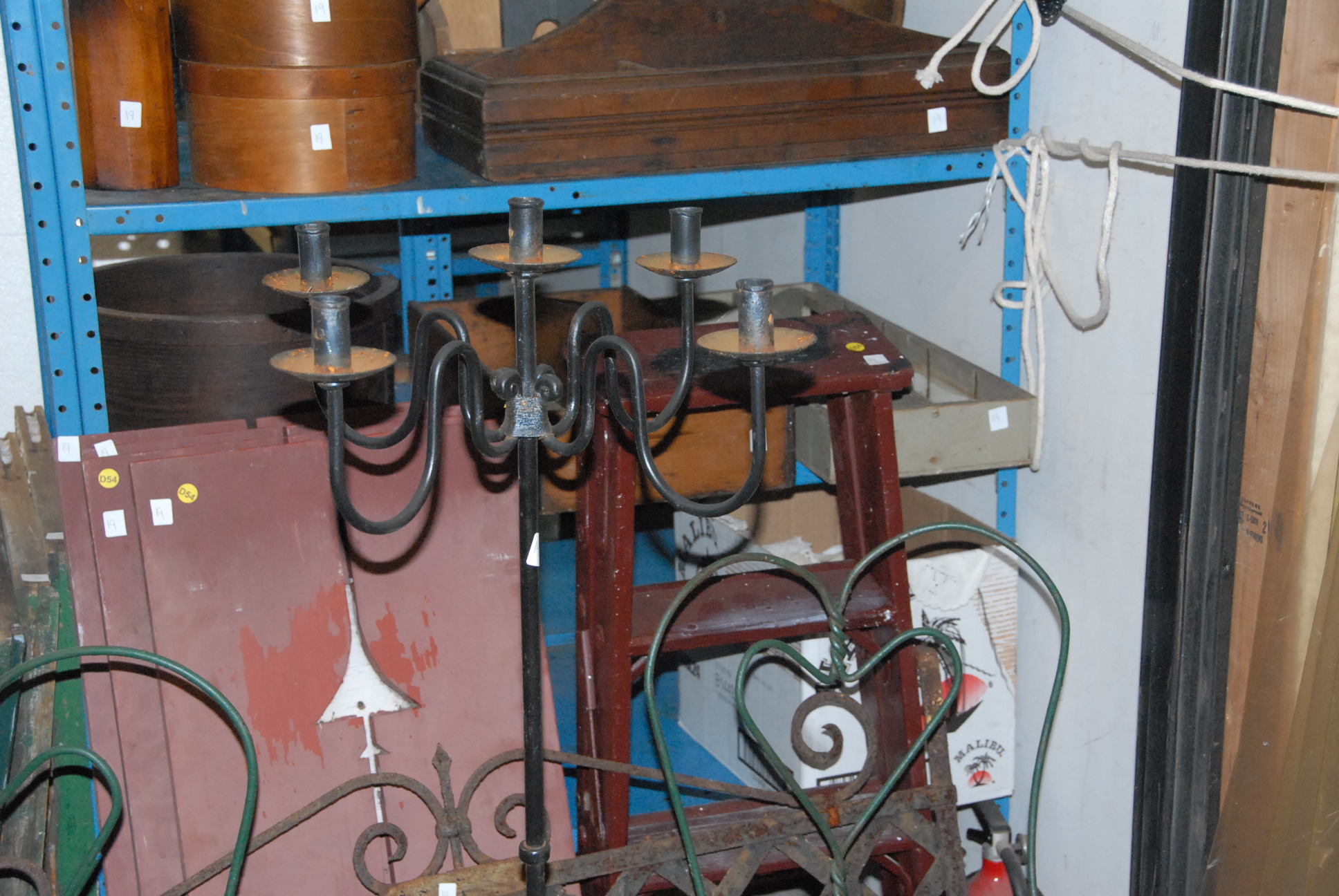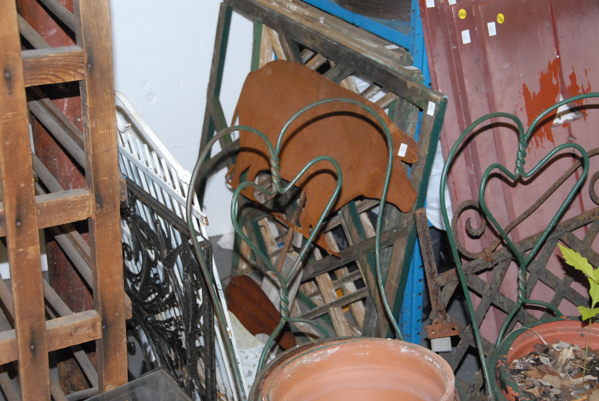 Large grouping to include a primitive shoe/wine rack, bars for a window, a pig weathervane, round primitive boxes, several tool trays, shutters, iron outdoor chairs, ice cream parlor chairs, iron candelabra stand, step ladder, shutters, hooked rug, and a glass top table.