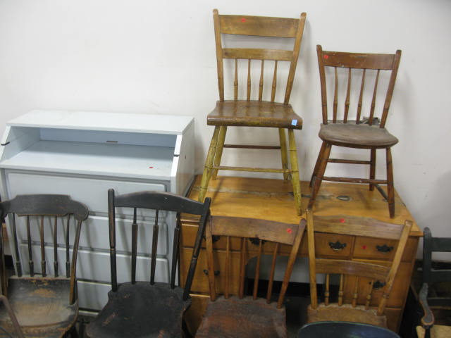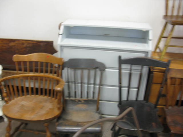 Large lot of furniture to include 10 antique chairs, kneehole desk, blue cabinet, bed headboard and footboard