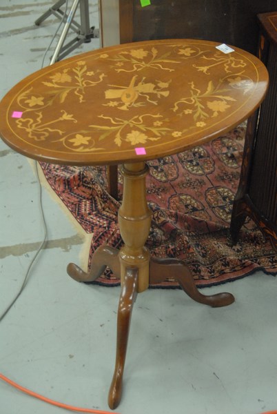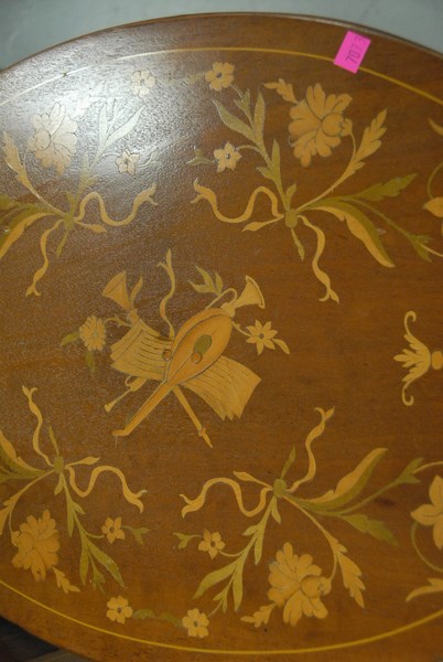 Marquetry inlaid mahogany tip table, top: 24 x 16 1/2.