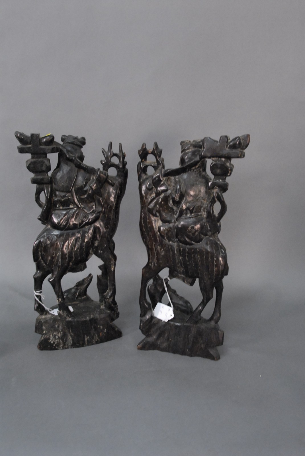 Pair of Chinese carved wood figures of goddess immortal He Xiangu atop a deer, mirror images with brass inlay.