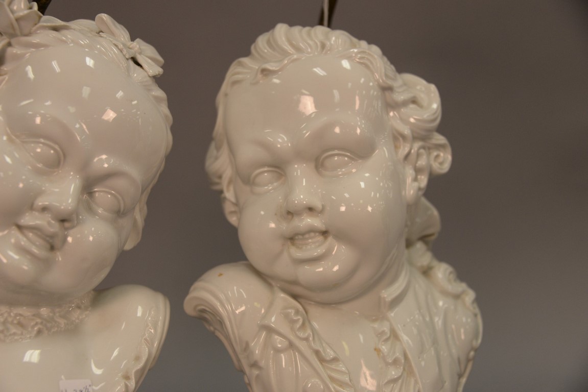 Pair of Italian porcelain white glazed buts of young boy and young girl, signed on back Pustelli. ht. 28 1/2 in.