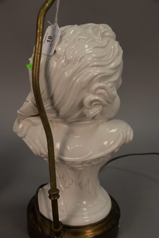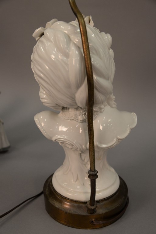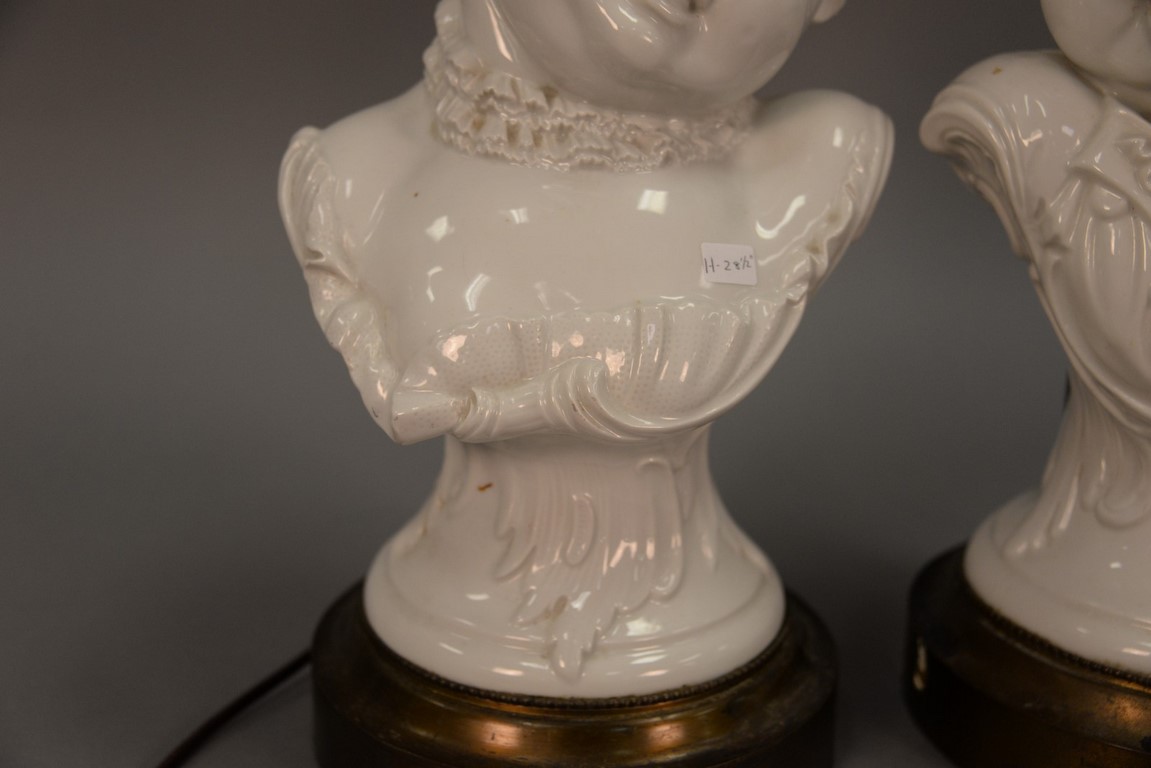 Lot 19: Pair of Italian porcelain white glazed buts of young boy and young girl, signed on back Pustelli. ht. 28 1/2 in.