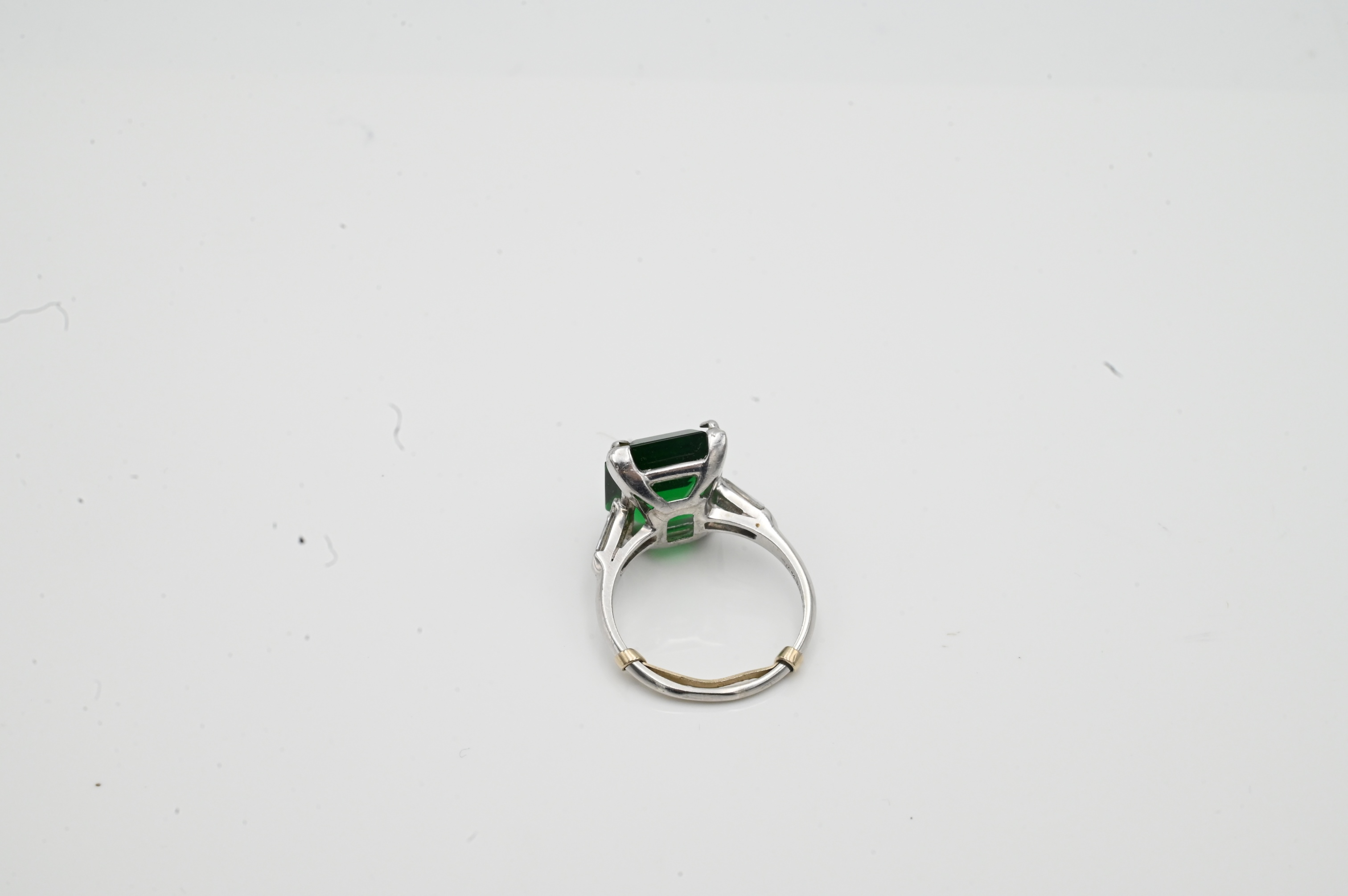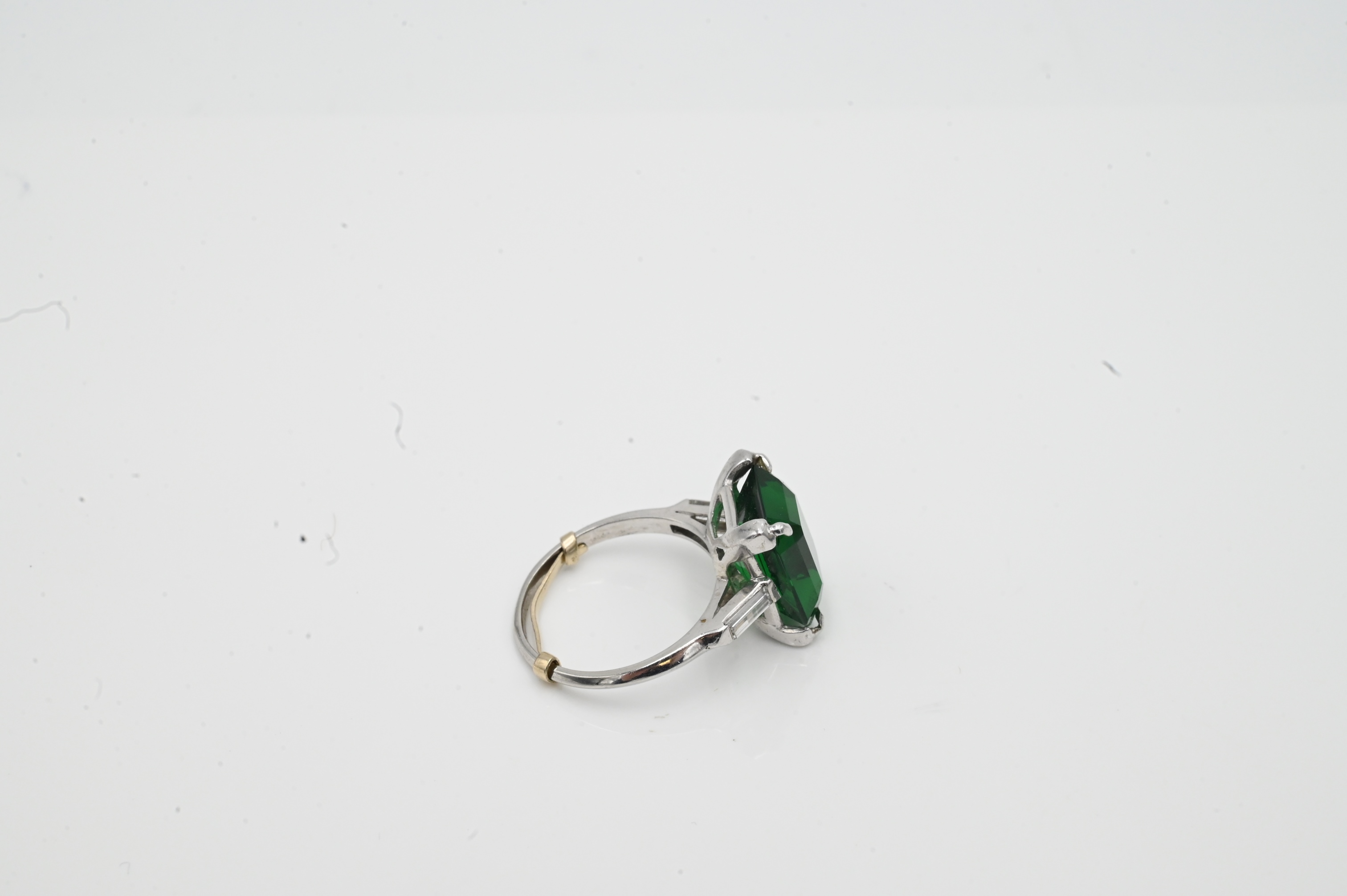 Platinum Ladies Ring, set with green emerald cut stone, flanked by baguette diamonds, size 7.