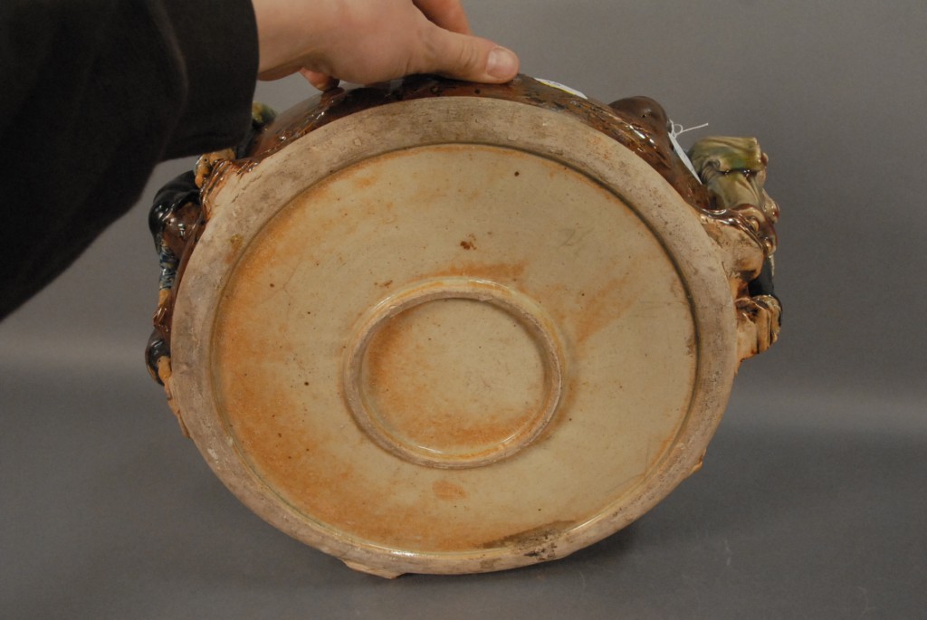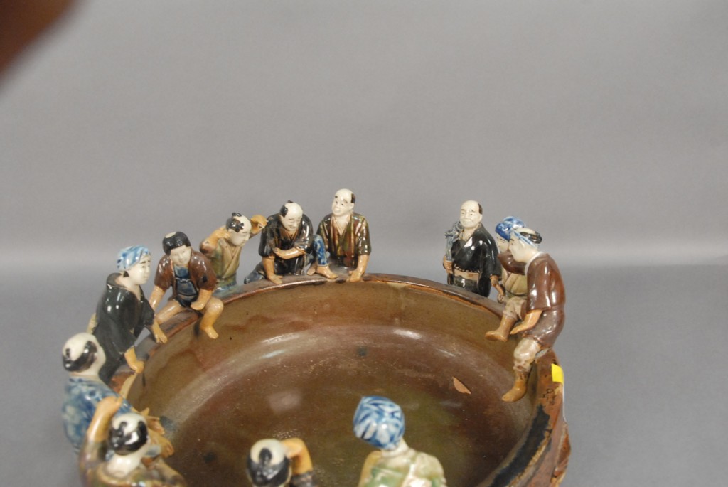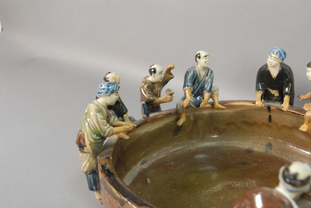 Porcelain glazed large bowl with twelve molded men around the exterior, ht 7, dia. 17.
