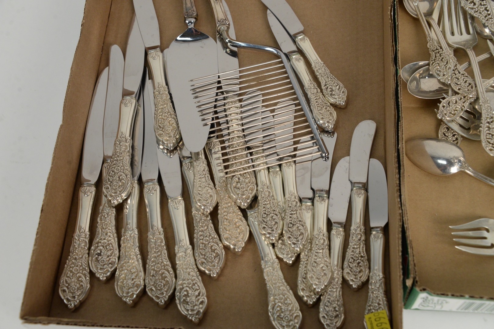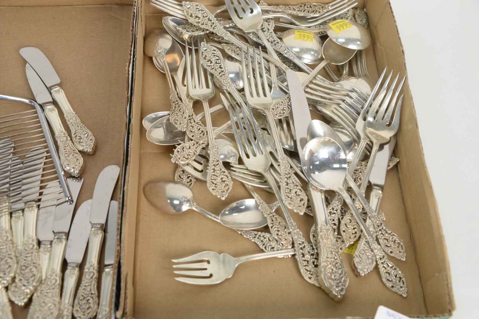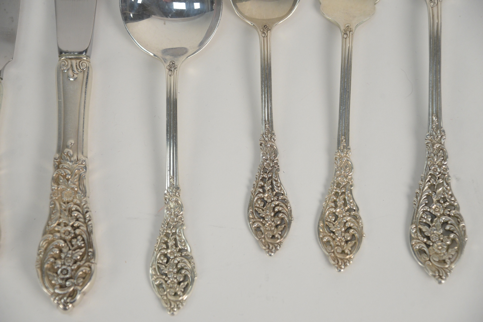 Lot 19: Reed and Barton Sterling Silver Flatware Set, seventy three piece setting for twelve to include 12 dinner forks 11 salad forks 12 soup spoons 12 teaspoons 11 butter knives 12 dinner knives, 73.1 t.oz. plus 25 handles.