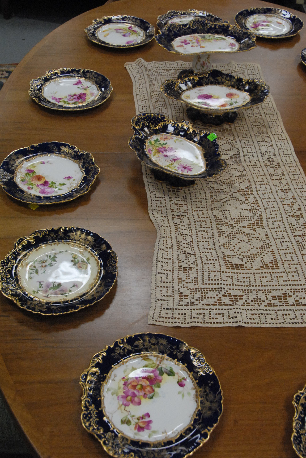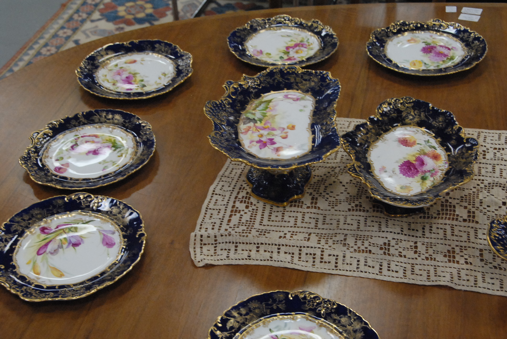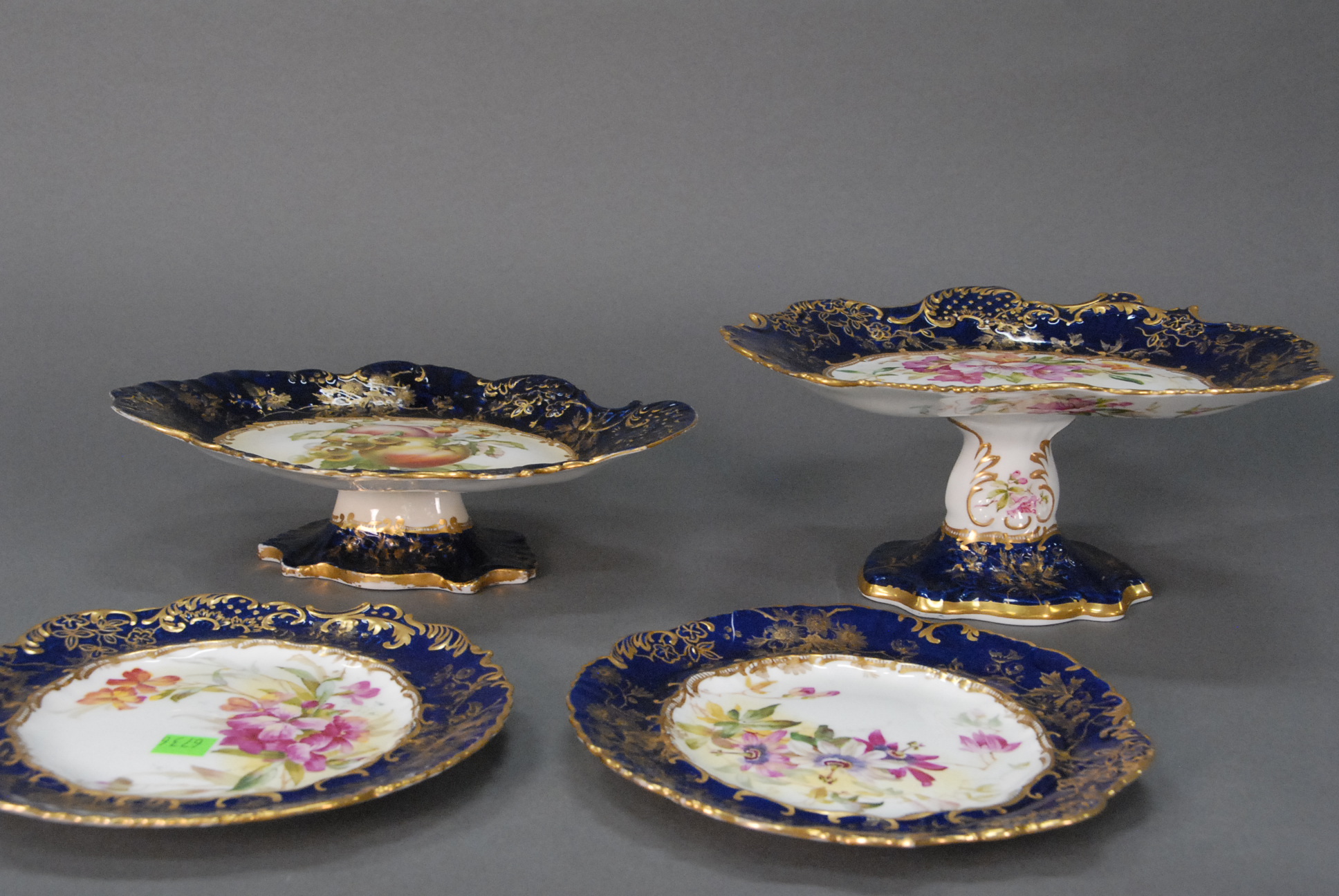 Seventeen piece dessert set two tall and three short compotes and twelve plates with cobalt and gold borders all with English registration numbers one marked Hammersley & Co. England each with various hand painted flowers one plate cracked.