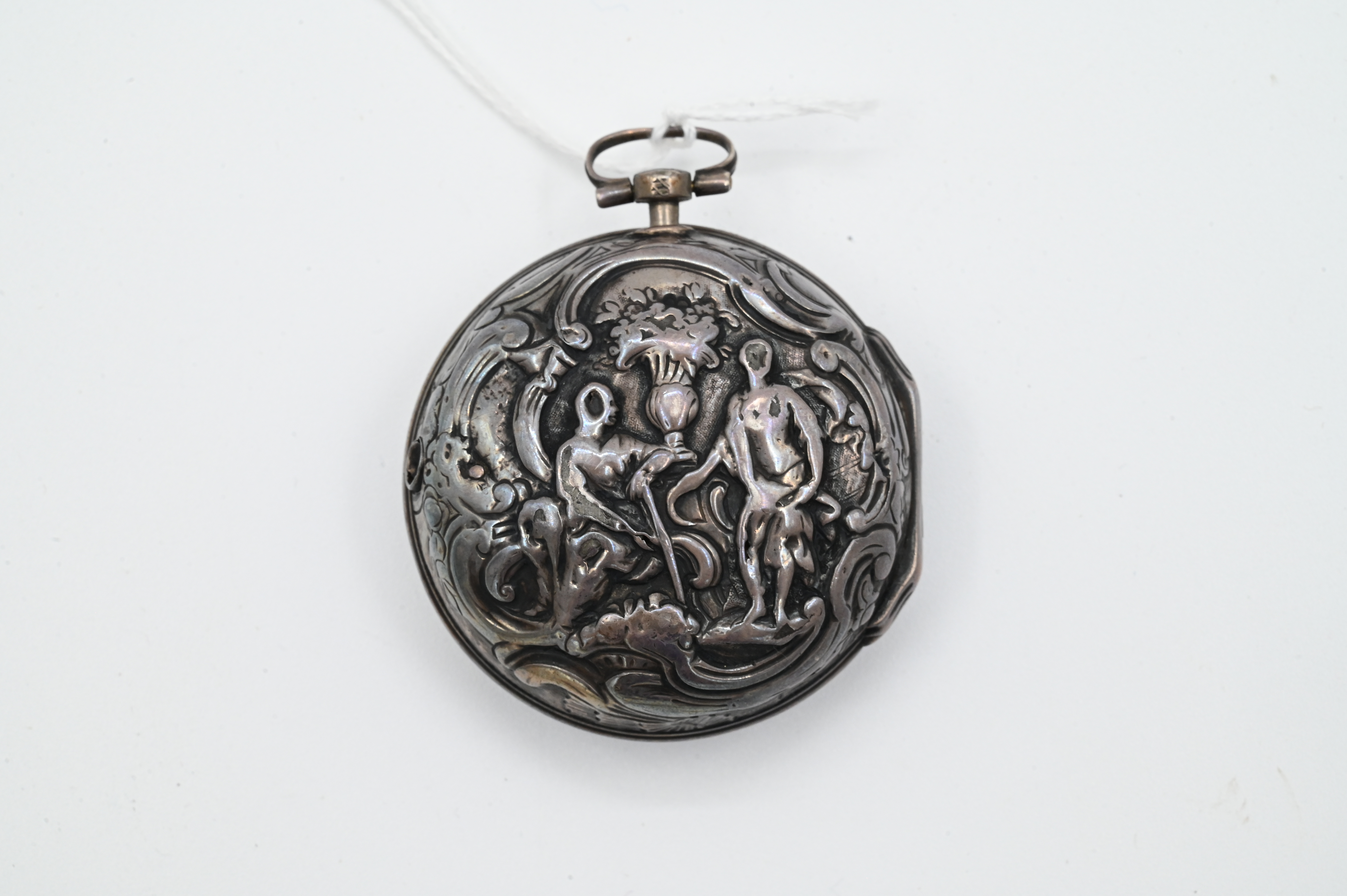 Lot 19: Silver English Fusee Pocket Watch Embossed with Three Dimensional Scene