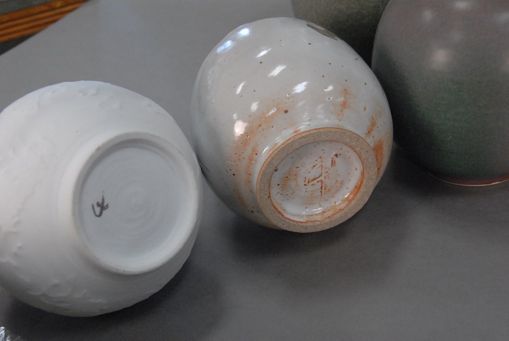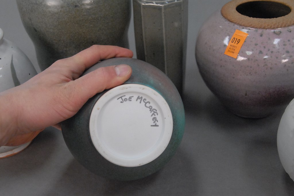 Six piece lot of stoneware and pottery, several pieces signed, one Joe McCaffery.