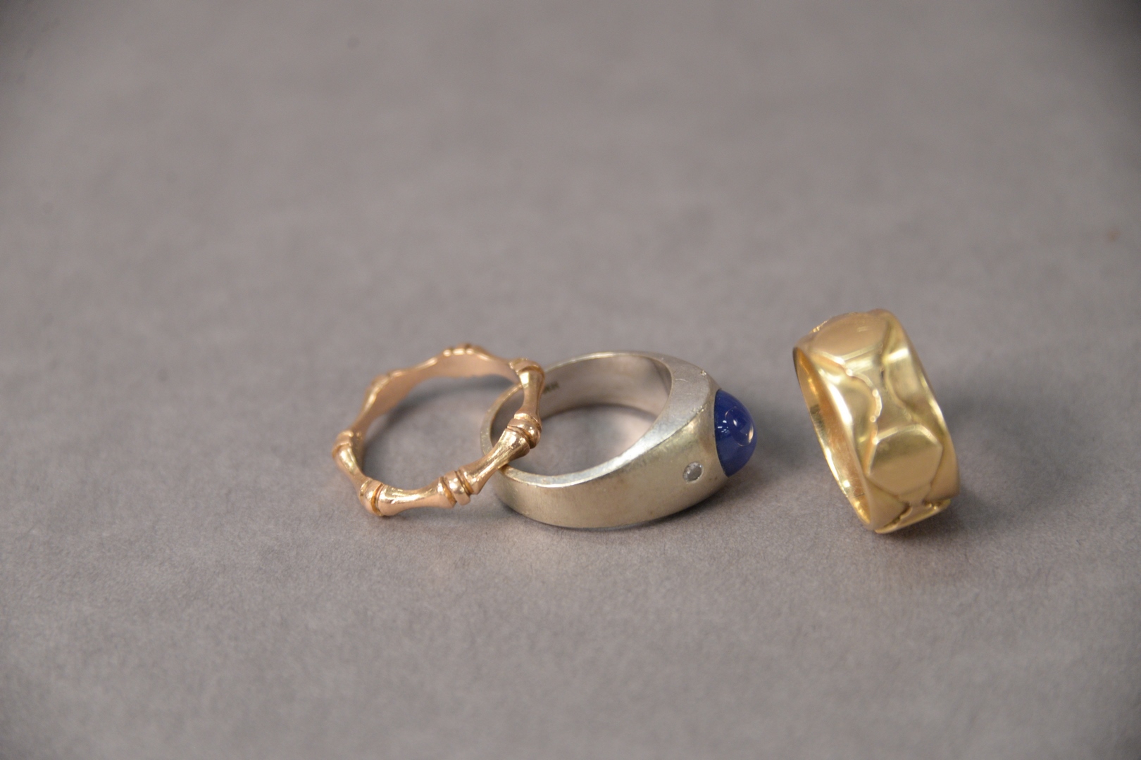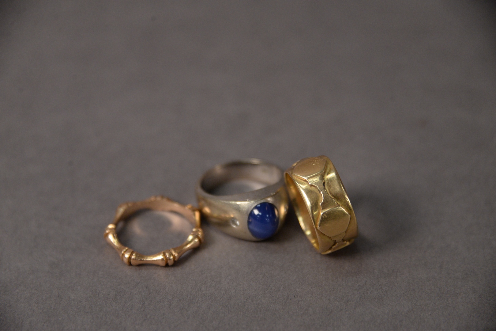 Three 14 Karat Gold Rings, one having blue star sapphire, 26.5 grams total weight.