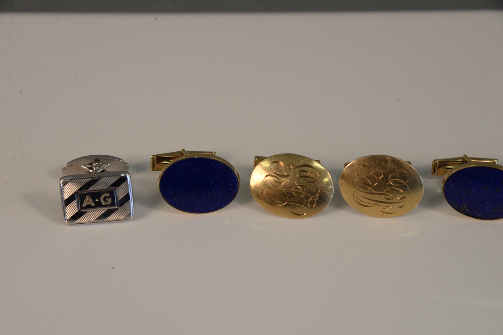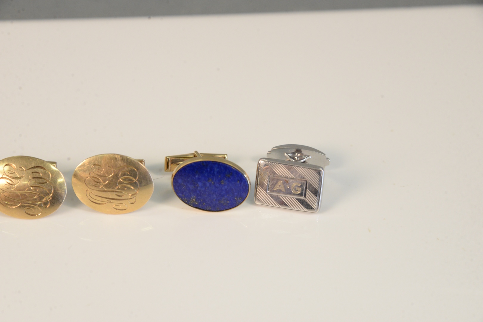 Lot 19: Three Pairs of 14 Karat Gold Cufflinks one white gold, one set with lapis 25.2 grams total weight