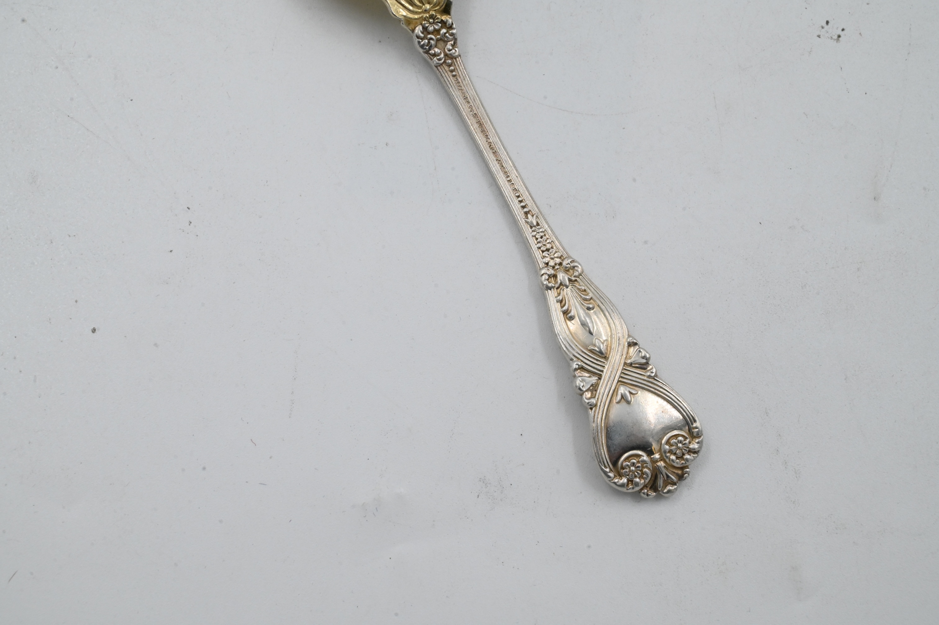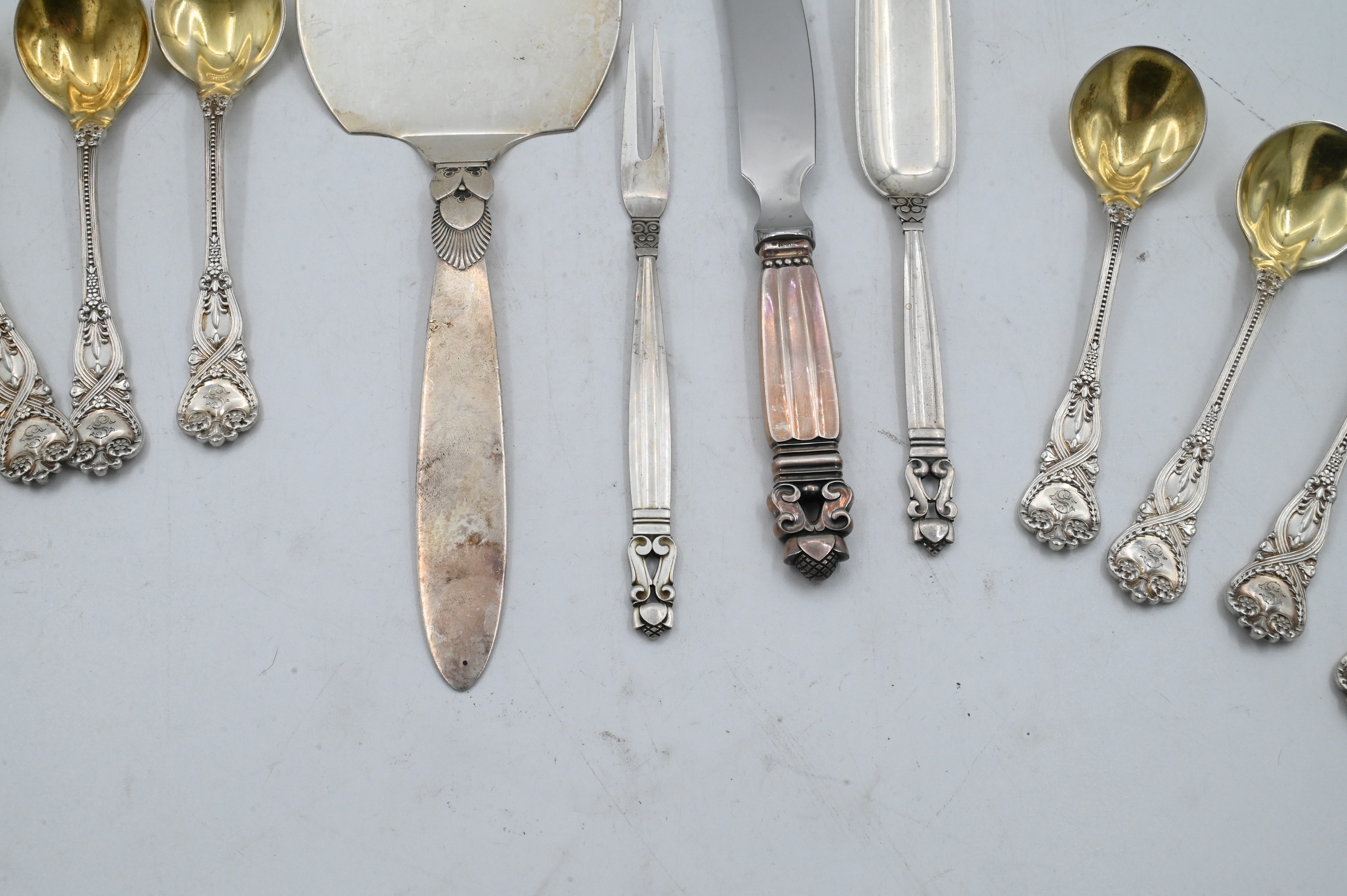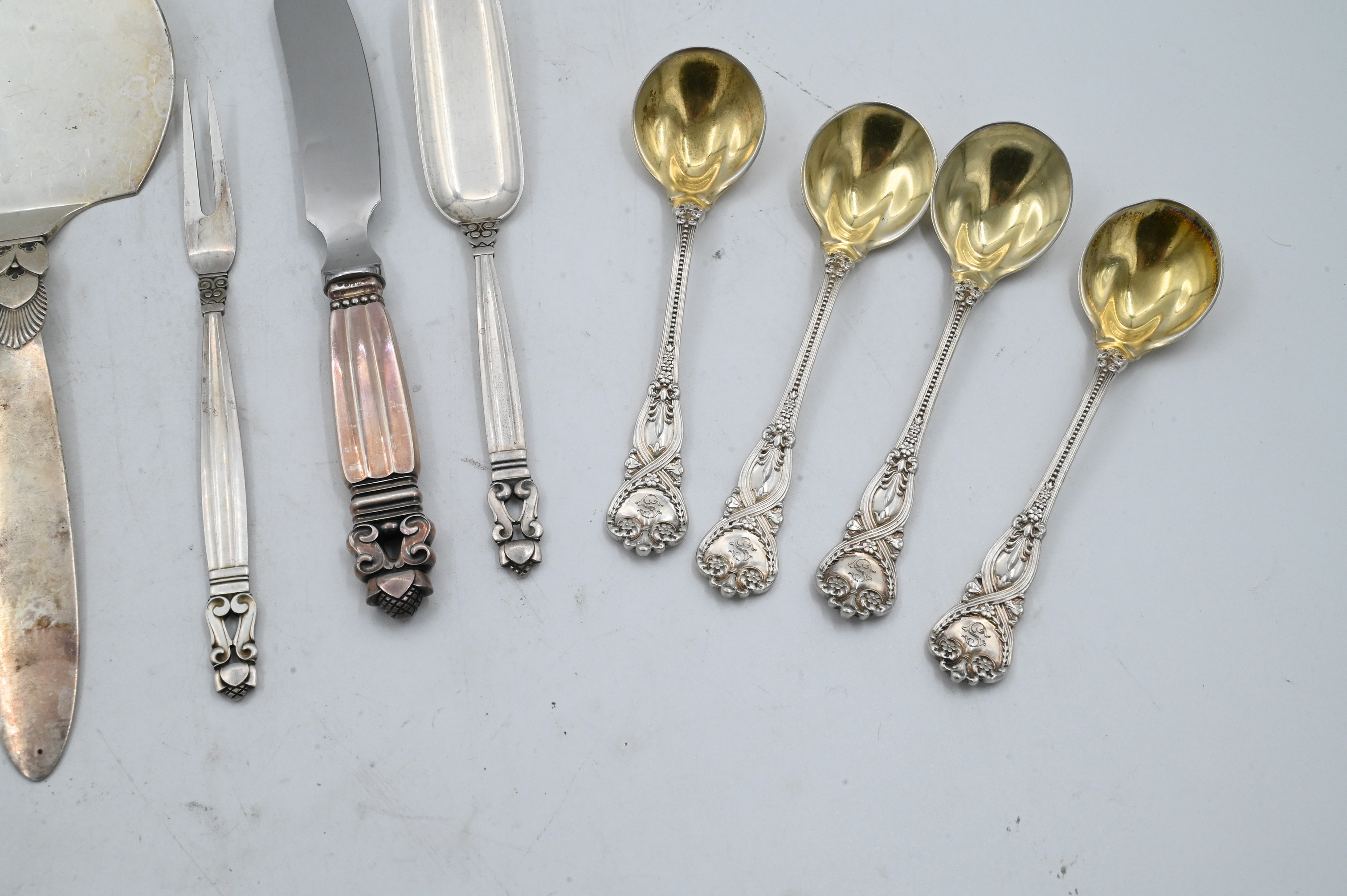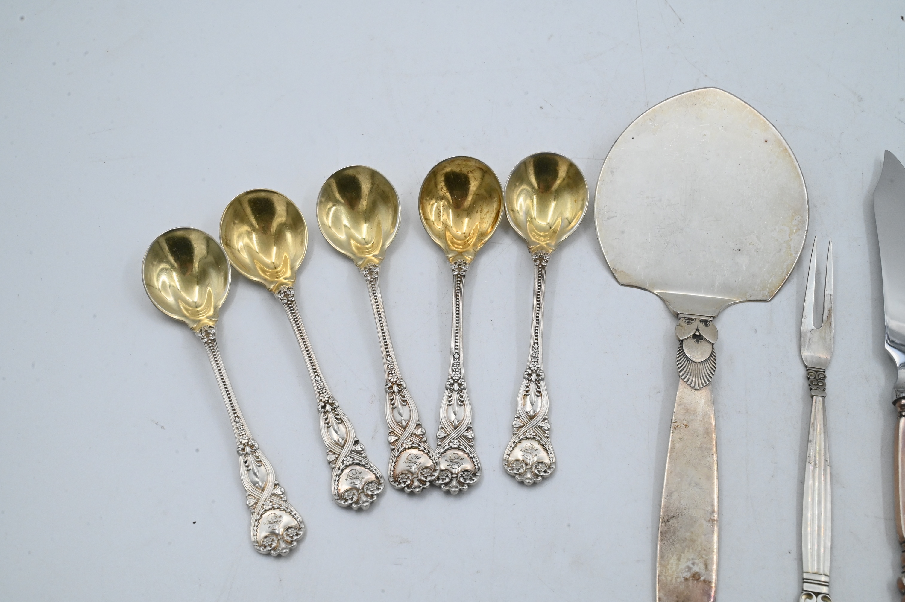 nine Tiffany St. James pattern gold washed spoons, Jensen four piece serving lot