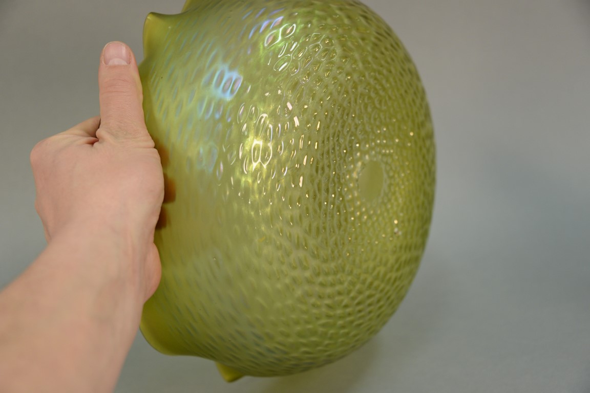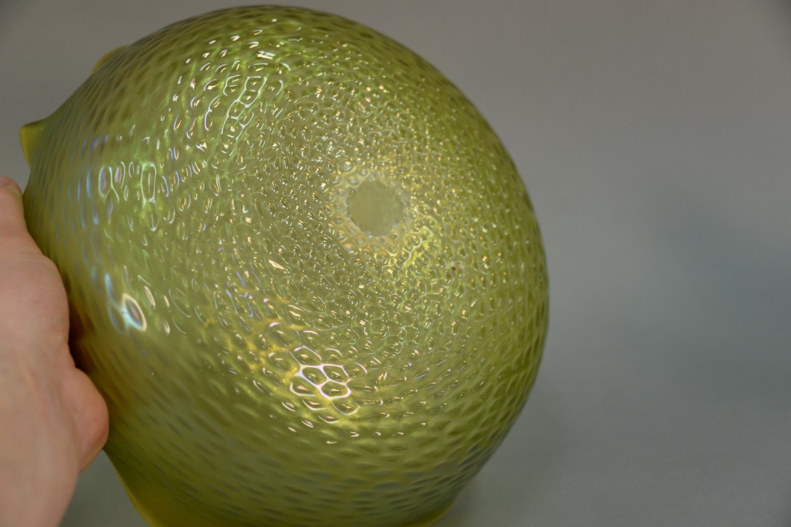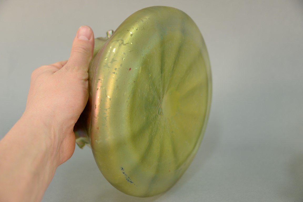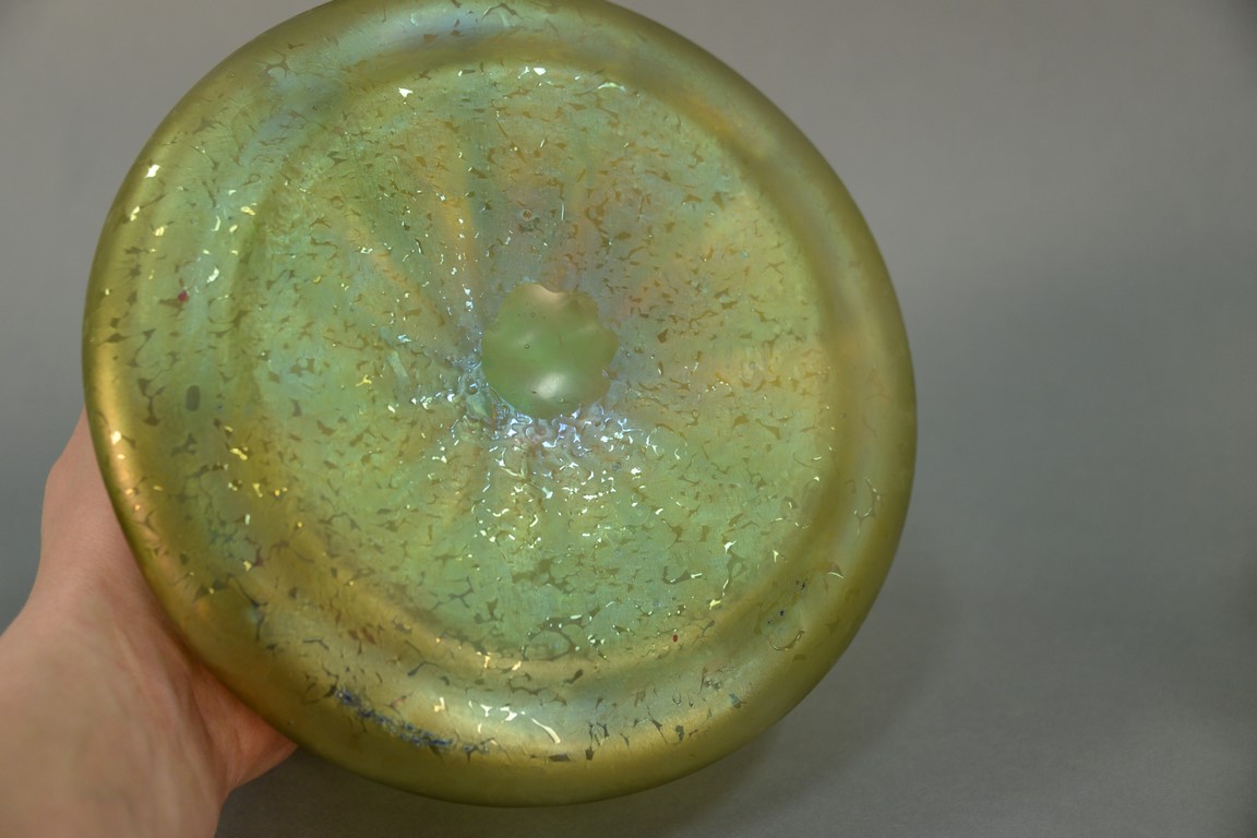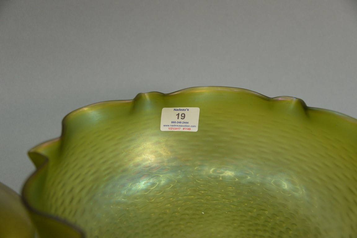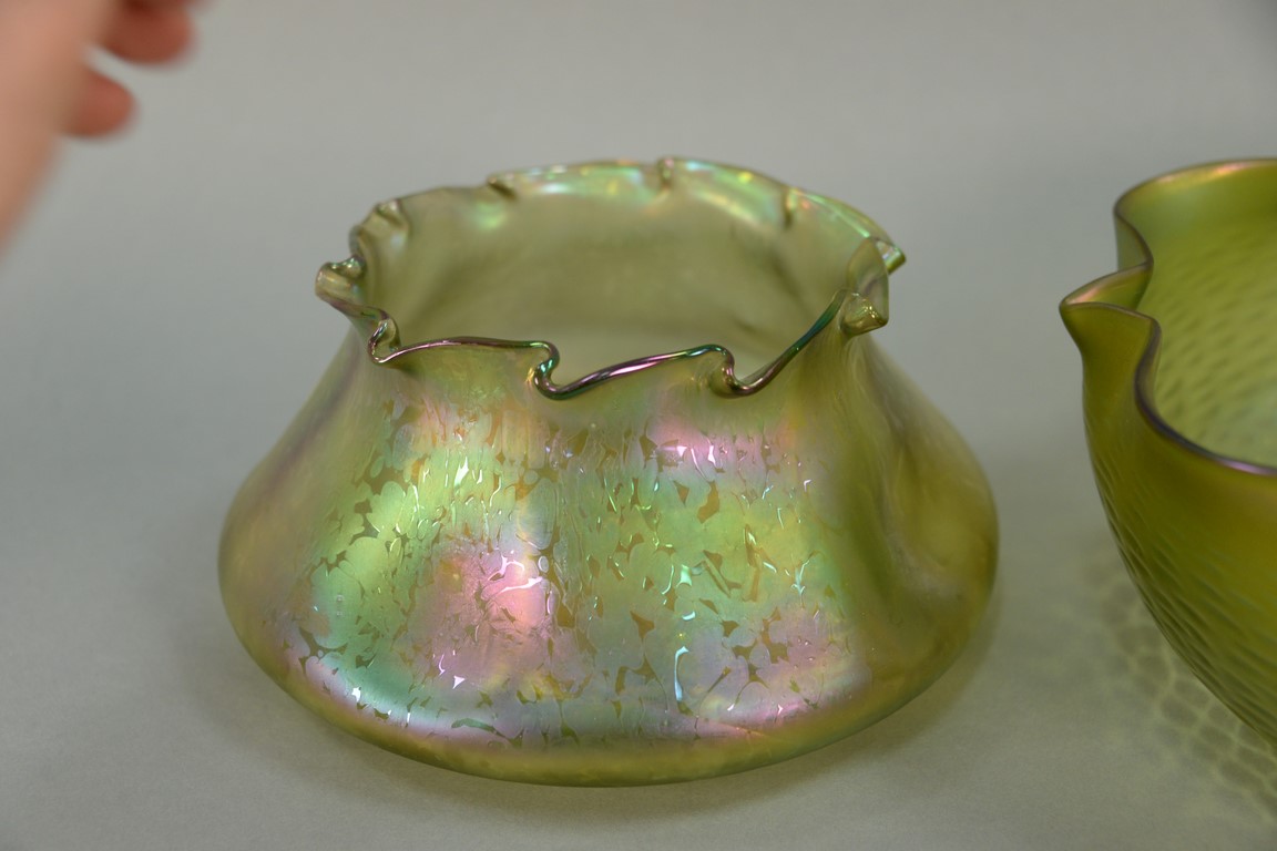 Lot 19: Two large art glass bowls with ruffled rims, Loetz or Kralik. ht. 4in., dia. 11 1/2in. and ht. 4 1/4in., dia. 5 3/4in.