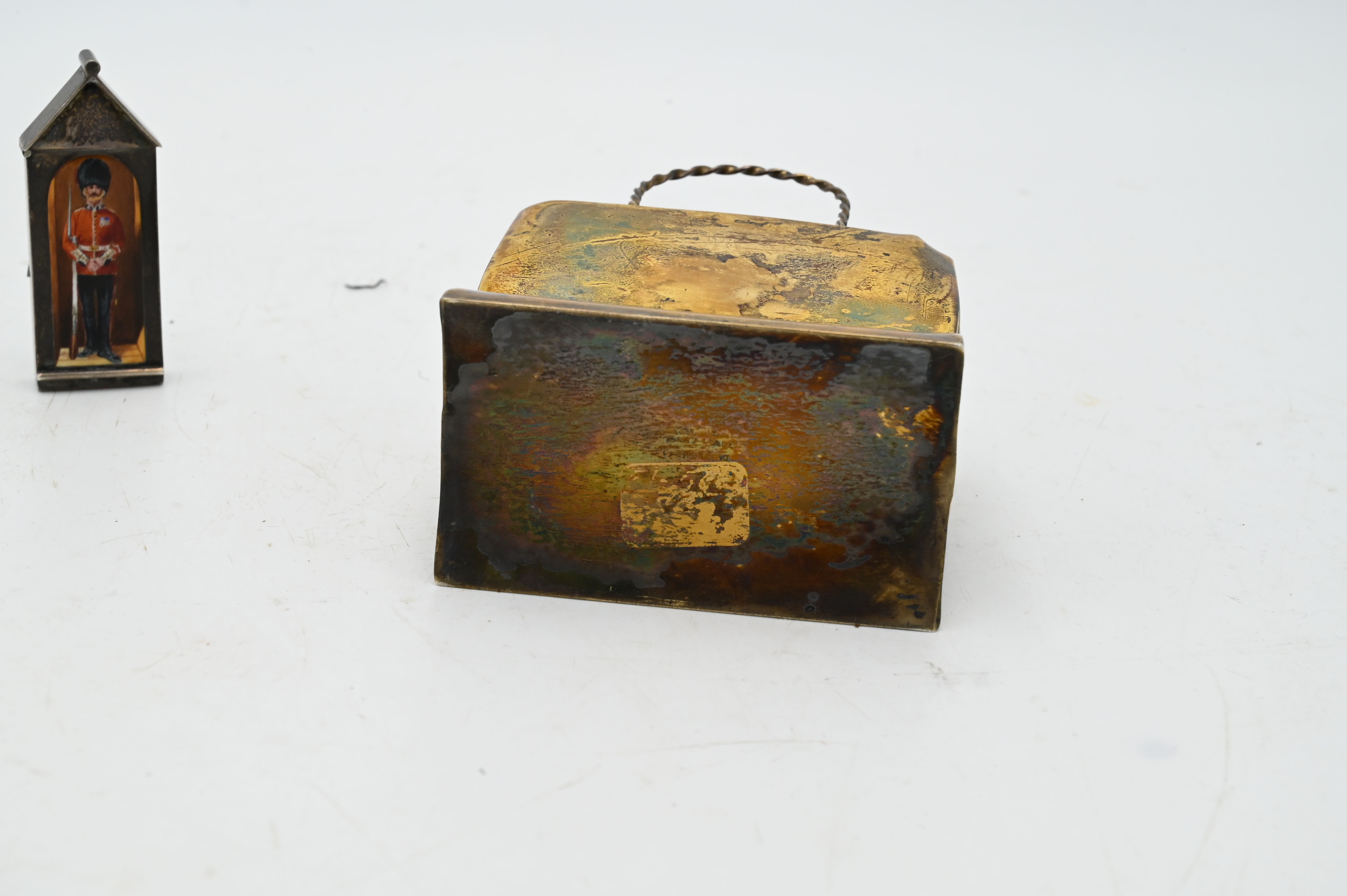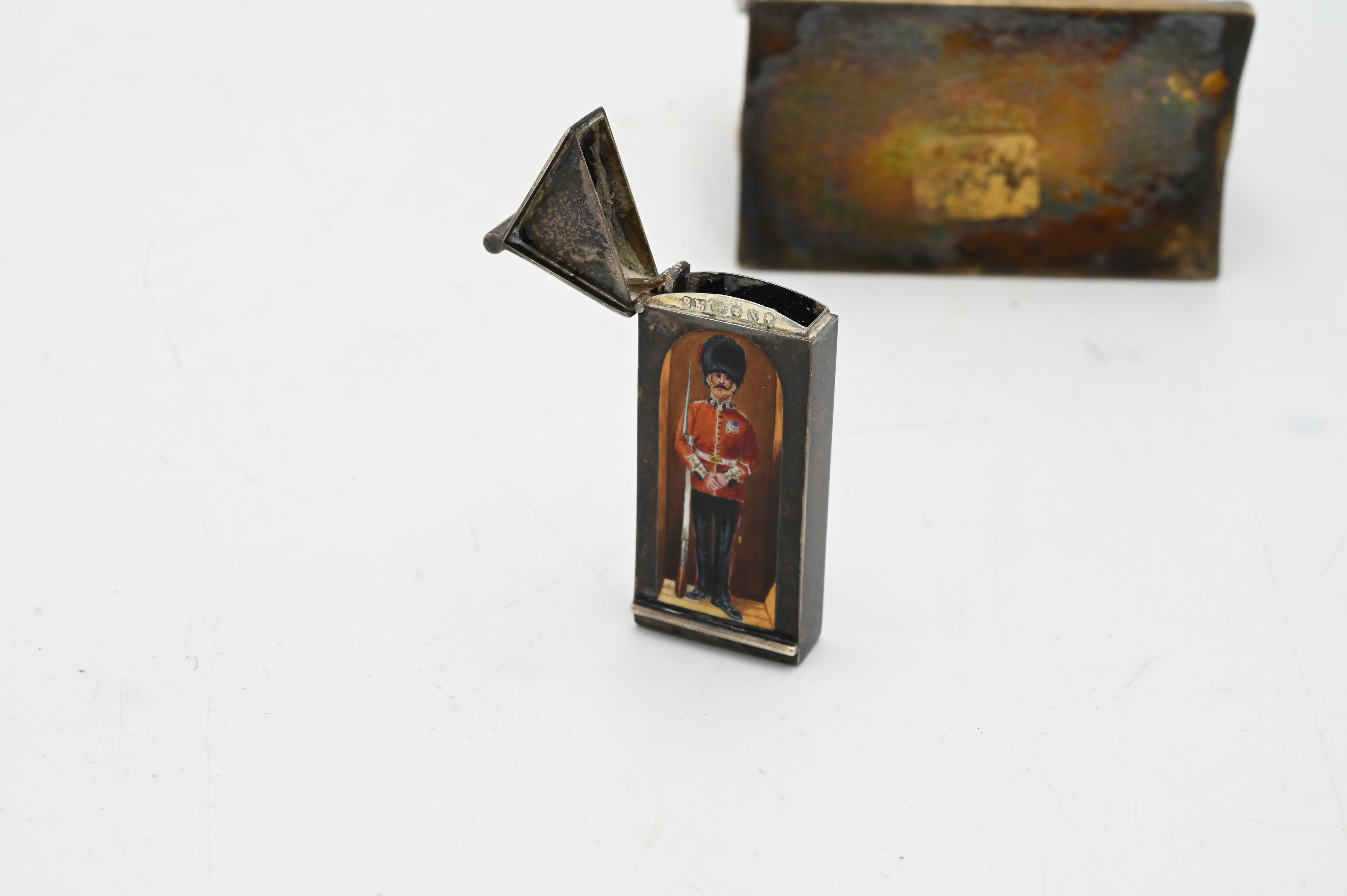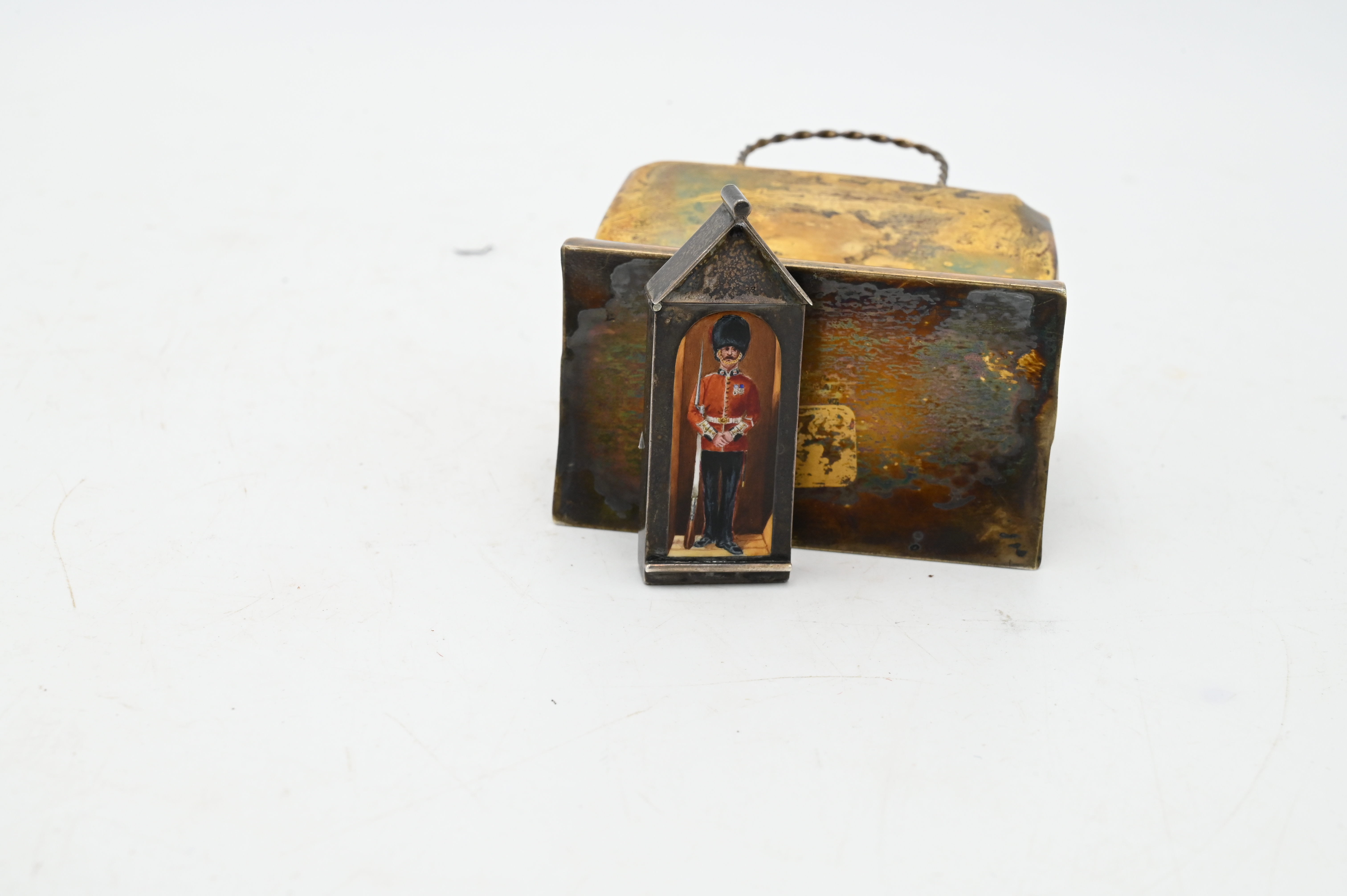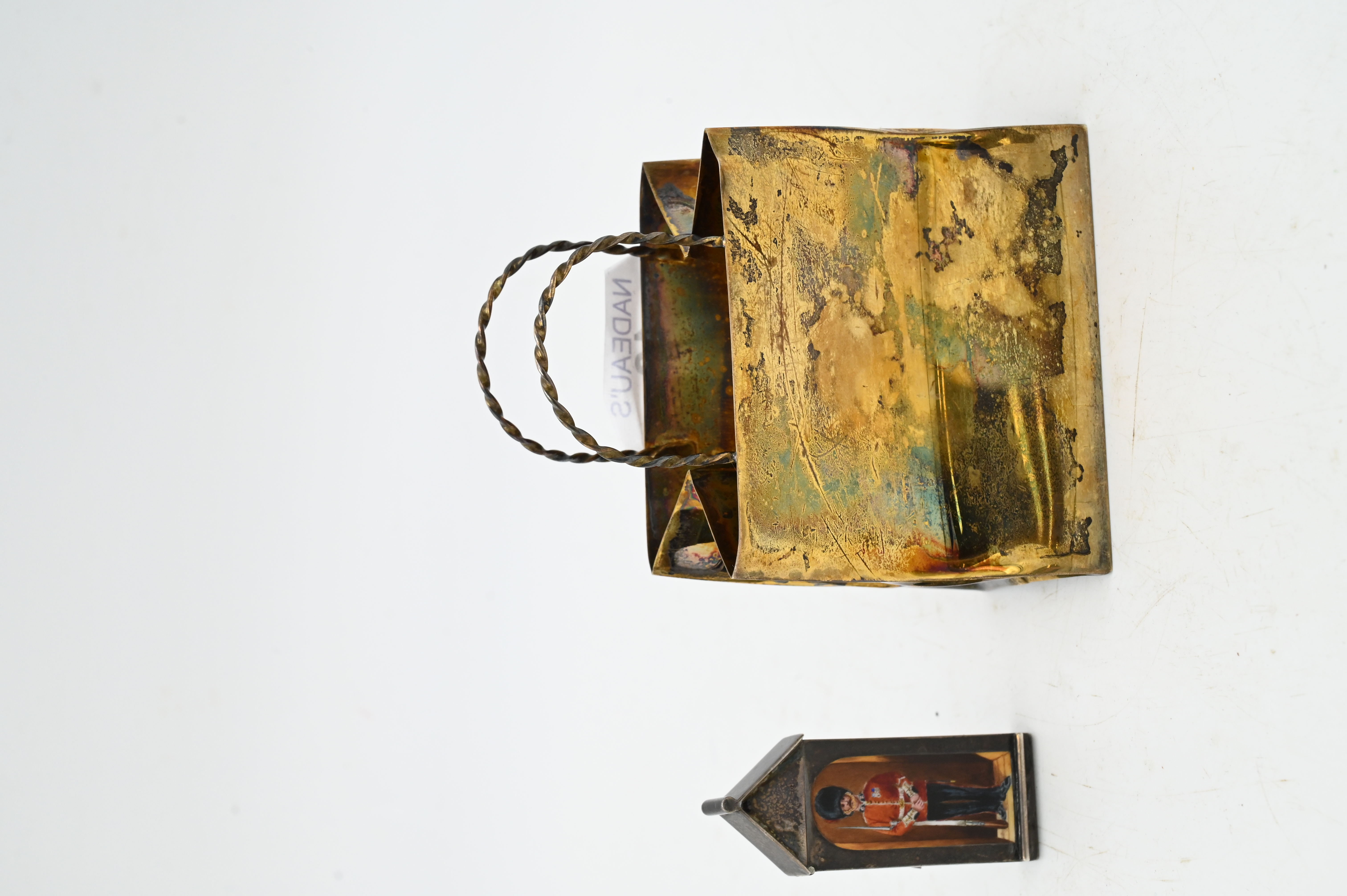 Two Piece Silver Lot, to include Cartier Sterling Silver mini shopping bag, along with silver enameled match safe of English Gavard House, heights of 4 inches and 2 3/8 inches, 3.4 t.oz.