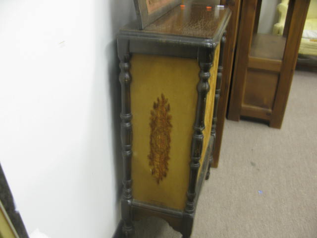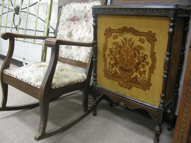 Two pieces including wicker platform rocker and a Victorian radio cabinet