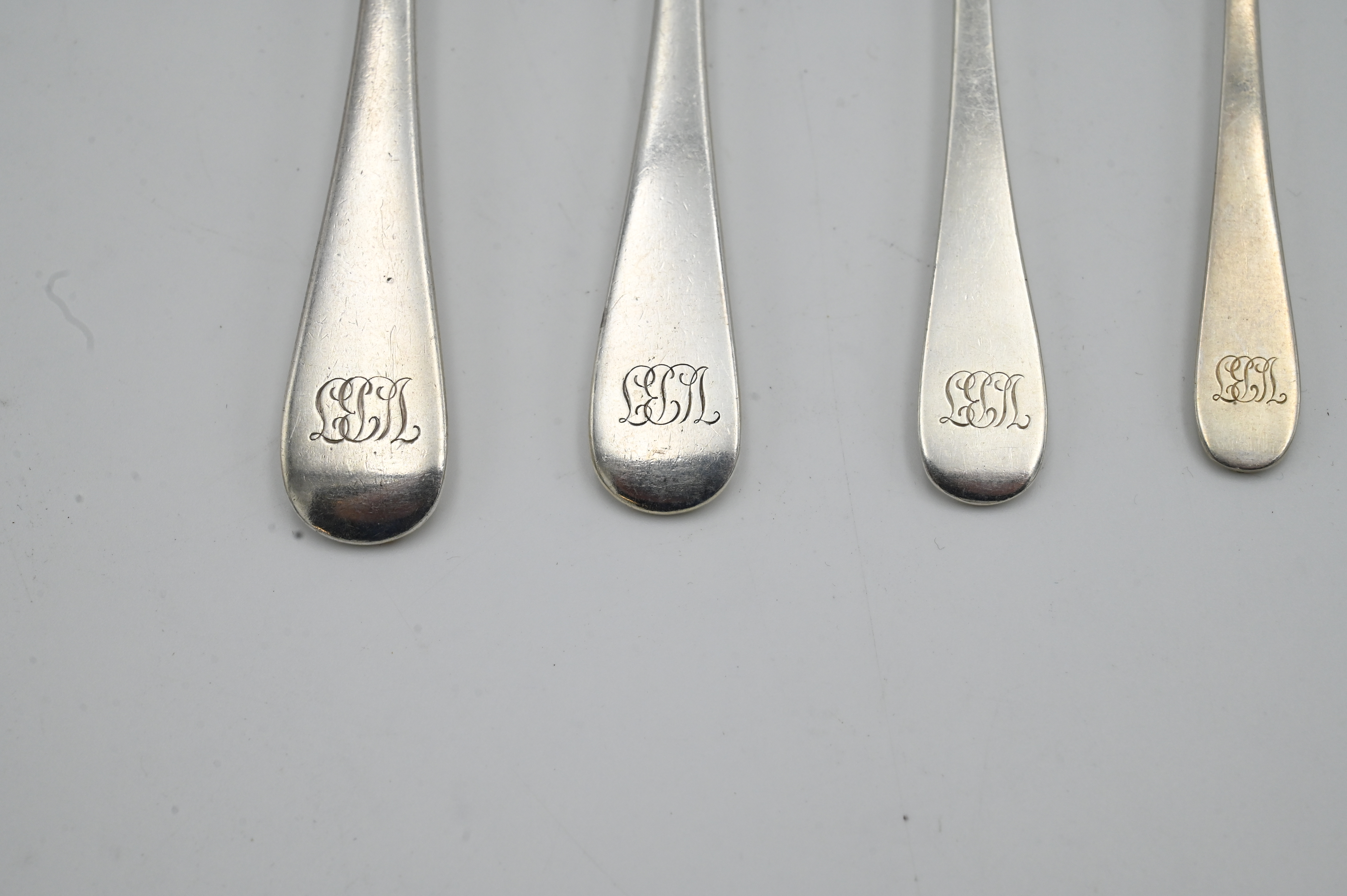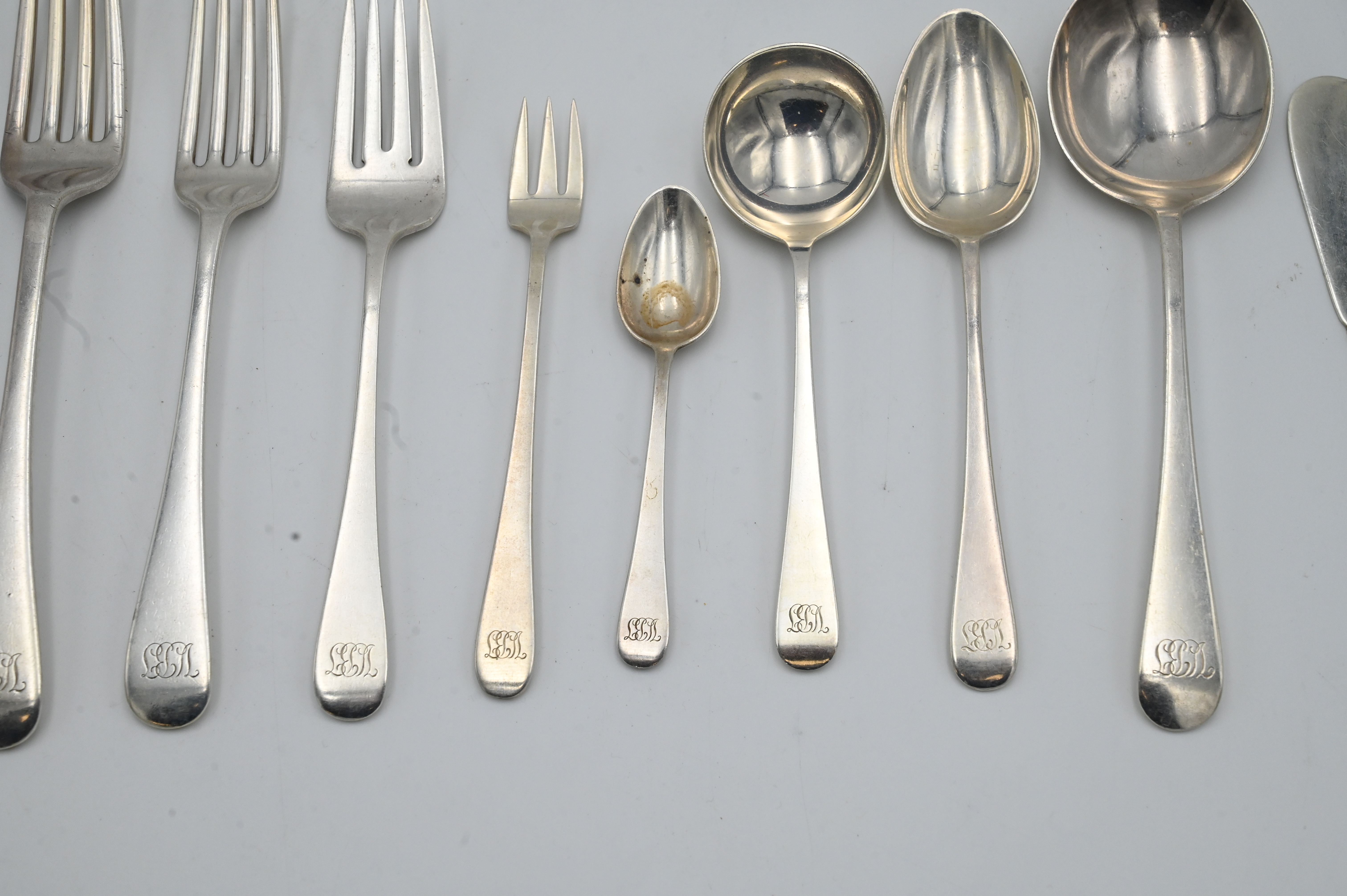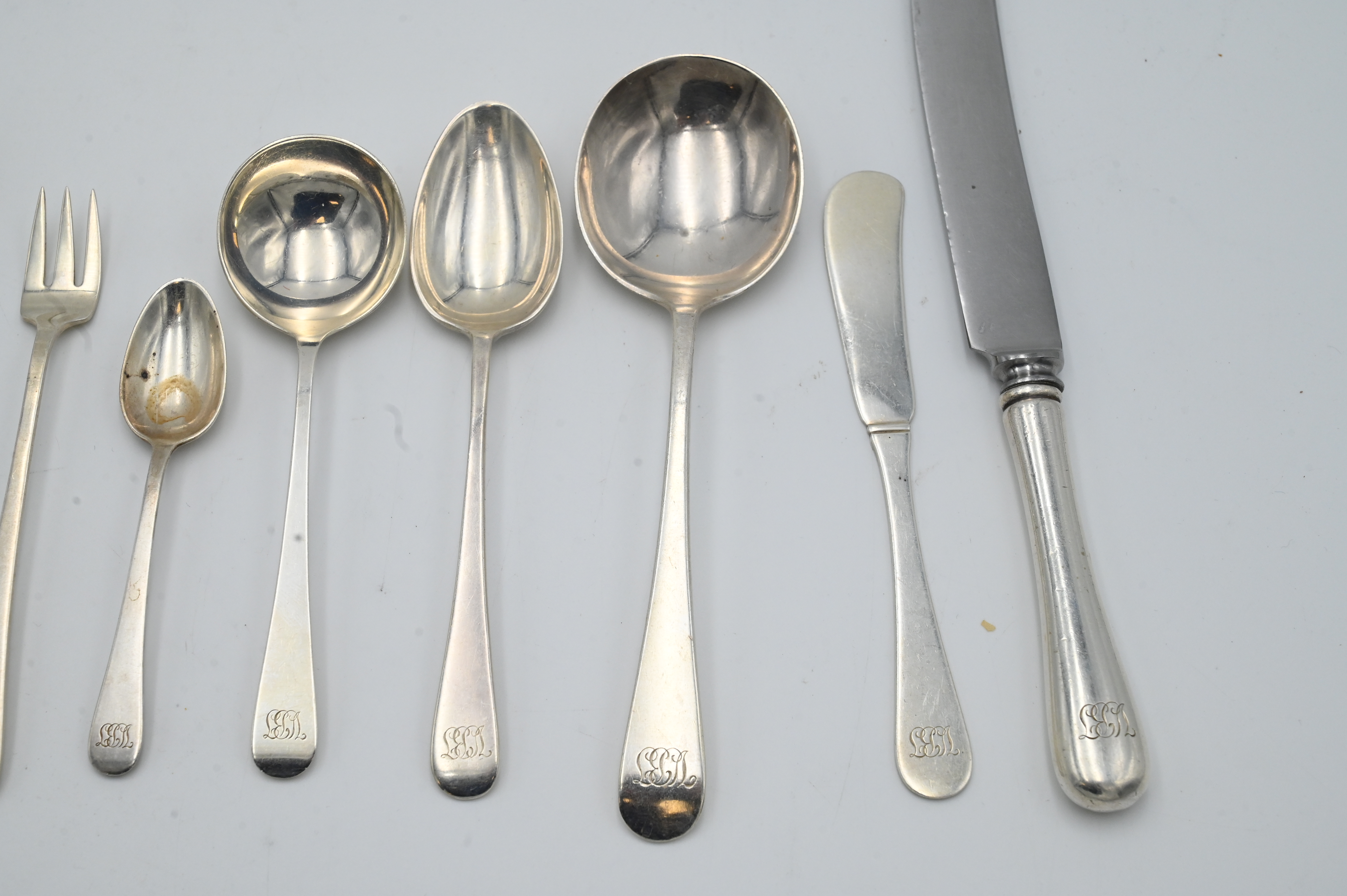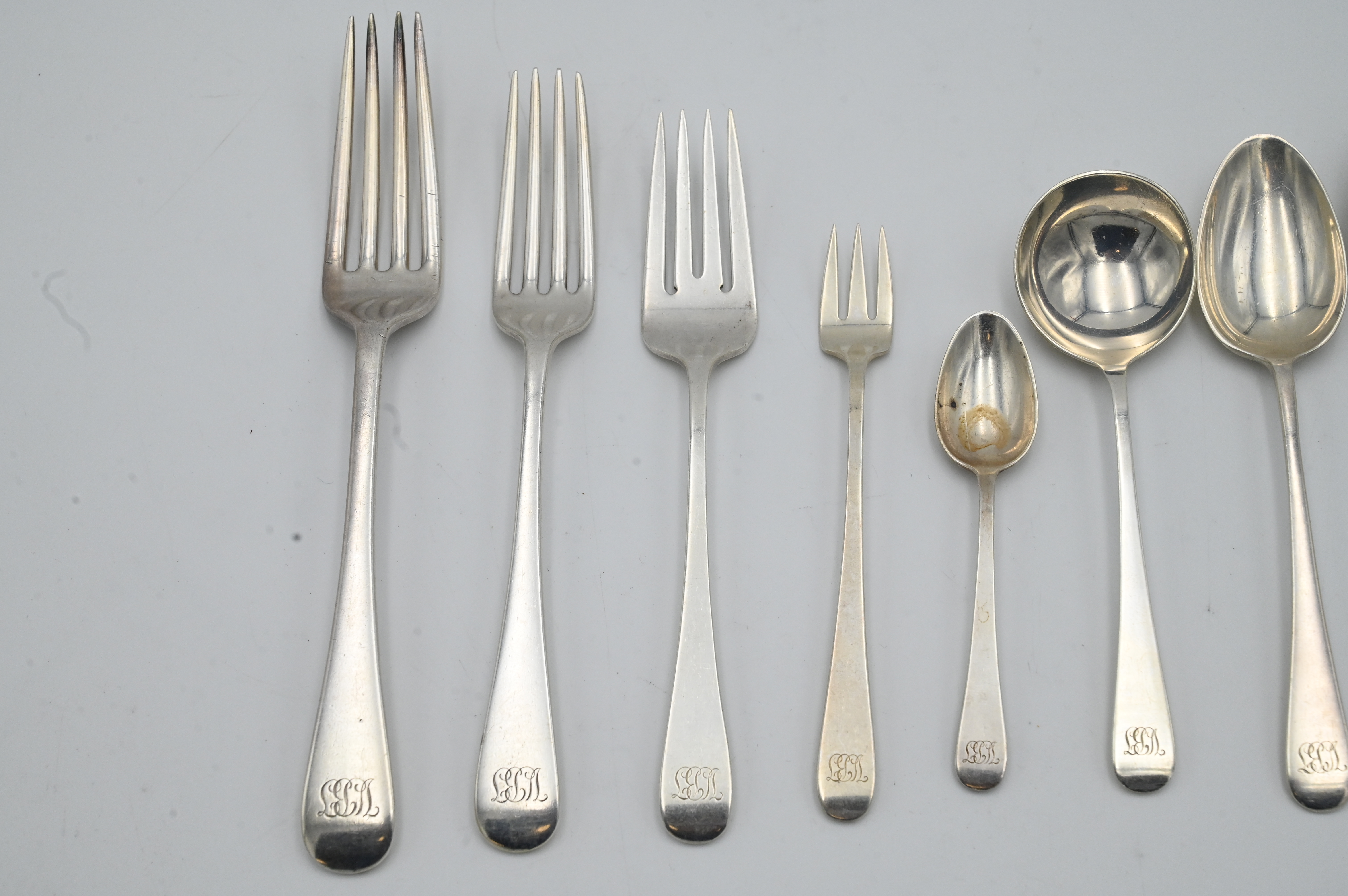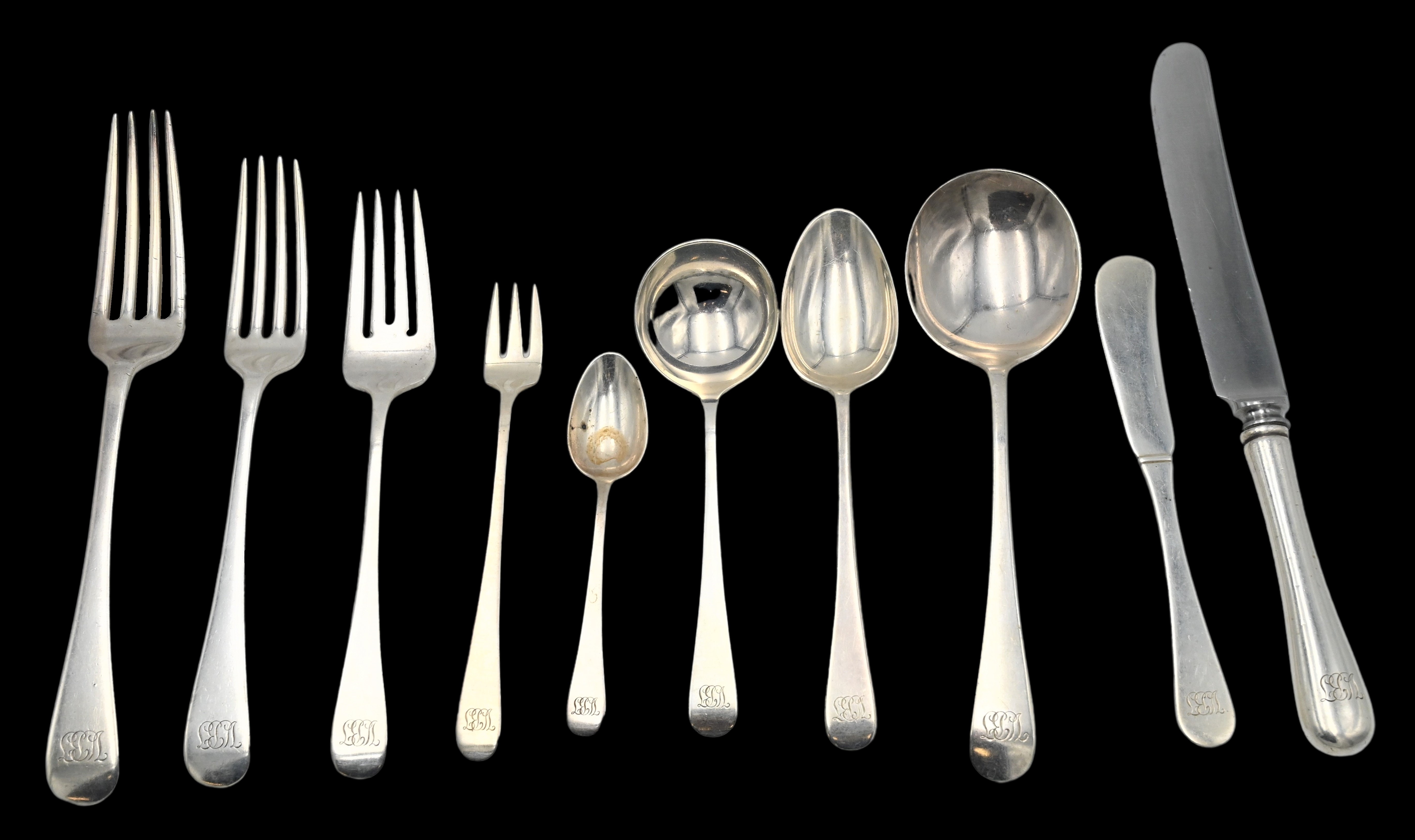 81 Piece English Sterling Silver Flatware, in ‘Old Maryland’ style pattern, 8 dinner forks, 8 lunch forks, 5 salad forks, 6 cocktail forks, 12 teaspoons, 6 soup spoons, 6 bouillon spoons, 4 demitasse spoons, 4 butter knives, 7 dinner knives, 7 lunch knives, 8 serving pieces, 74.2 t.oz., along with 19 weighted handles.