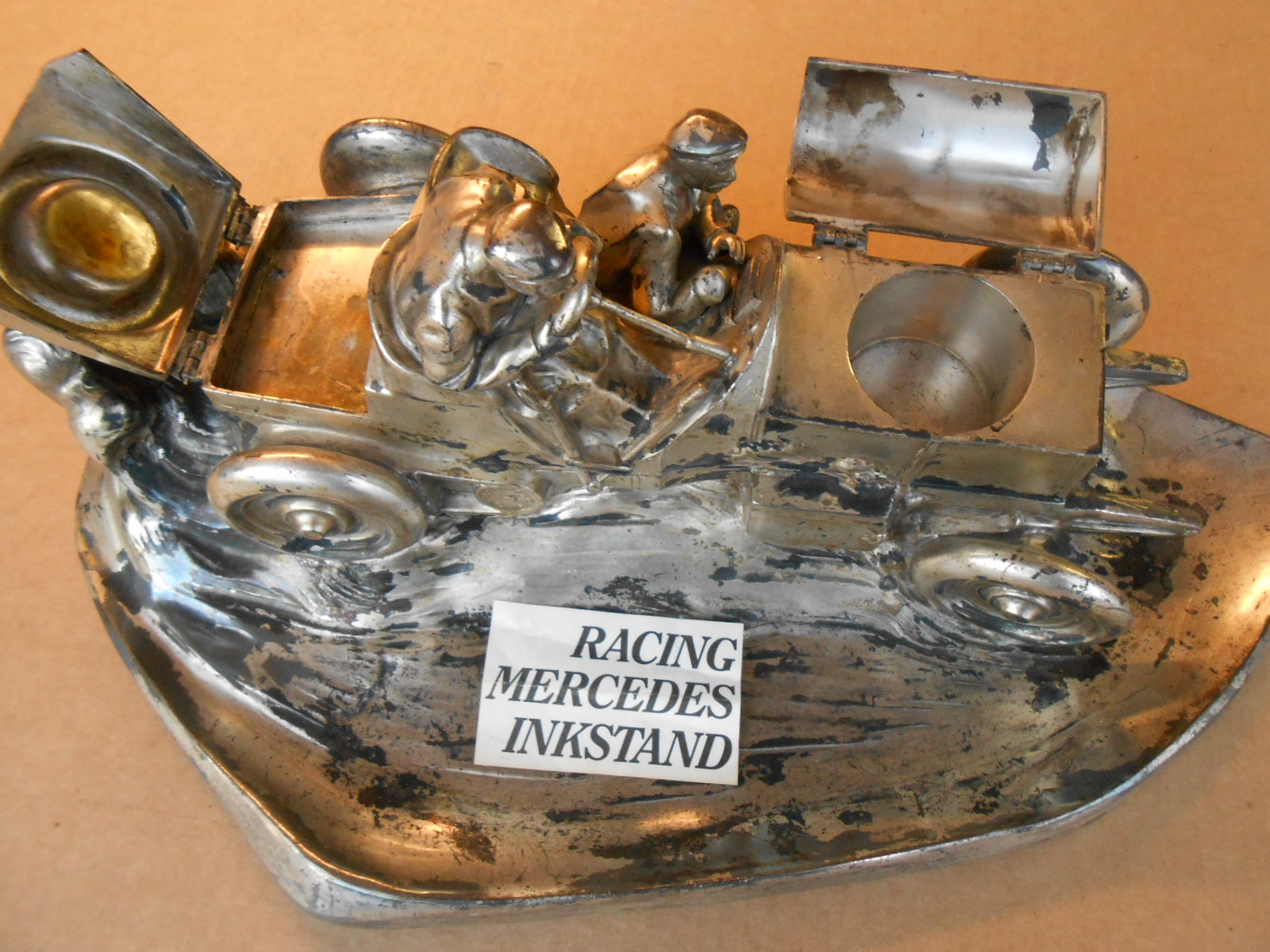 Lot 190: Cast metal desk caddy, Mercedes chain drive car at speed, 16 lg x 9 wide, 2 cover open, marked Kayser