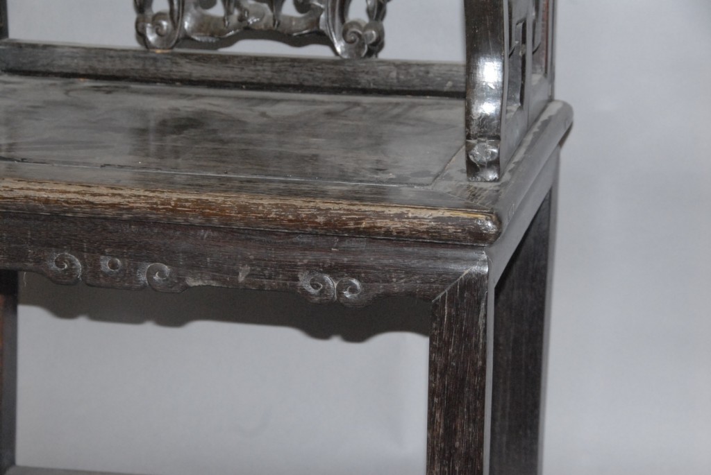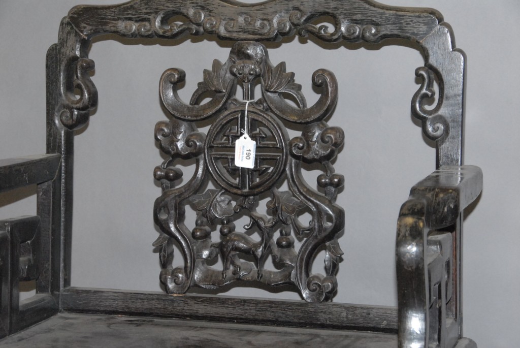 Chinese carved hardwood armchair with pierced carved back and sides, ht. of seat 20, wd. 25.