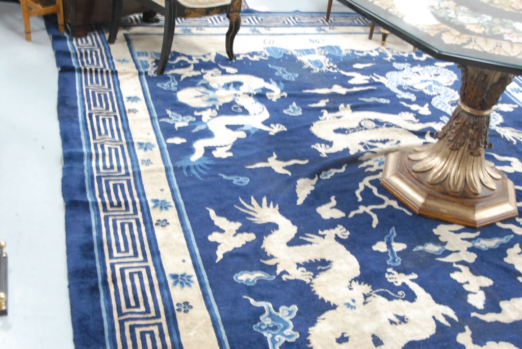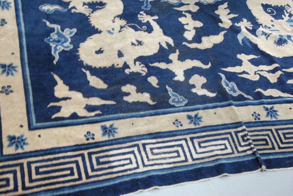 Chinese Peking Oriental carpet with clouds and dragons some wear. 9′ x 11′ 5