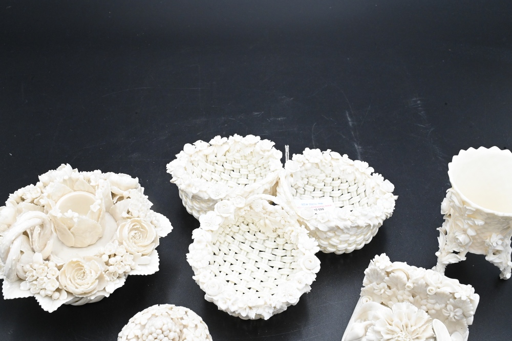 Five Belleek Encrusted Flower Pieces, to include a small box, triple bowl with handles, card holder, candlestick, along with a small vase; three having black marks, two with embossed Belleek marks; tallest 3 1/2 inches. Provenance: Collections of Norma Reilly, New Jersey.