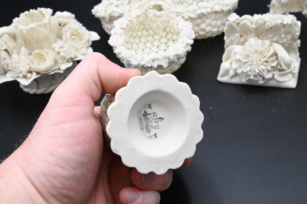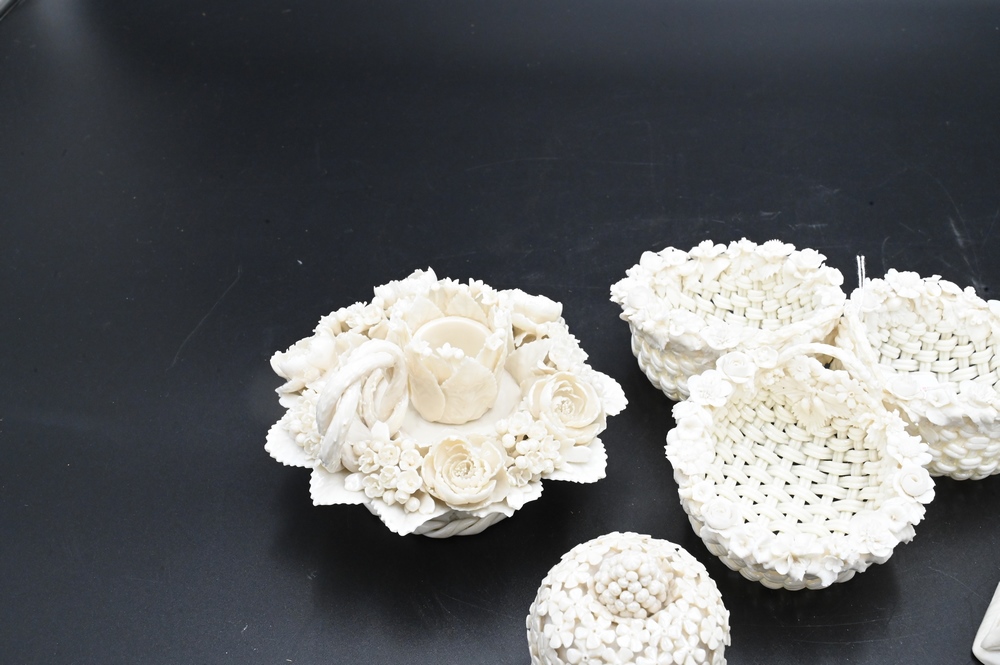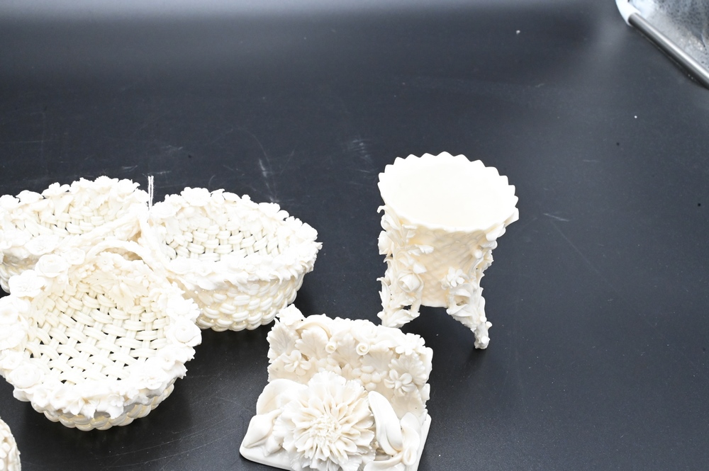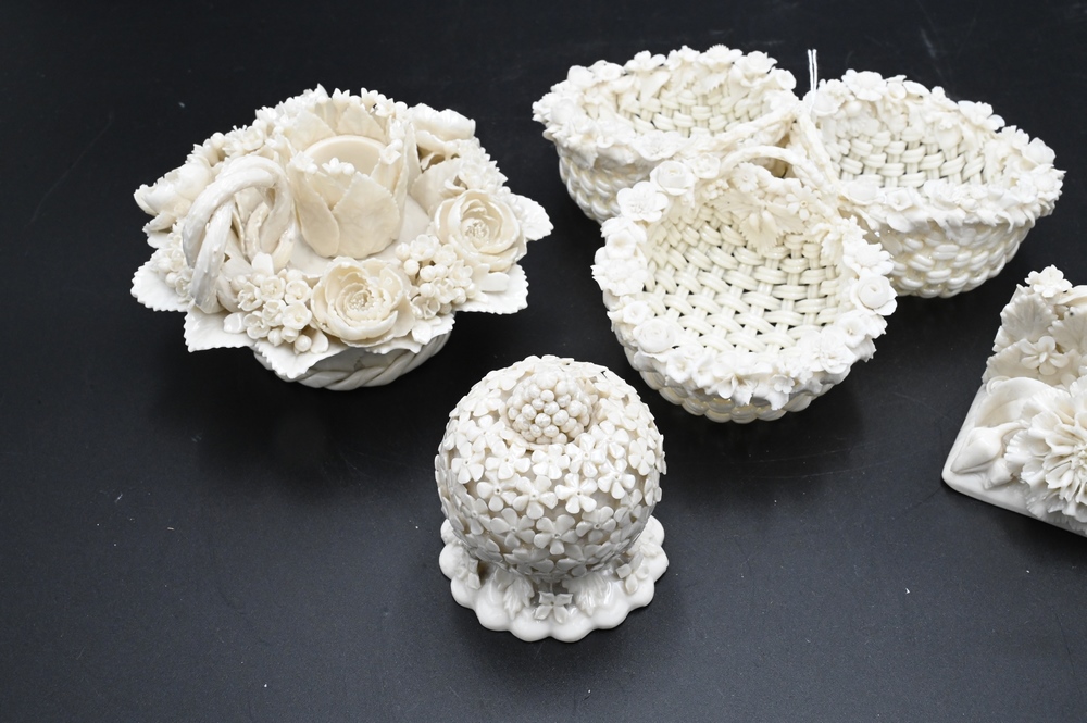 Lot 190: Five Belleek Encrusted Flower Pieces, to include a small box, triple bowl with handles, card holder, candlestick, along with a small vase; three having black marks, two with embossed Belleek marks; tallest 3 1/2 inches. Provenance: Collections of Norma Reilly, New Jersey.
