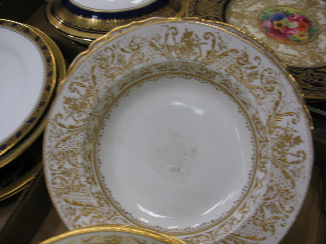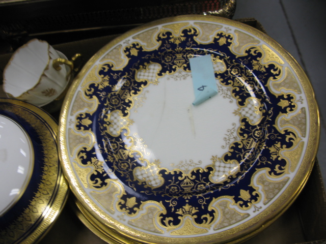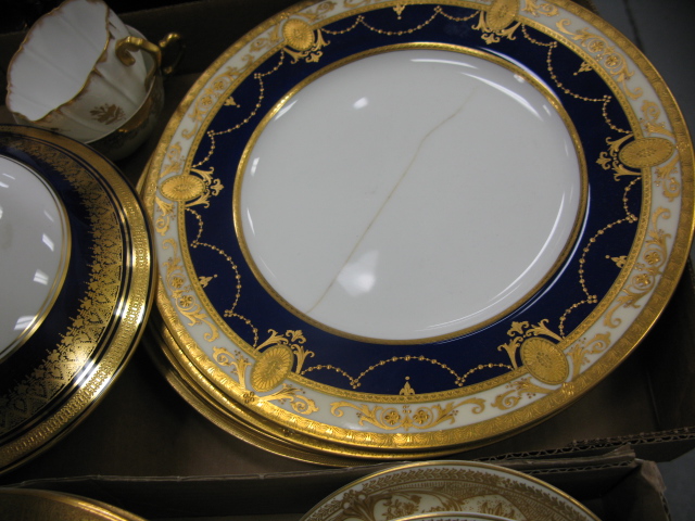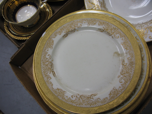 Four box lots of various plates, cups, saucers, including Ainsley, gold band china, Limoges, one Minton plate, as is.