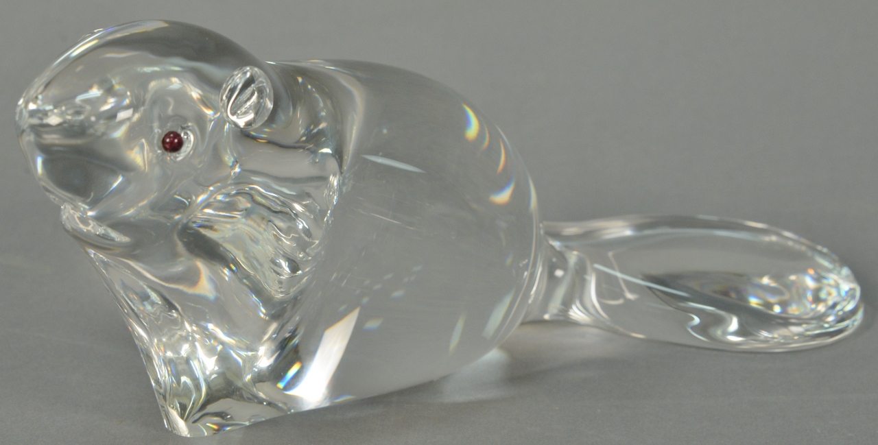 Large Steuben crystal beaver figurine with red glass eyes, signed Steuben. lg. 10in.