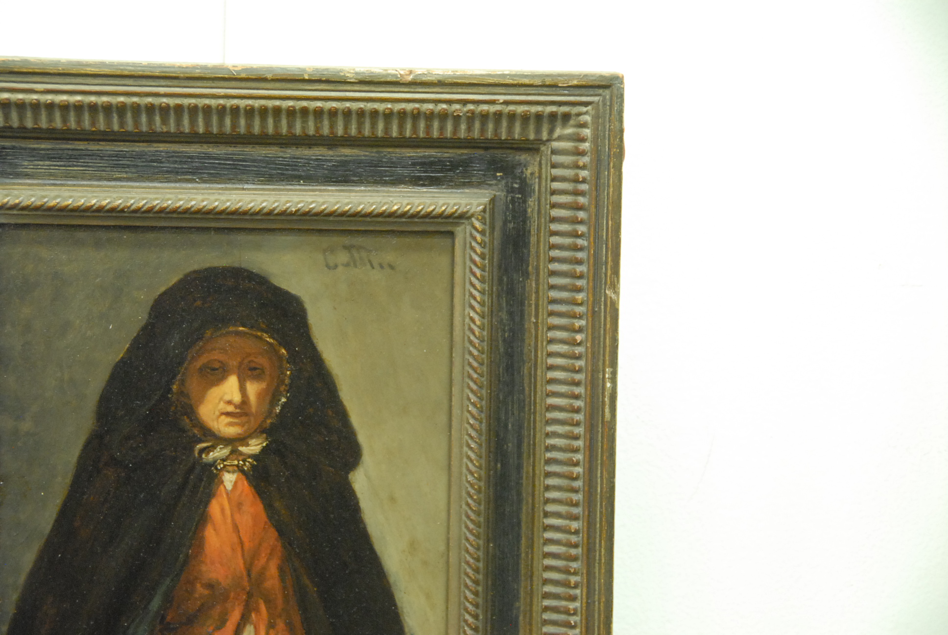 Oil on board of an old French woman holding a bucket Pour L’Hos, signed top right indistinctly.