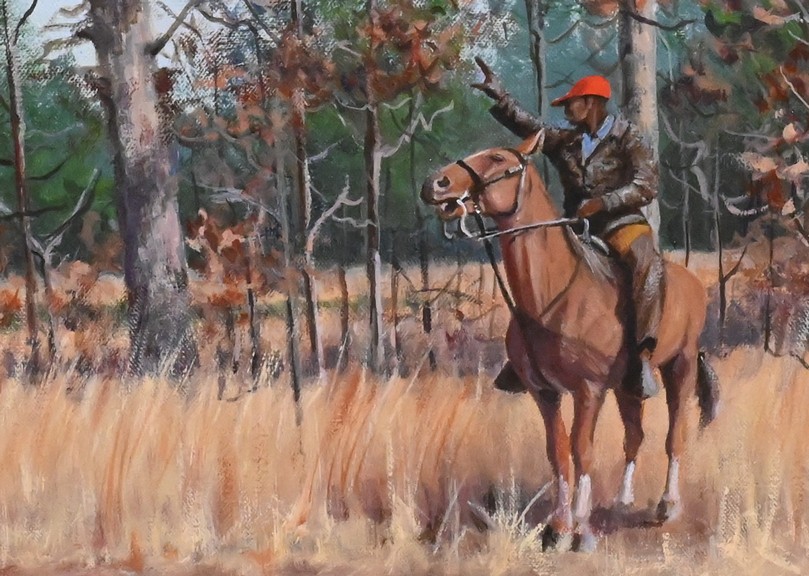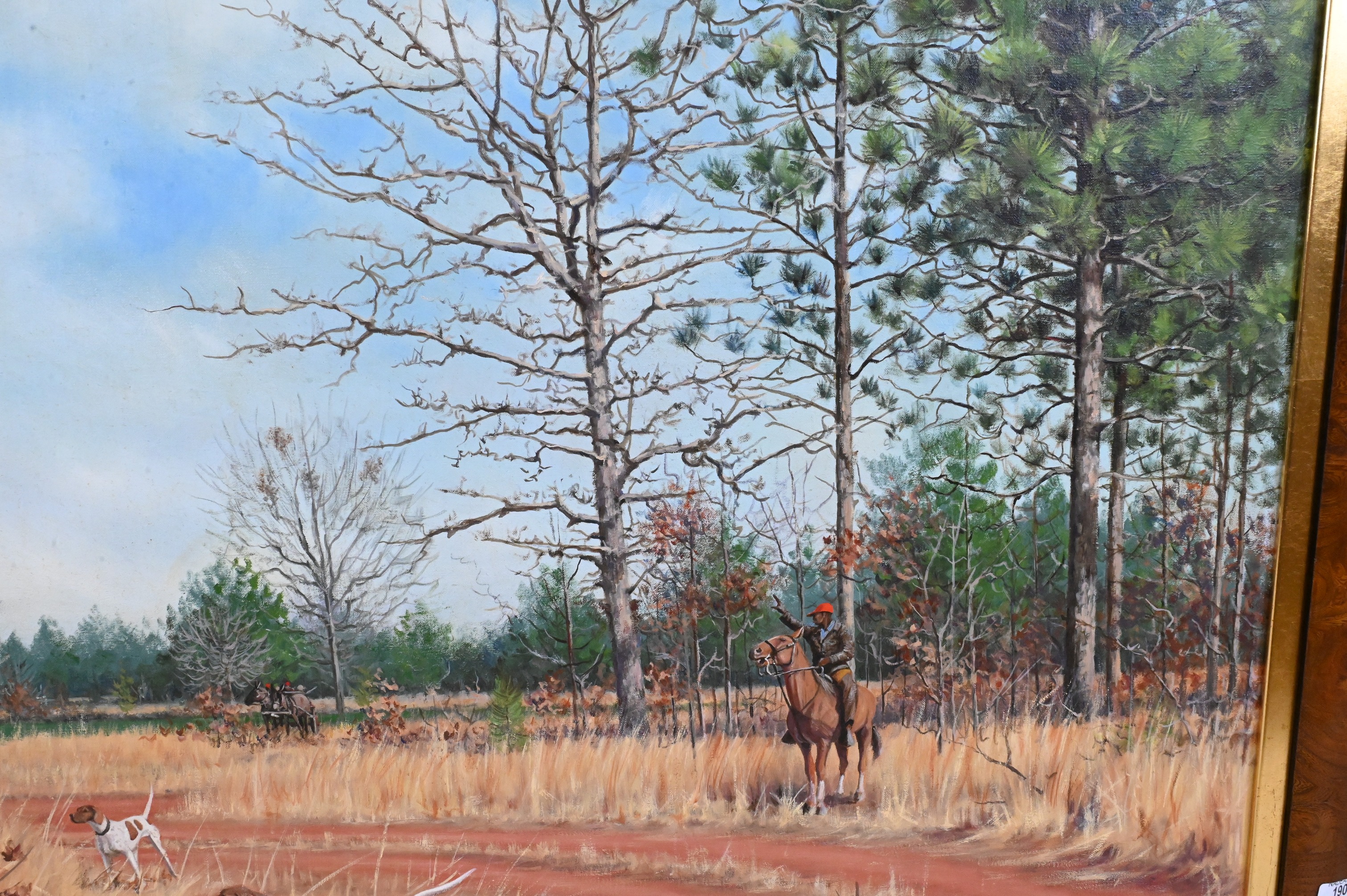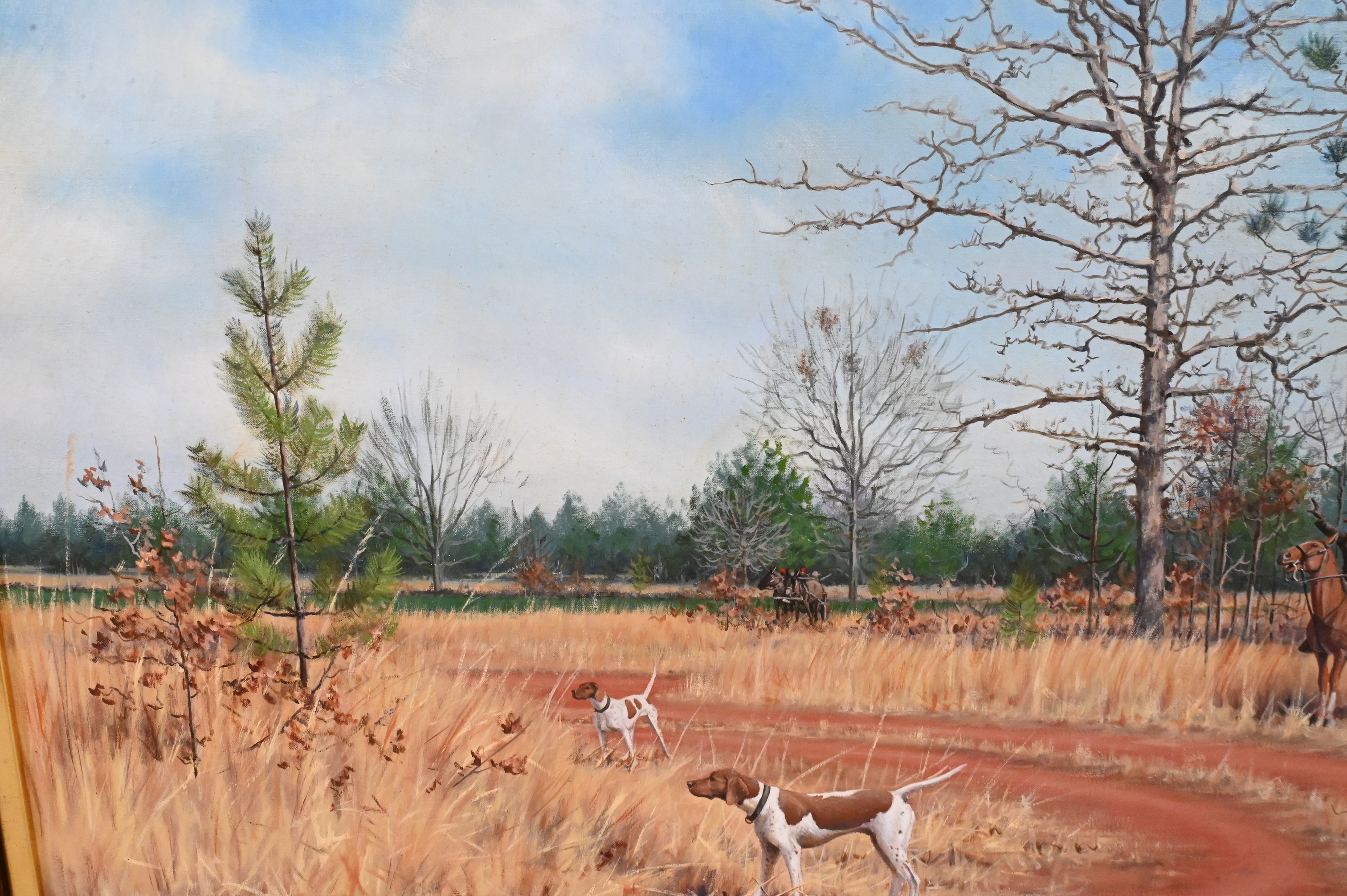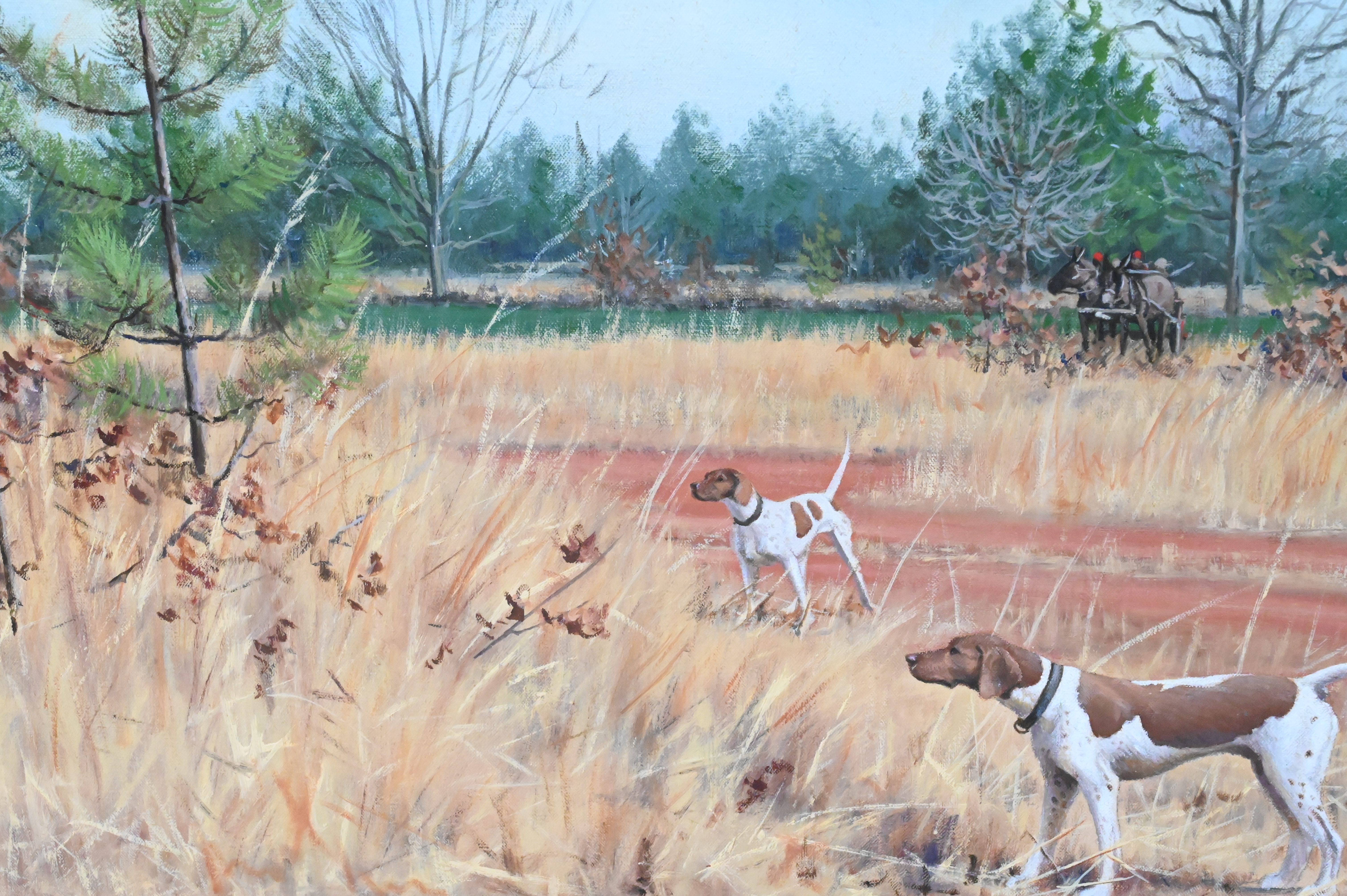 Depicting two pointers on a red dirt track in a grassy field, alert to game, with deer visible in the distance near a treeline. A bright Southern sporting landscape in the tradition of American wildlife art.
