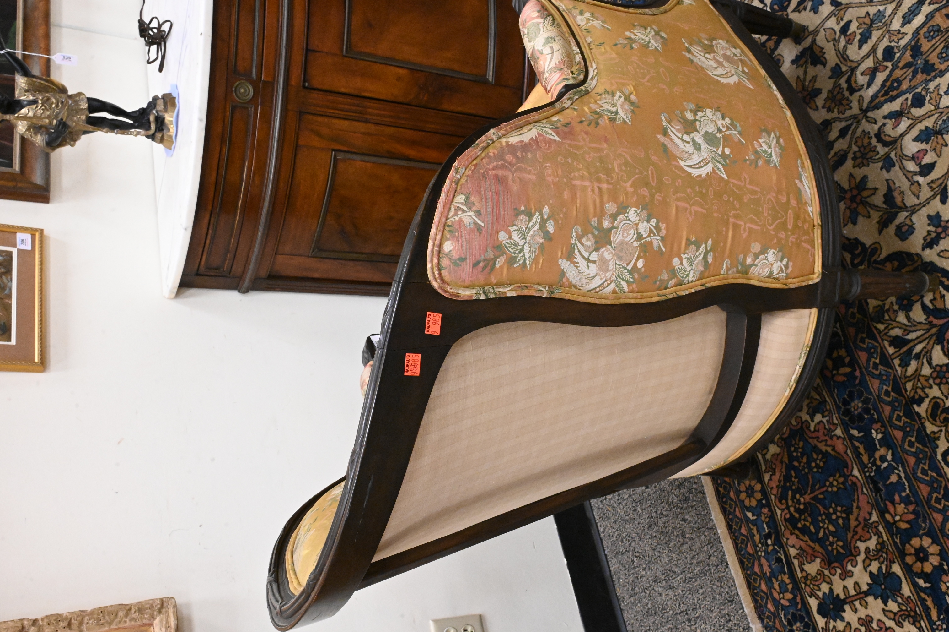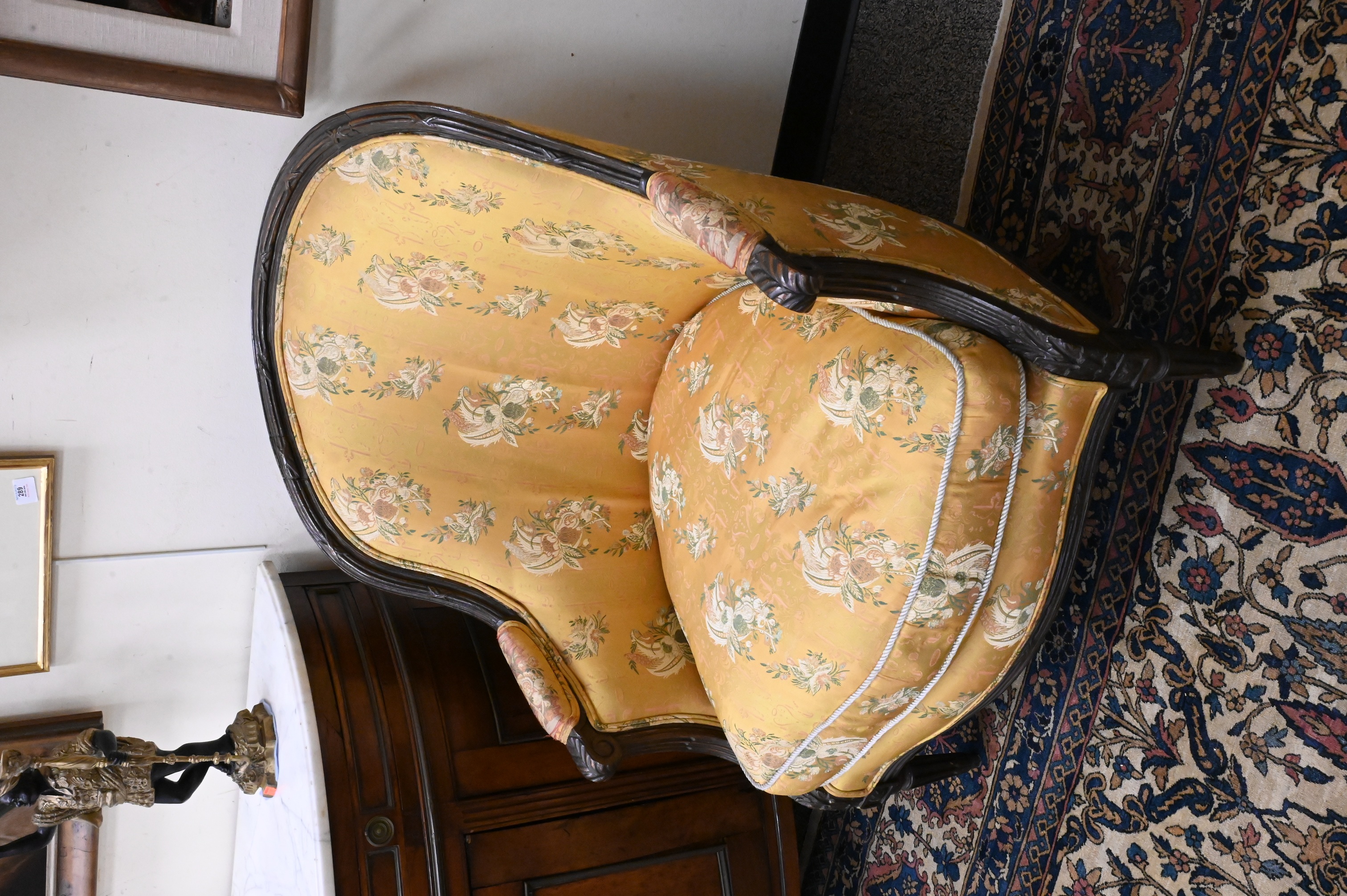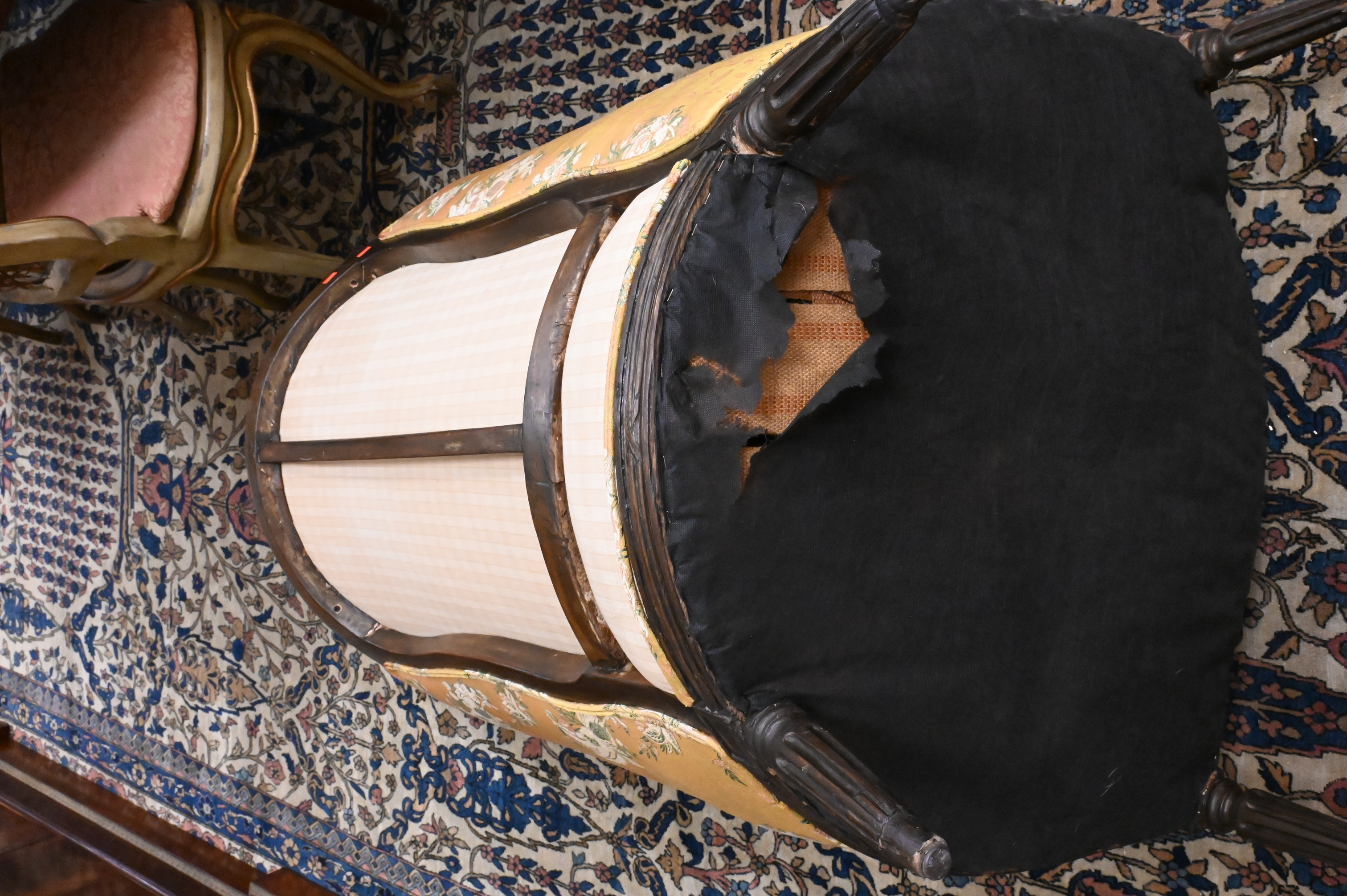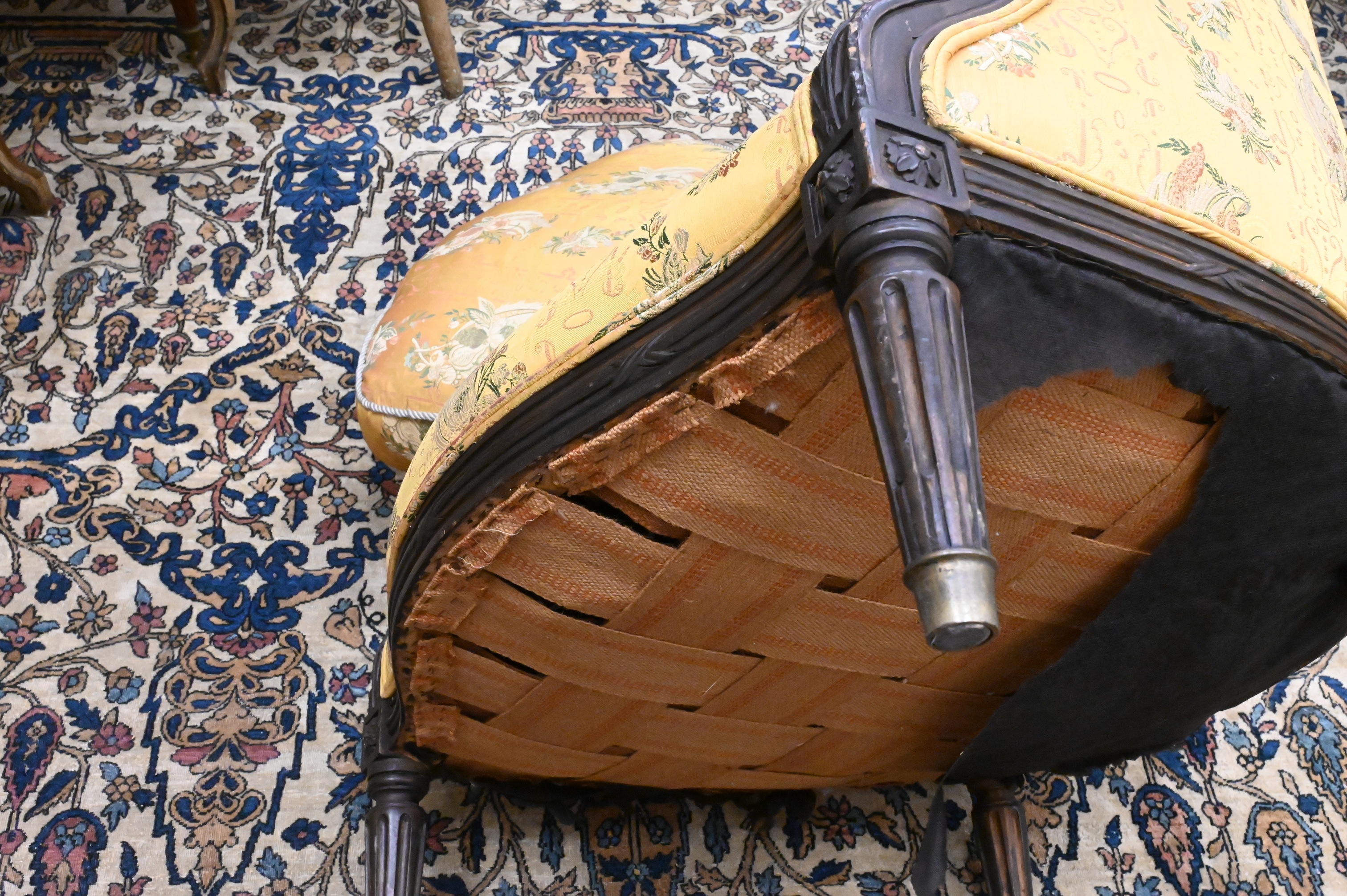 each with arched back, molded frame, and fluted legs, upholstered in yellow floral patterned silk with loose seat cushions and piped trim, the frames in dark painted finish with carved rosettes and foliate details, circa 1900