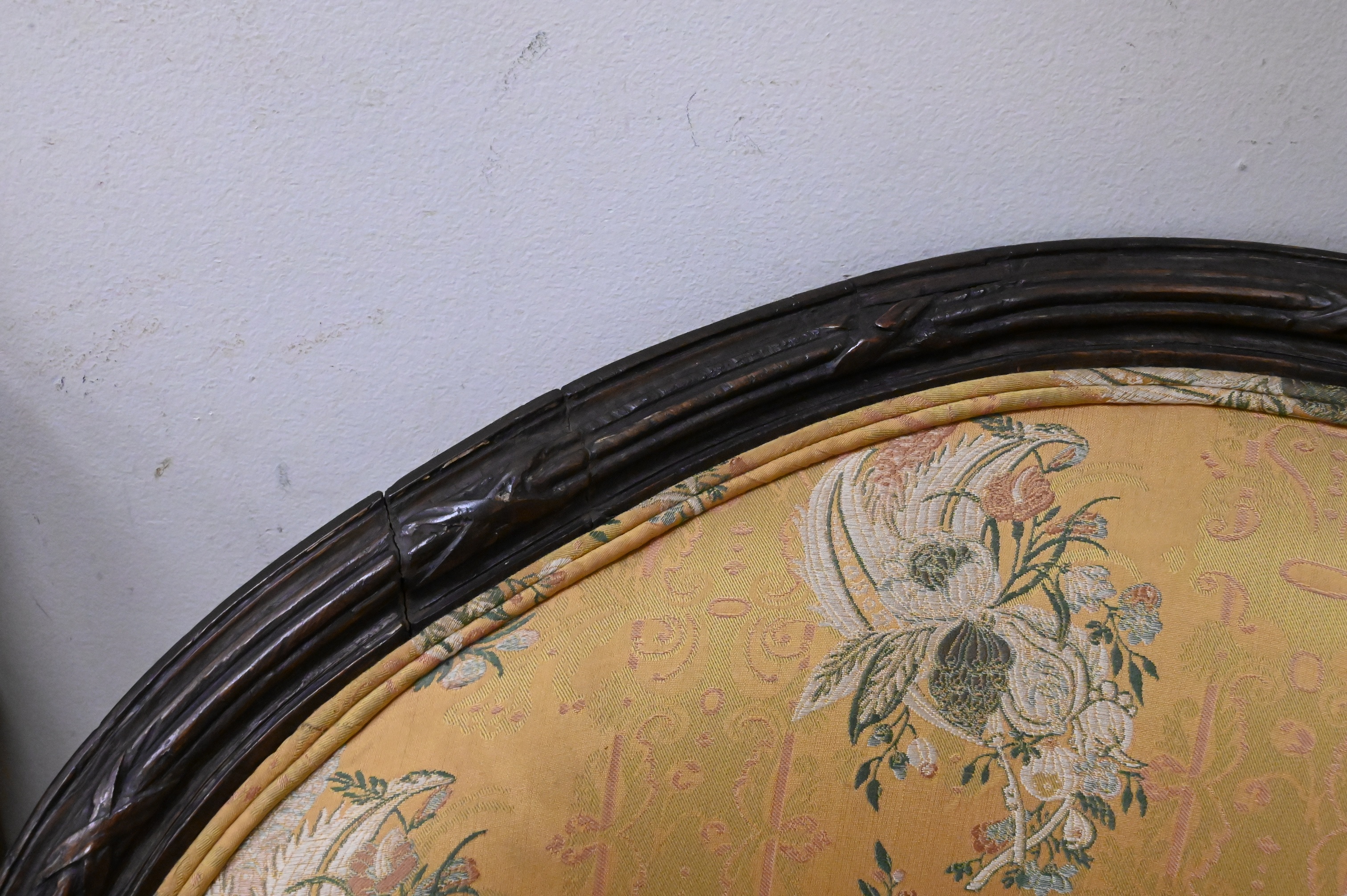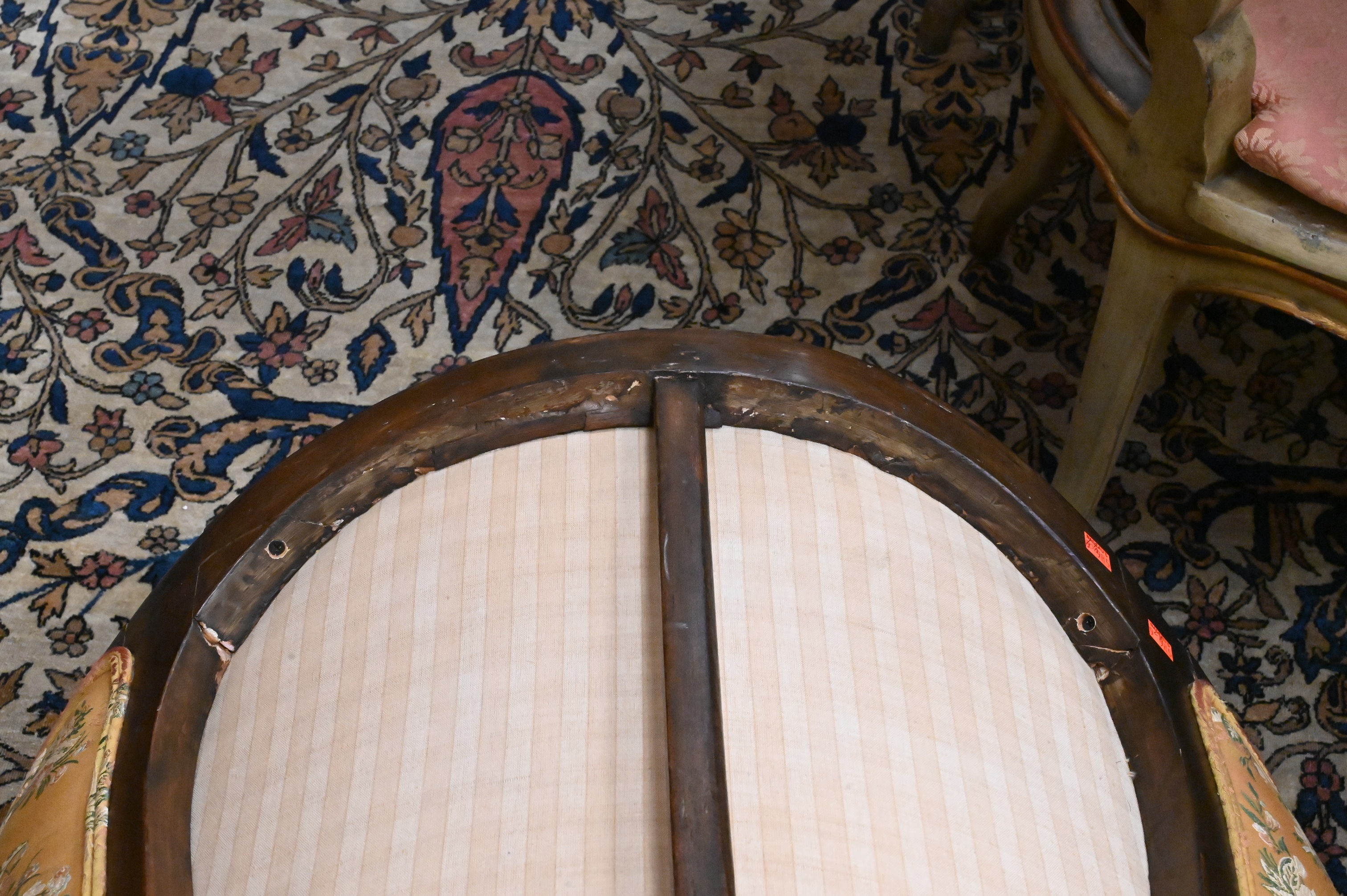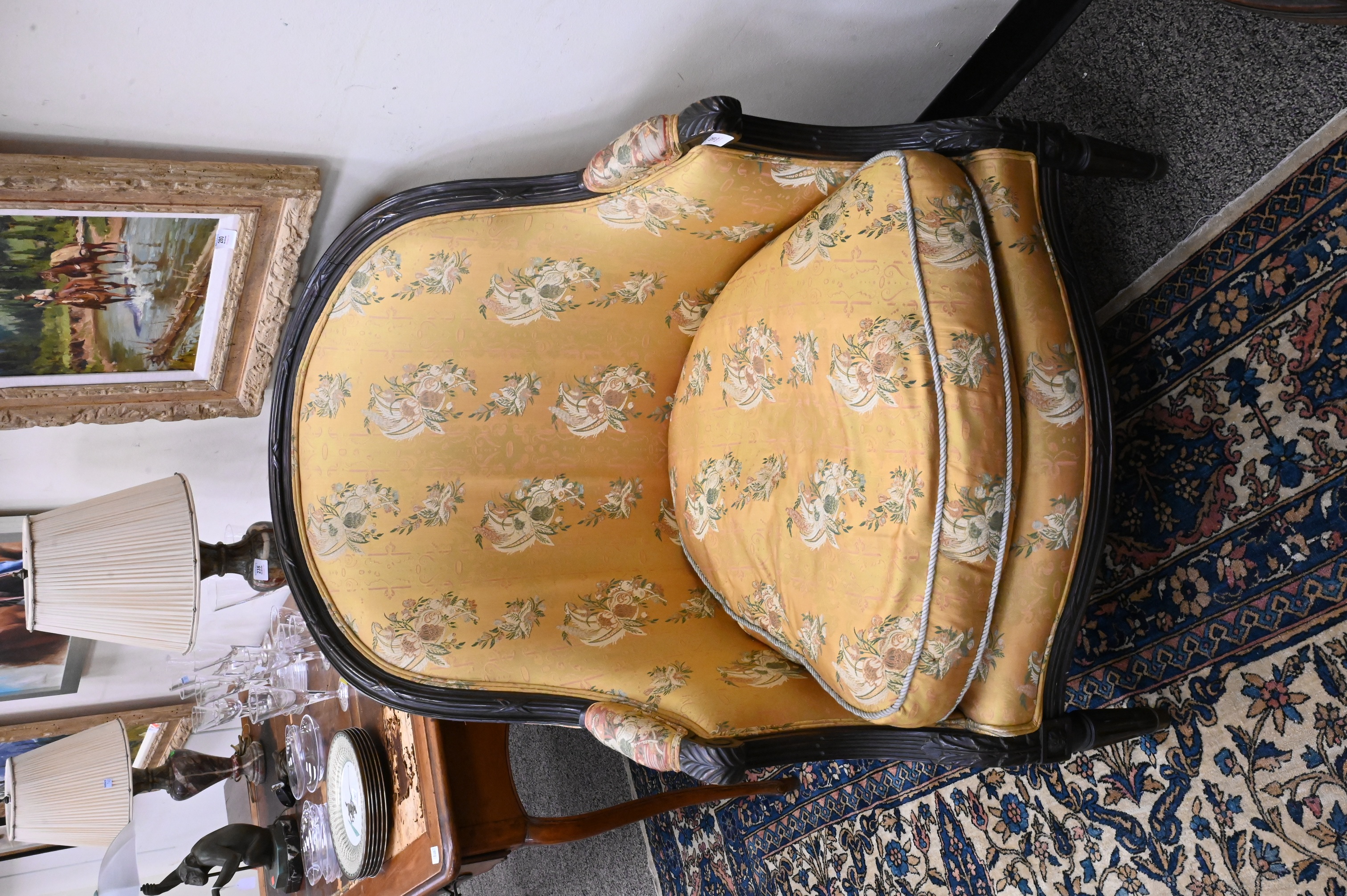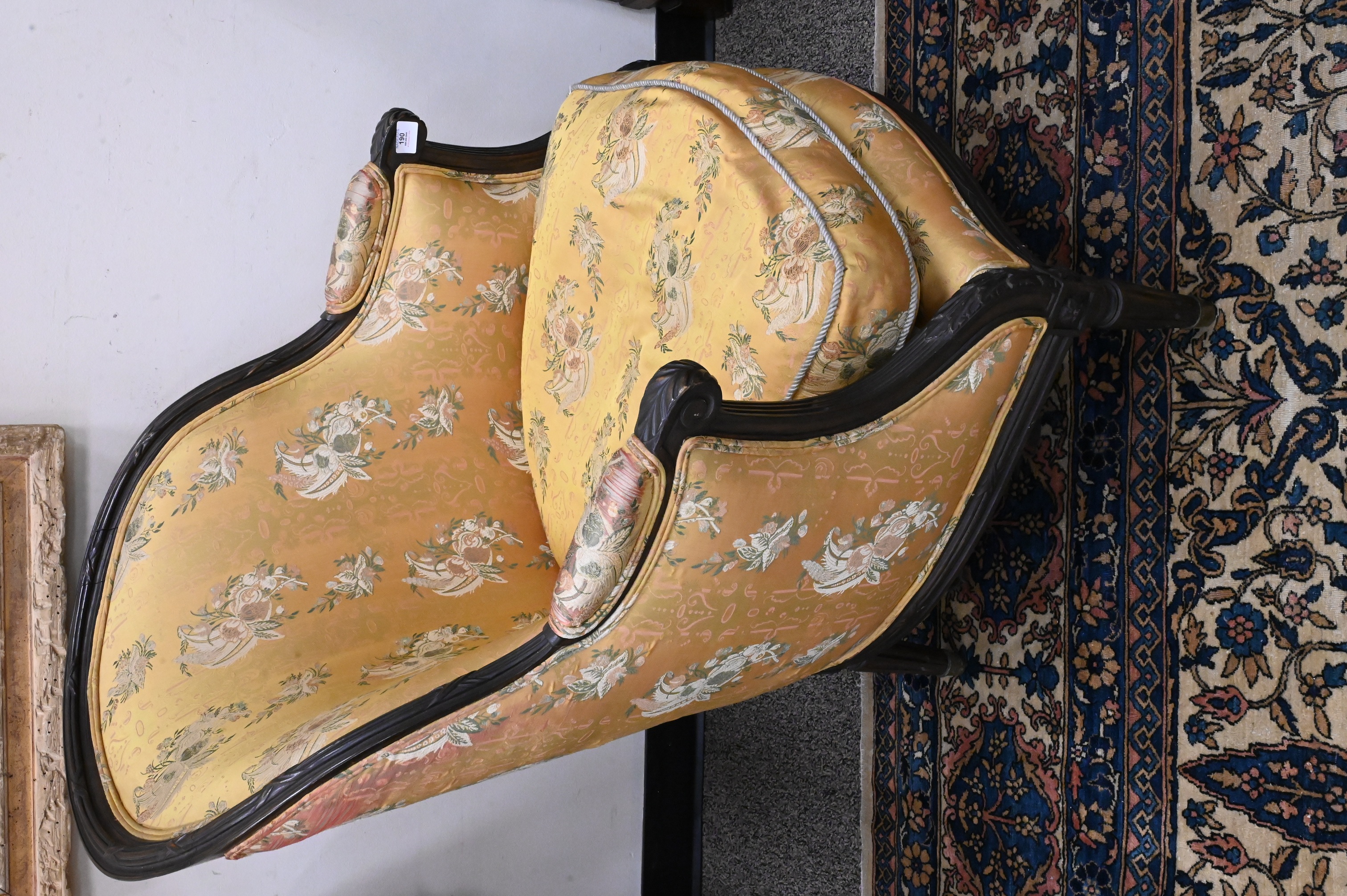 each with arched back, molded frame, and fluted legs, upholstered in yellow floral patterned silk with loose seat cushions and piped trim, the frames in dark painted finish with carved rosettes and foliate details, circa 1900