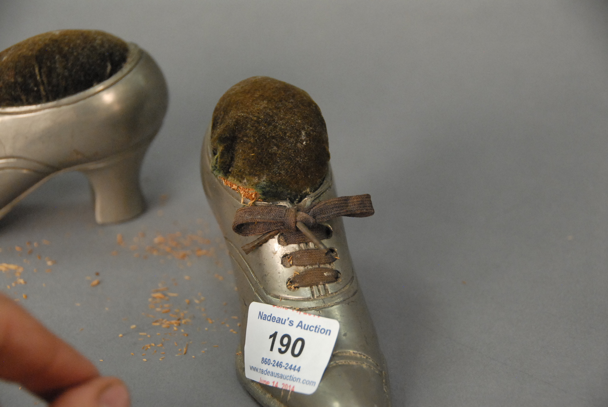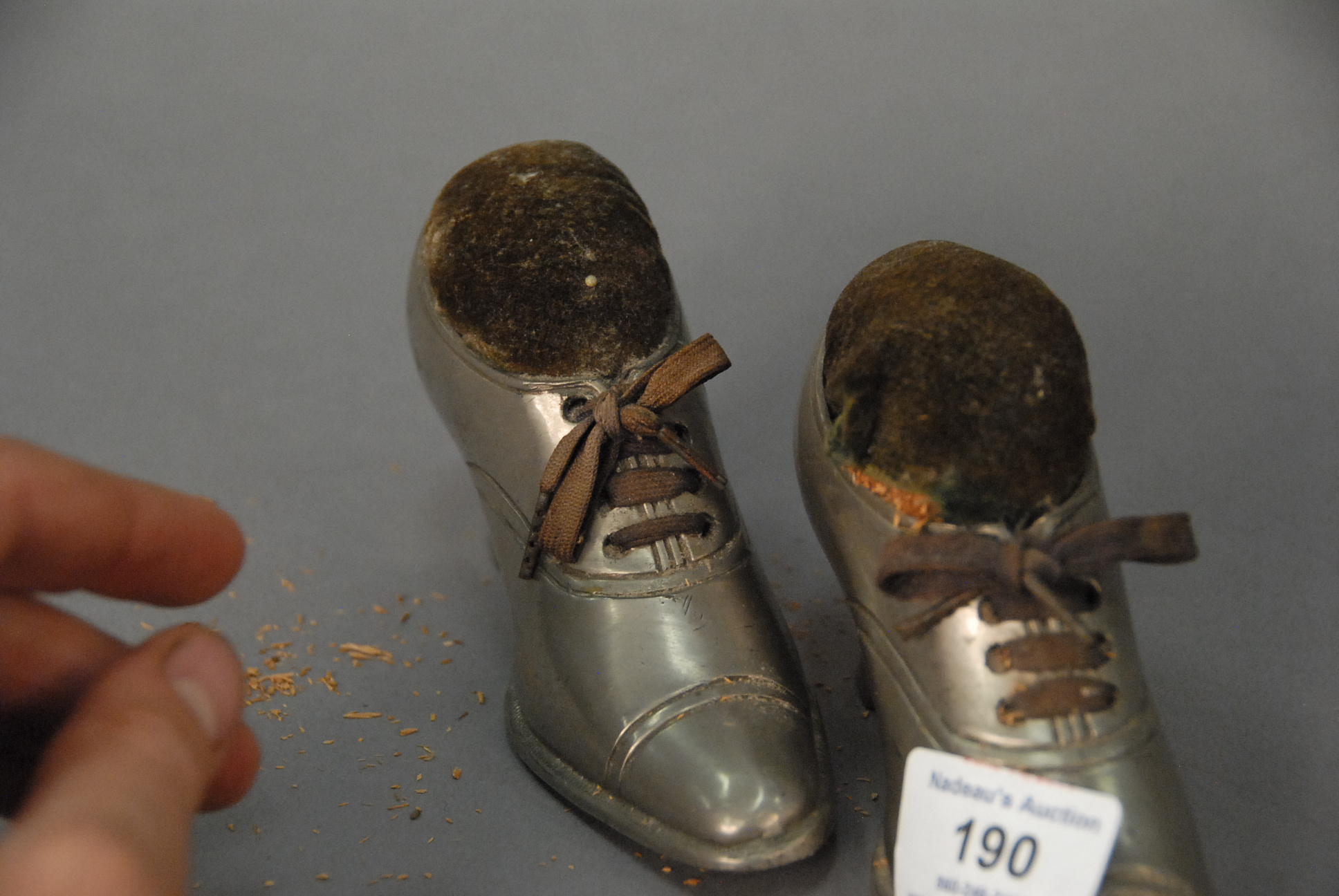 Pair of pewter shoe pin cushions, ht. 3 1/2in. lg. 6in.