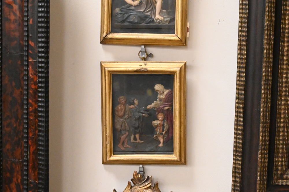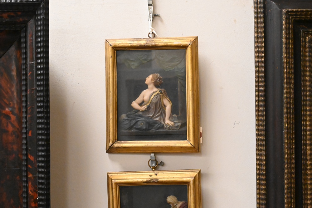 Lot 190: Pair of Wax Relief Plaques, offering with four figures and a classical partially clad figure of a woman stabbing herself, 18th century or later in shadow box frames, 7 3/4″ x 6″.